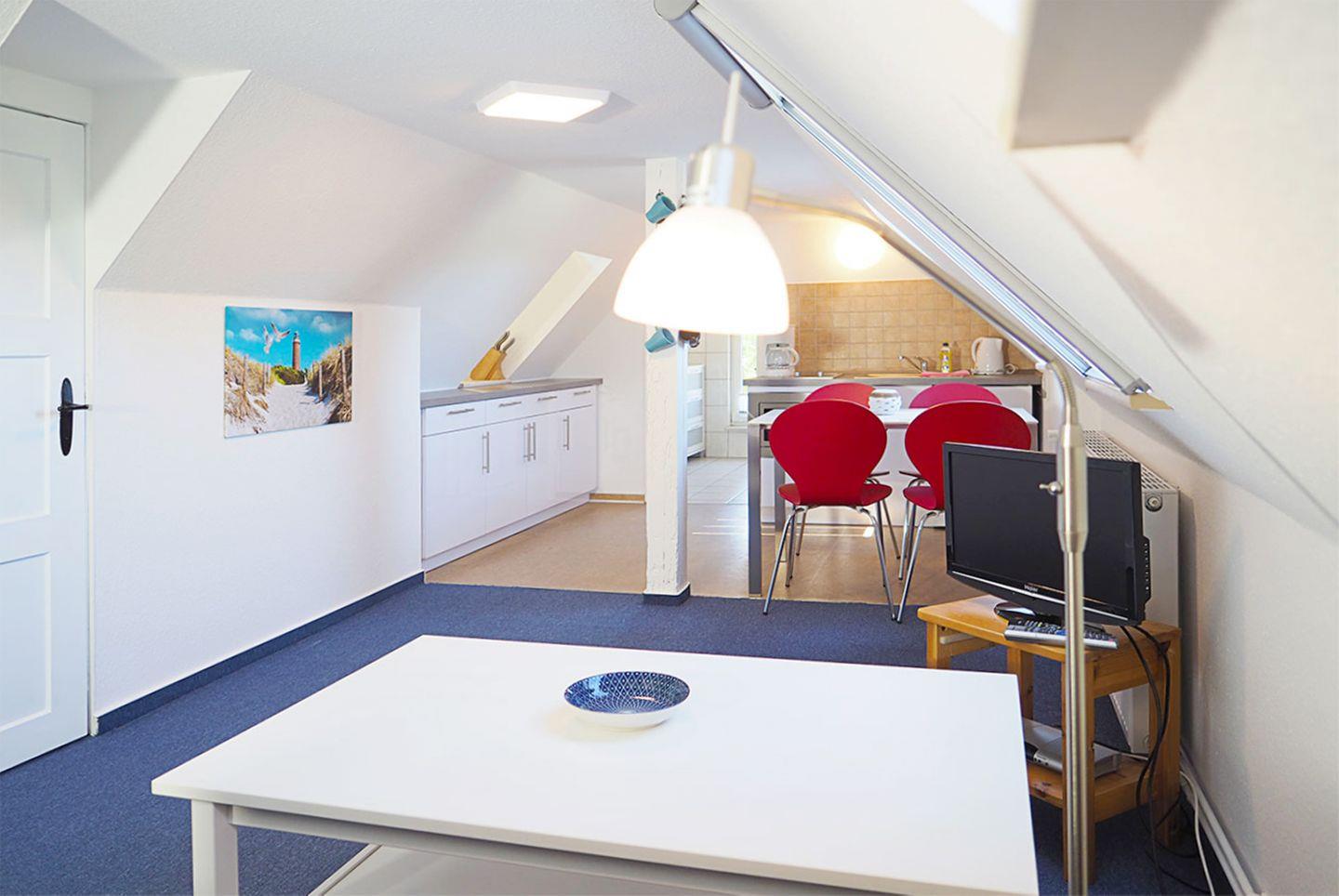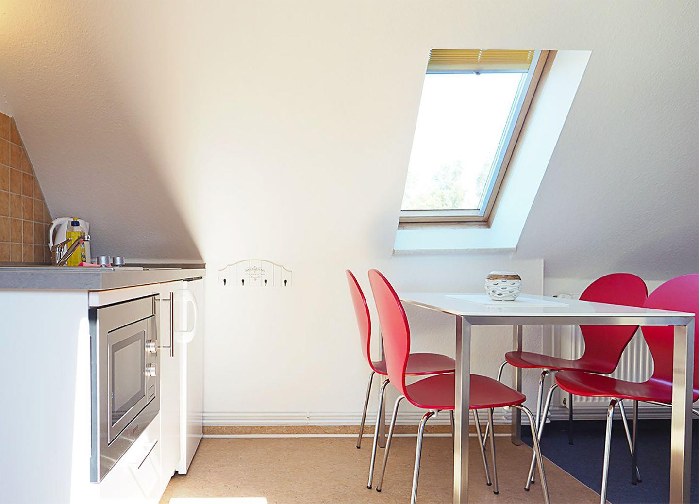 Diese gemütliche Ferienwohnung für bis zu 2 Personen erstreckt sich über ca. 44 m² und befindet sich in einem idyllischen Gebäude. Im Erdgeschoss gibt es einen Flur mit einer steilen Treppe, die zum Dachgeschoss führt. Dort erwartet Sie ein helles und einladendes Wohn-/Esszimmer mit einem Esstisch, Schlafsofa, TV (SAT/Kabel) und Radio mit CD-Player. Die Miniküche ist mit Kochfeldern, einem Mikrowellenofen mit Grill, Kaffeemaschine, Kühlschrank mit Gefrierfach, Toaster und Wasserkocher ausgestattet, sodass Sie sich bequem selbst versorgen können.