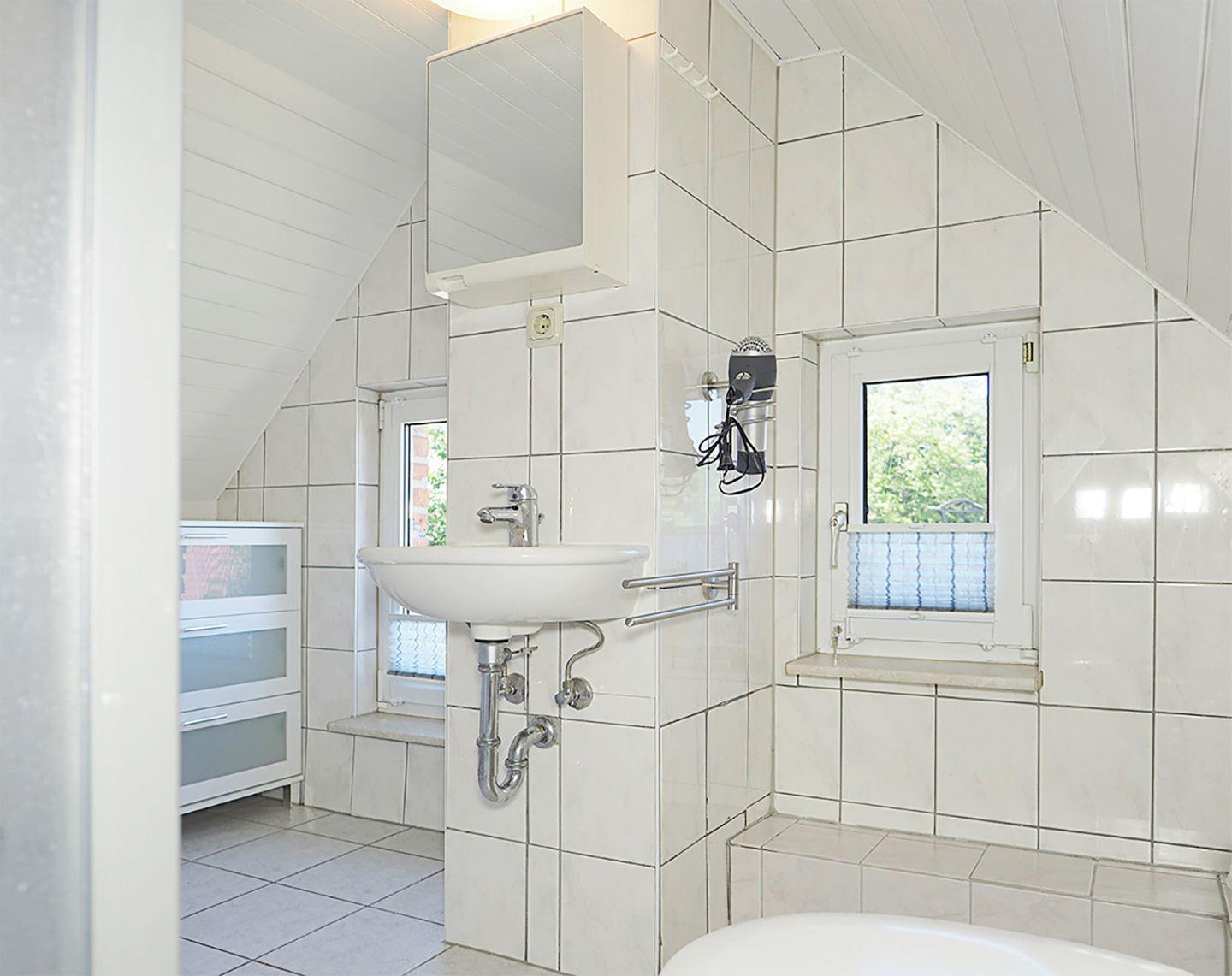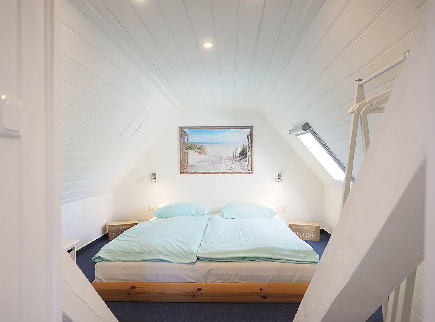 Im Spitzboden befindet sich das Schlafzimmer mit einem Doppelbett (160 x 200 cm), ideal für eine erholsame Nachtruhe. Das Badezimmer verfügt über eine Dusche und ein WC. Inklusive: Bettwäsche ab 7 Übernachtungen, WLAN (kostenfrei) und Gartenmöbel.
