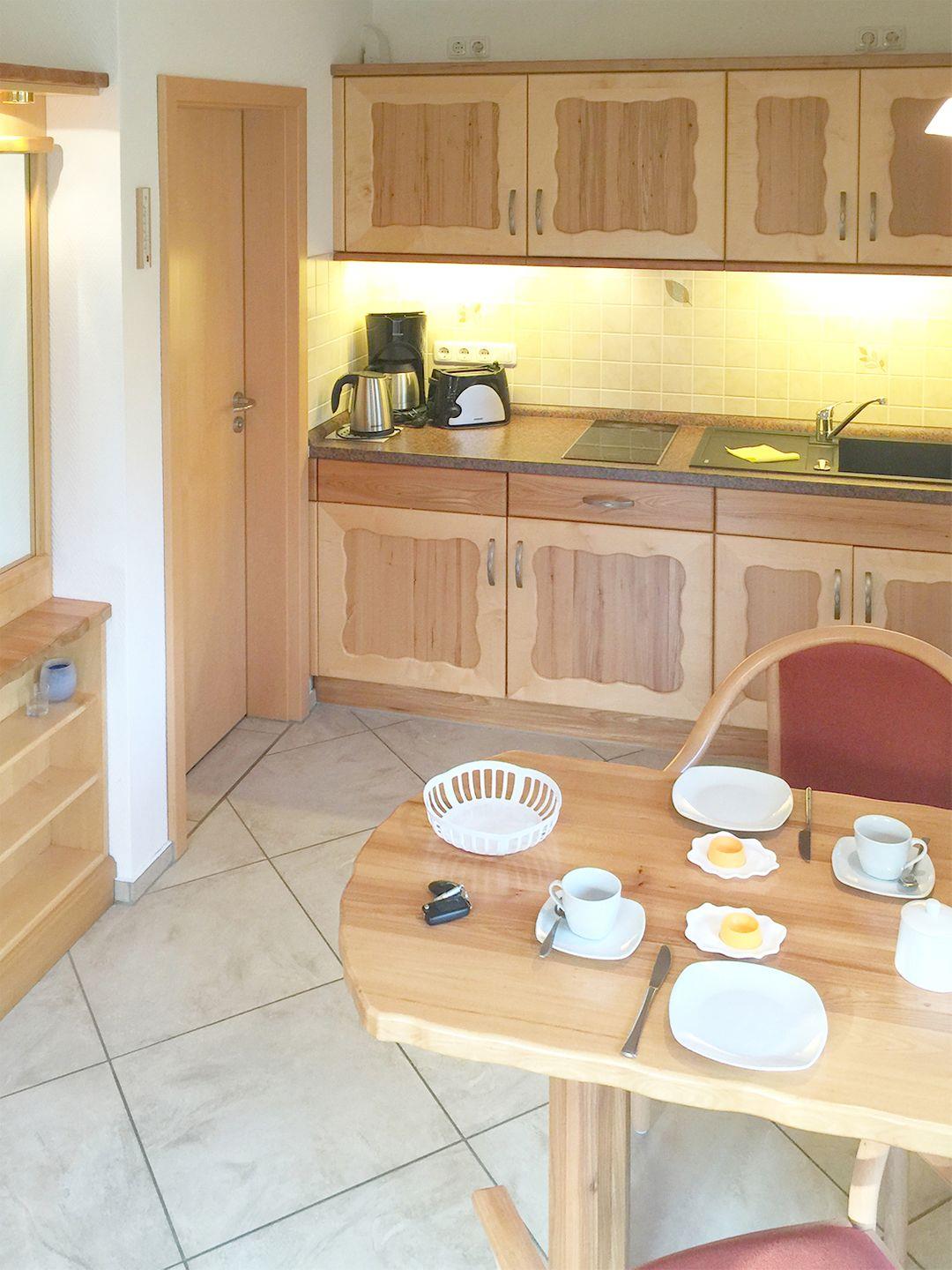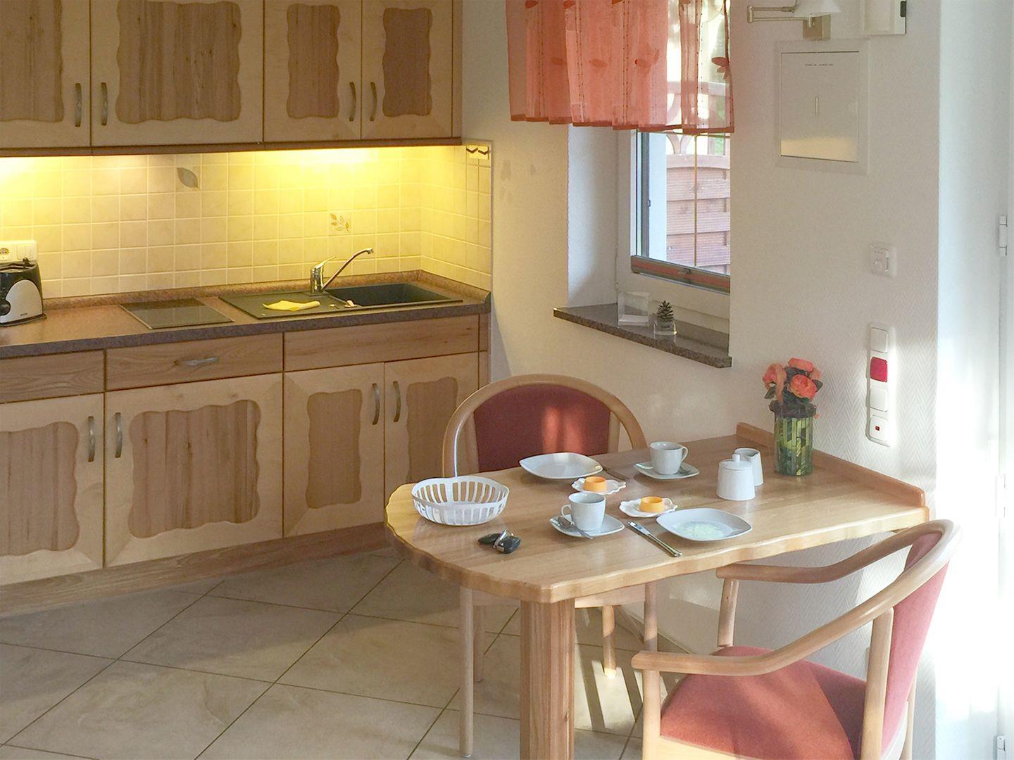 Apartment bis 2 Personen | Ca. 30 qm Wohnfläche | EG Wohn-/Schlafraum mit Küchenzeile, Bad, Terrasse | 1 Parkplatz | Wohn-/Schlafraum Esstisch, Schreibtisch, Flachbild-TV SAT/Kabel, 1 Doppelbett (180 x 200 cm) | Küchenzeile 2 Cerankochfelder, Gourmet-Express-Ofen, Dunstabzugshaube, Kaffeemaschine, Kühlschrank (ohne TK), Mikrowelle, Toaster, Wasserkocher | Bad Dusche, WC | Inkl. Fußbodenheizung, WLAN