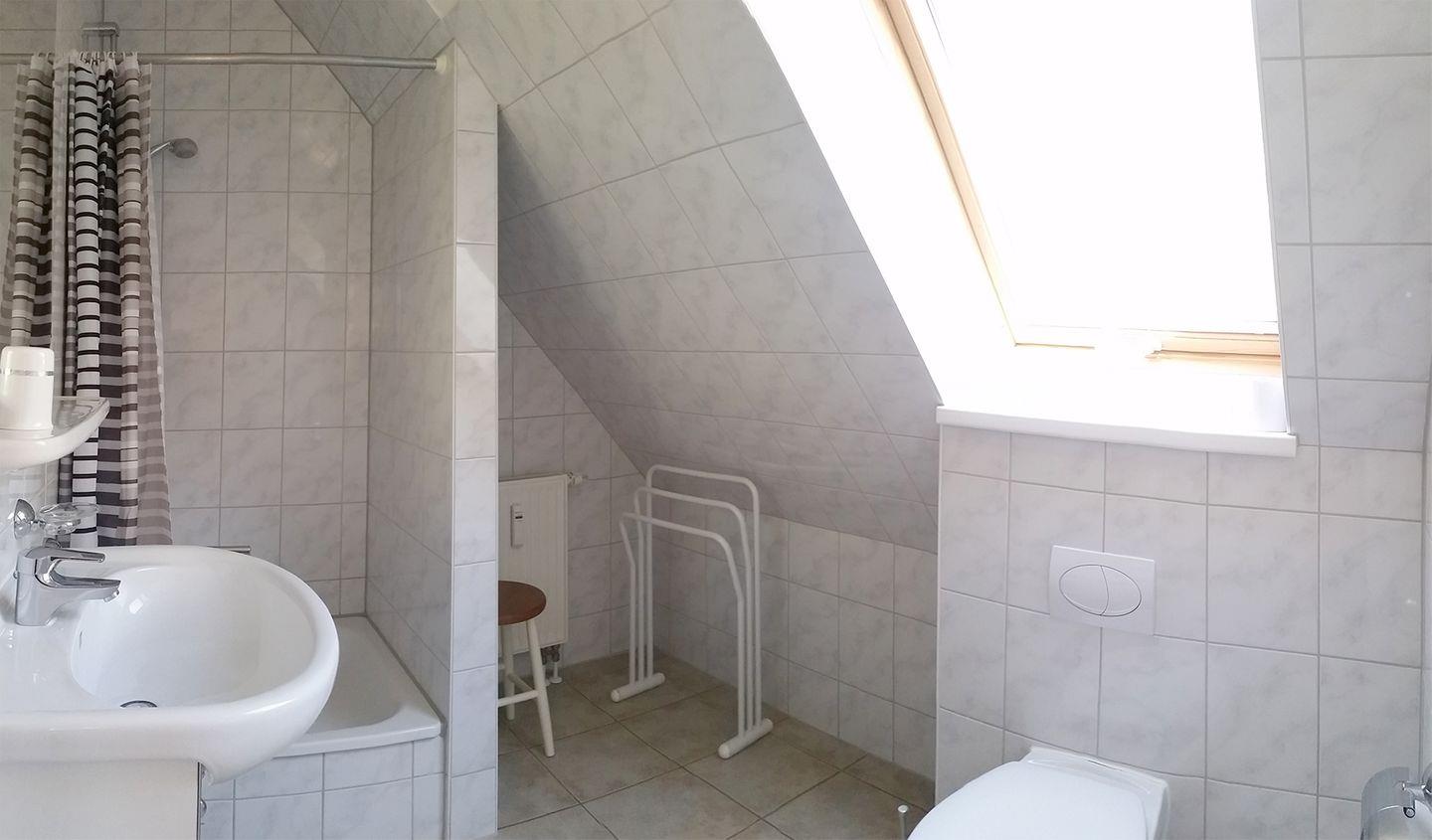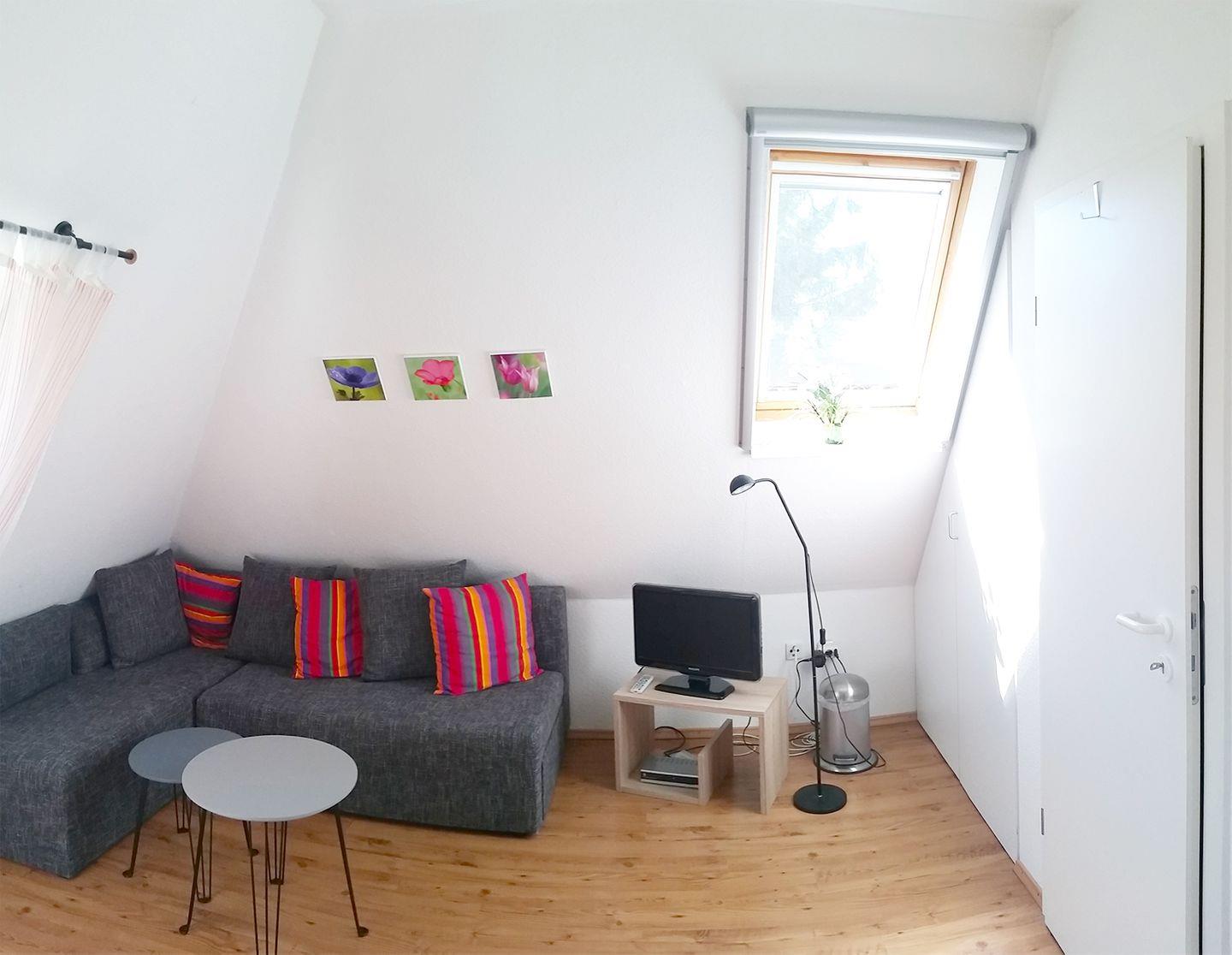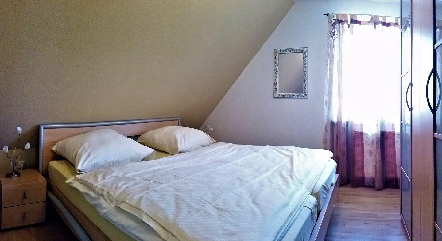 Eine Wendeltreppe führt ins Dachgeschoss, wo sich das zweite Bad mit Dusche und WC sowie ein weiteres Schlafzimmer befinden. Das zweite Schlafzimmer im Dachgeschoss besitzt ein weiteres Doppelbett (180 x 200 cm) sowie ein Schlafsofa (120 x 200 cm). Die Wohnung bietet zudem einen Süd-West-Balkon, auf dem Sie die Sonne genießen können sowie zwei Parkplätze direkt am Haus. WLAN steht Ihnen selbstverständlich kostenfrei zur Verfügung.