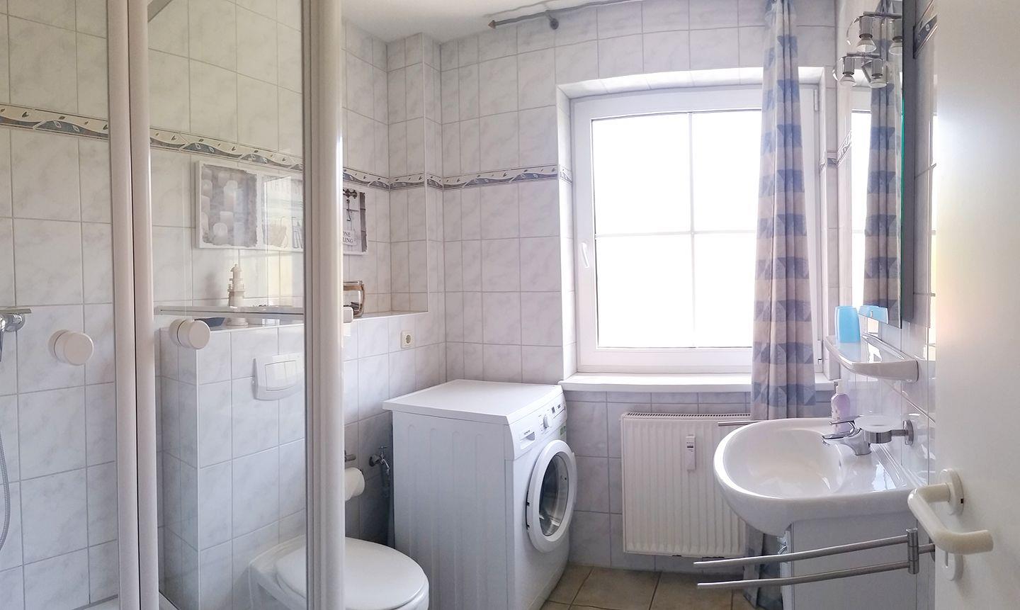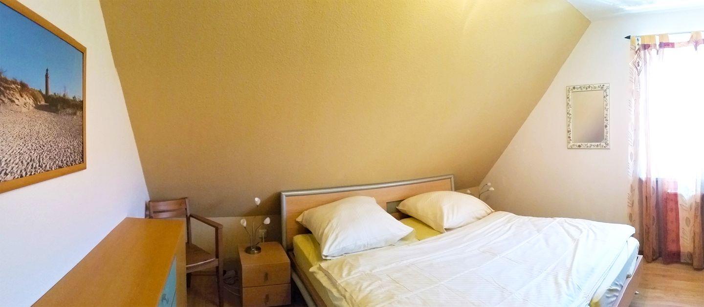 Im Obergeschoss befindet sich außerdem ein Schlafzimmer mit einem Doppelbett (180 x 200 cm) sowie ein Bad mit Dusche, Waschmaschine und WC.