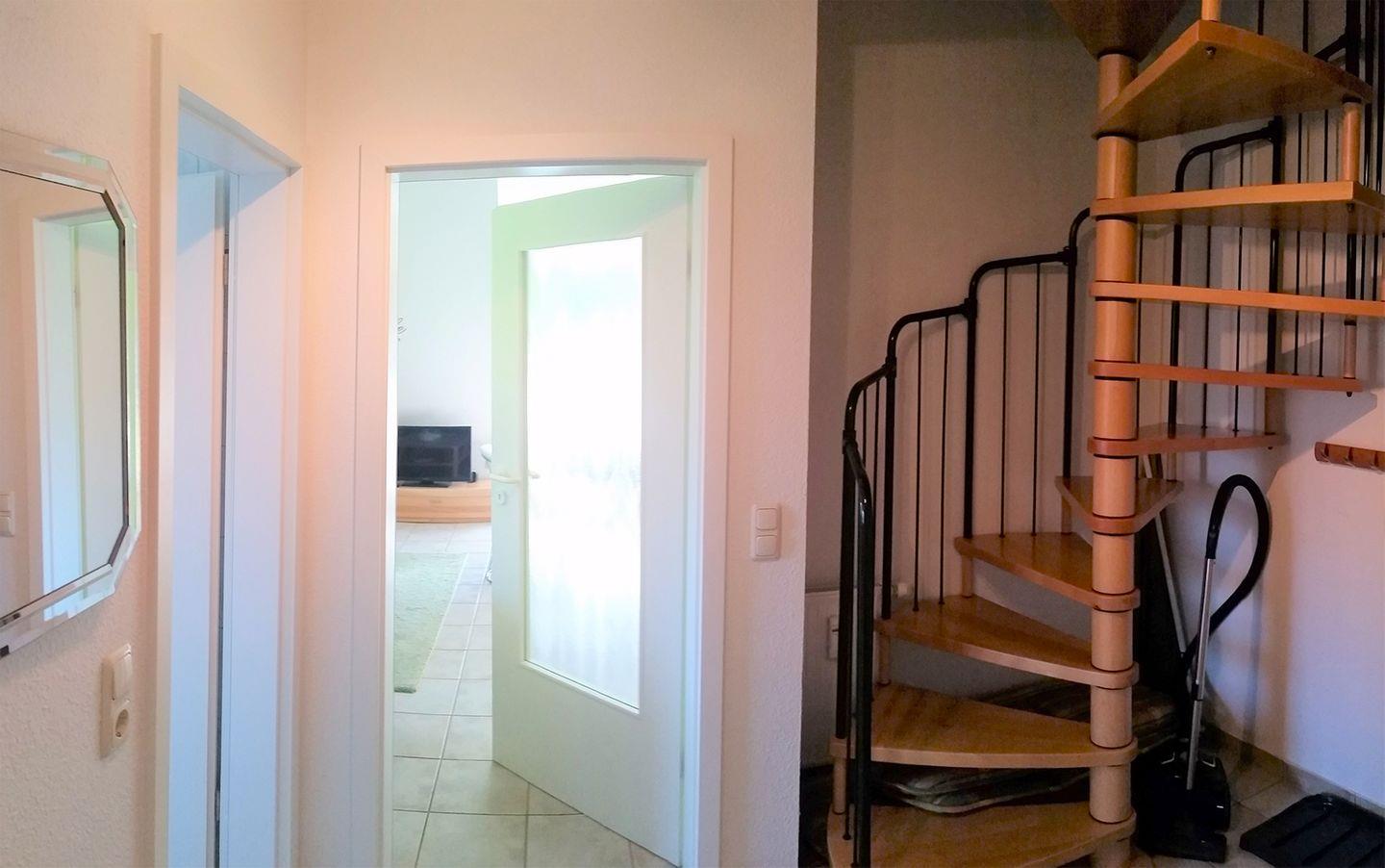 Ferienwohnung bis 5 Personen | ca. 70 m2 Wohnfläche | OG Wohnbereich mit Einbauküche, Bad, 1 Schlafzimmer | DG Bad, 1 Schlafzimmer (Wendeltreppe) | Süd-West-Balkon | 2 Parkplätze | Wohnbereich Esstisch, Sitzgarnitur, Radio mit CD-Player, TV SAT/Kabel | Einbauküche Backofen, Geschirrspüler, Herd, Kaffeemaschine, Kühlschrank mit Gefrierfach, Mikrowelle, Toaster, Wasserkocher | 2 Bäder Dusche, Waschmaschine, WC im OG | Dusche, WC im DG | 2 Schlafzimmer 1 Doppelbett (180 x 200 cm) im OG | 1 Doppelbett (180 x 200 cm), 1 Schlafsofa (120 x 200 cm) im DG | WLAN | Gemeinschaftliche Nutzung von Fahrradschuppen