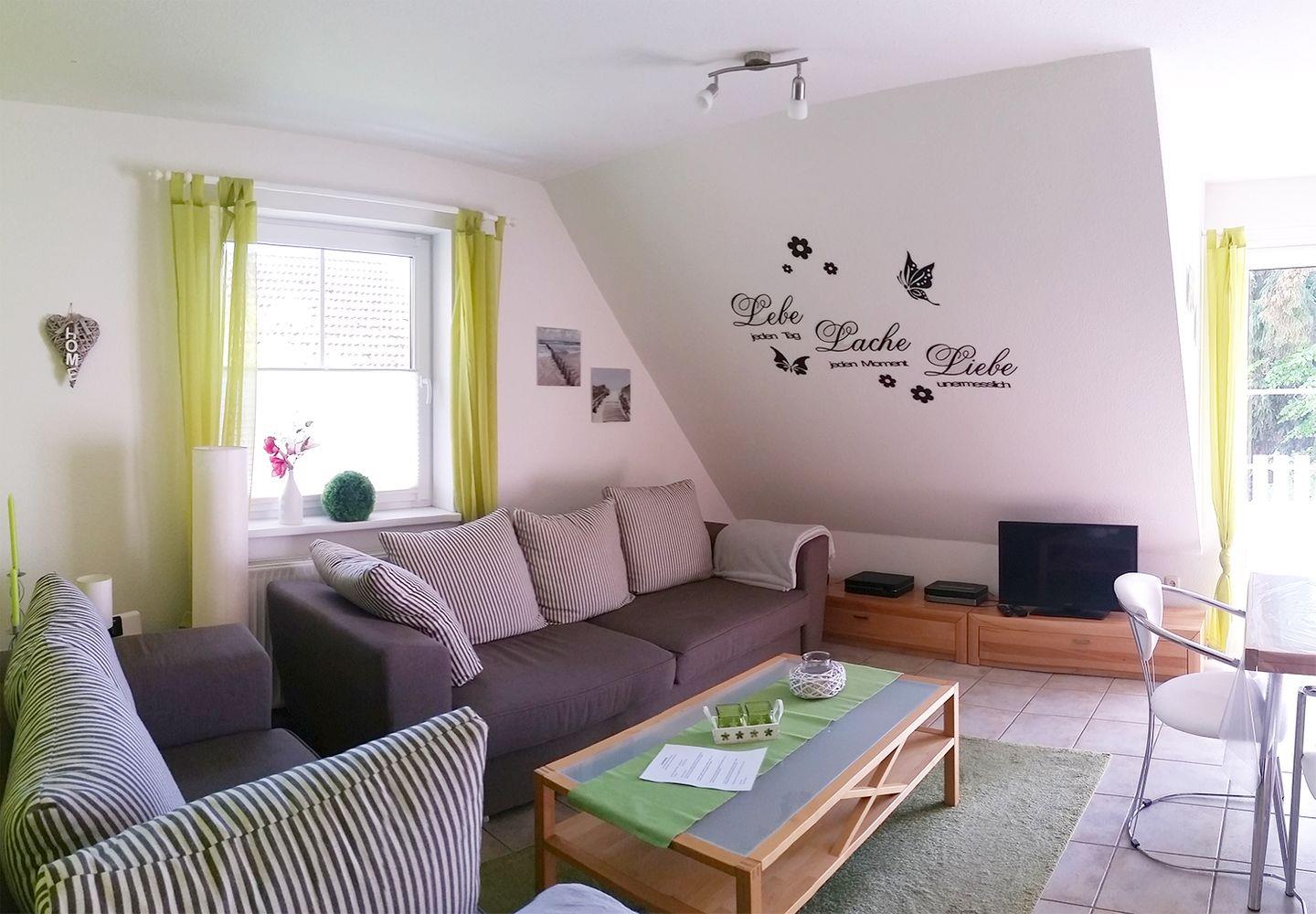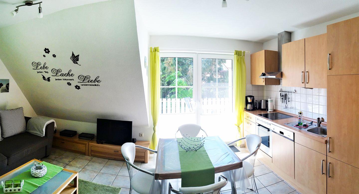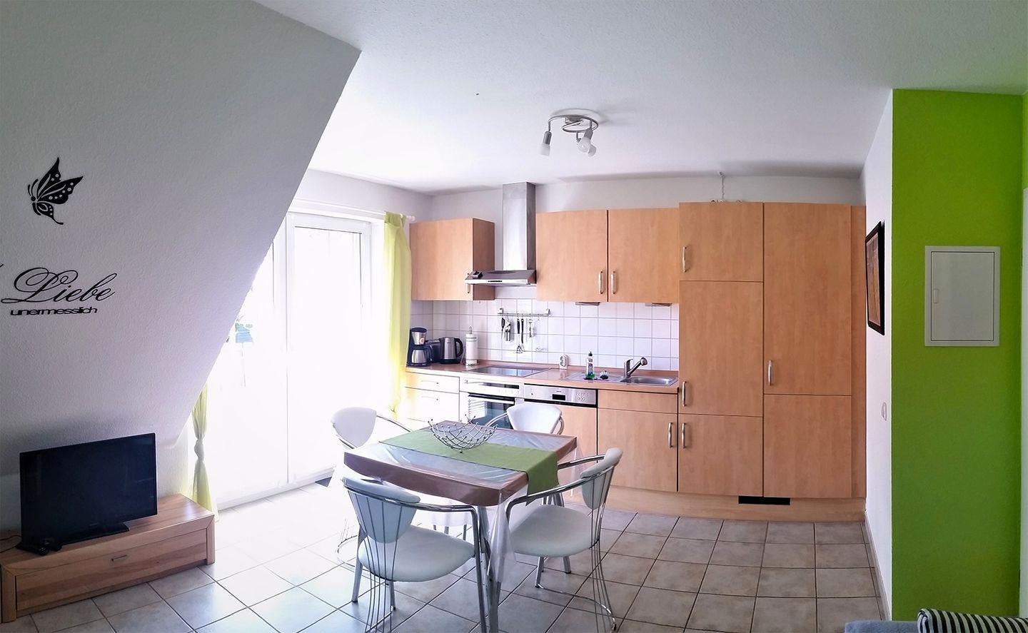 Diese einladende Ferienwohnung für bis zu 5 Personen erstreckt sich über ca. 70 m² und befindet sich im Ober- und Dachgeschoss eines gepflegten Hauses. Der Wohnbereich im Obergeschoss ist mit einer gemütlichen Sitzgarnitur, einem Esstisch, einem Radio mit CD-Player und einem TV (SAT/Kabel) ausgestattet. Die moderne Einbauküche lässt keine Wünsche offen: Sie ist mit einem Herd, Backofen, Geschirrspüler, Mikrowelle, Kühlschrank mit Gefrierfach, Kaffeemaschine, Toaster und Wasserkocher bestens ausgestattet.