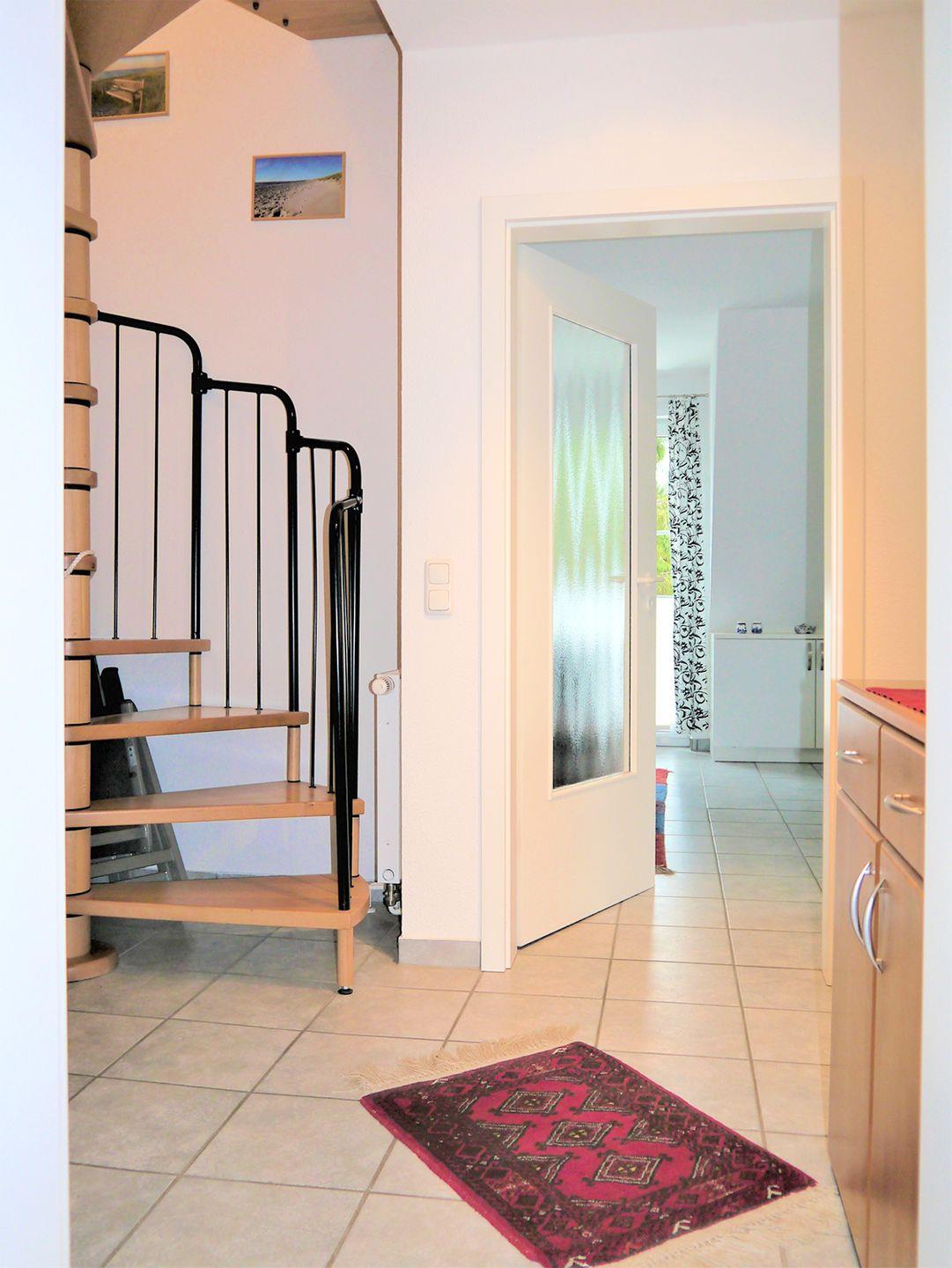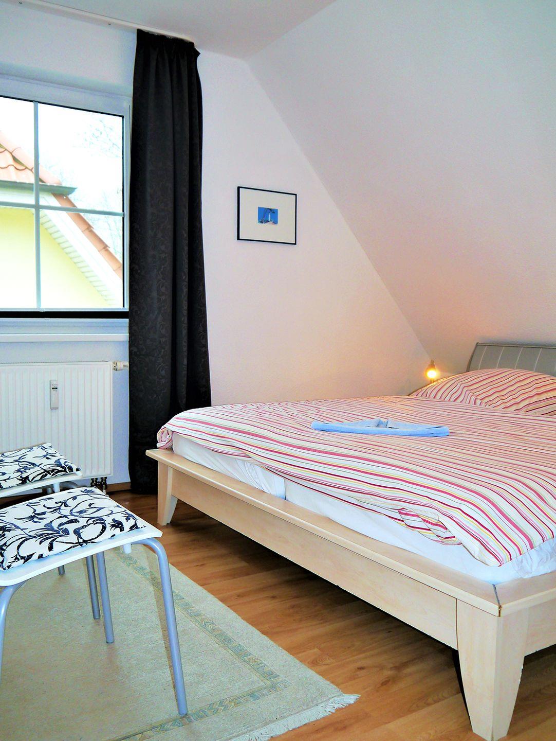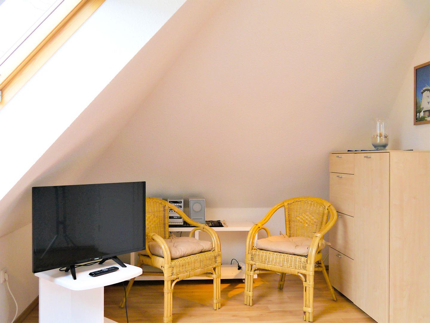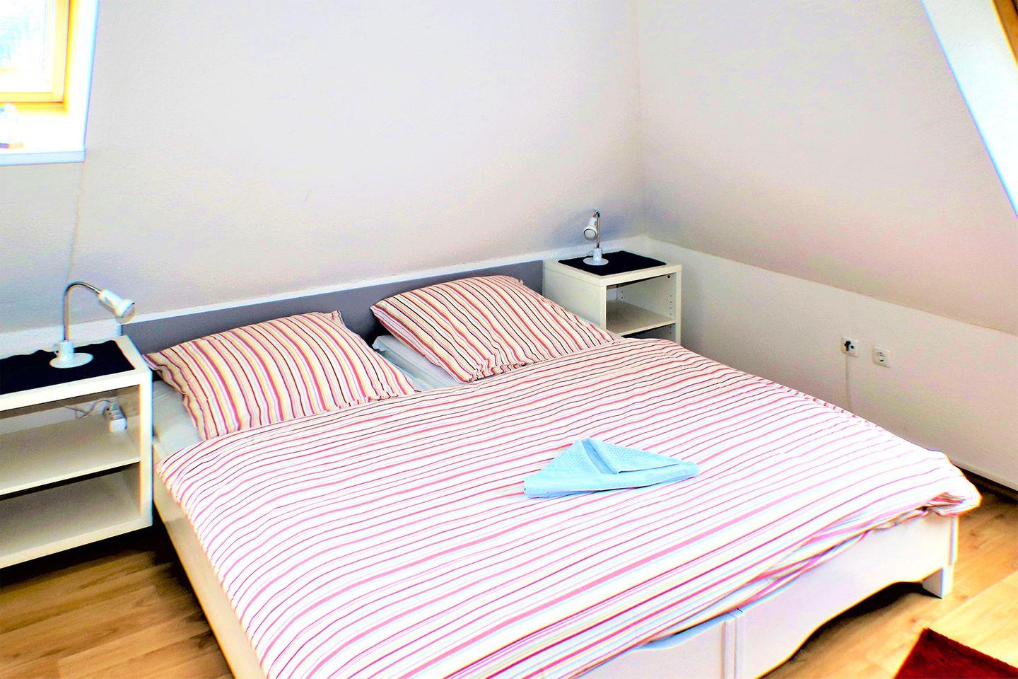 Eine Wendeltreppe führt ins Dachgeschoss, wo sich das zweite Bad sowie ein weiteres Schlafzimmer befinden. Dieses bietet ebenfalls ein Doppelbett (180 x 200 cm) sowie einen TV (SAT/Kabel) für zusätzlichen Komfort. Ein Süd-West-Balkon lädt zum Entspannen und Genießen der Sonne ein. Ein Parkplatz direkt vor dem Haus ist ebenfalls vorhanden. WLAN steht Ihnen in der gesamten Wohnung kostenfrei zur Verfügung. Die Wohnung eignet sich ideal für Familien oder Paare, die eine gut ausgestattete und ruhige Unterkunft suchen. Ein Kinderhochstuhl ist ebenfalls vorhanden und zur gemeinschaftlichen Nutzung steht ein Fahrradschuppen zur Verfügung. Bettwäsche ist im Preis inbegriffen.