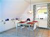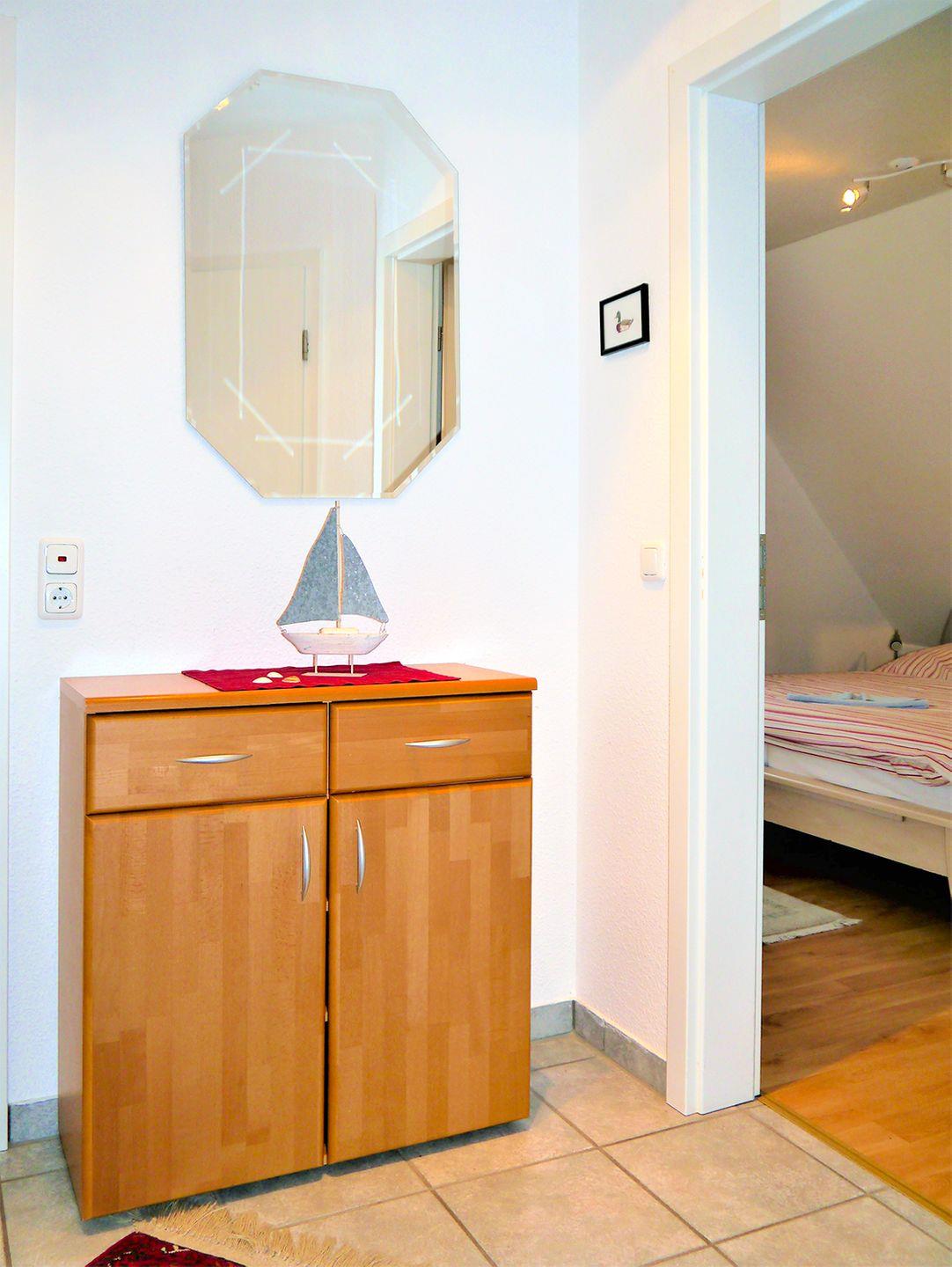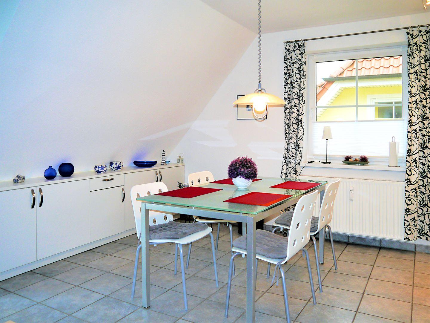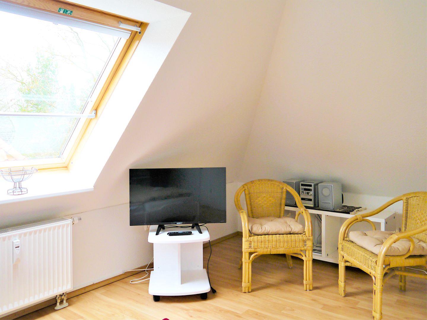 Diese großzügige Ferienwohnung für bis zu 4 Personen bietet auf ca. 70 m² eine komfortable Unterkunft auf zwei Etagen. Im Obergeschoss befinden sich der gemütliche Wohnbereich mit Esstisch, Sitzgarnitur, Radio mit CD/DVD-Player und einem TV (SAT/Kabel). Die moderne Einbauküche ist mit einem Herd, Backofen, Geschirrspüler, Mikrowelle, Kühlschrank mit Gefrierfach, Kaffeemaschine, Toaster und Wasserkocher bestens ausgestattet – ideal für die Zubereitung von Mahlzeiten. Das erste Schlafzimmer ist mit einem Doppelbett (180 x 200 cm) ausgestattet. Das Badezimmer im Obergeschoss verfügt über eine Dusche, WC und eine Waschmaschine.