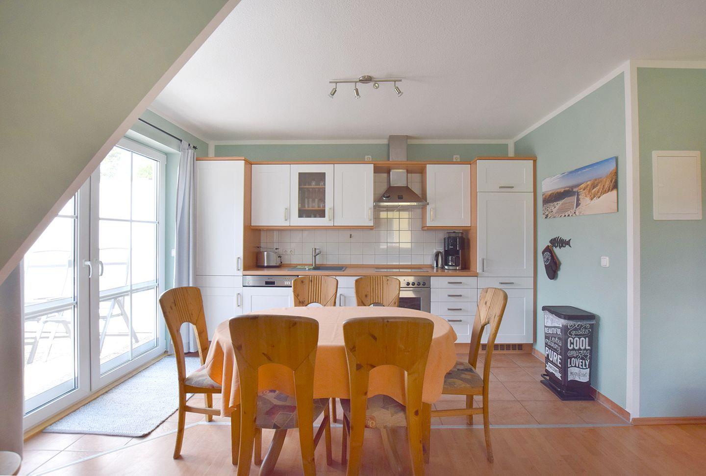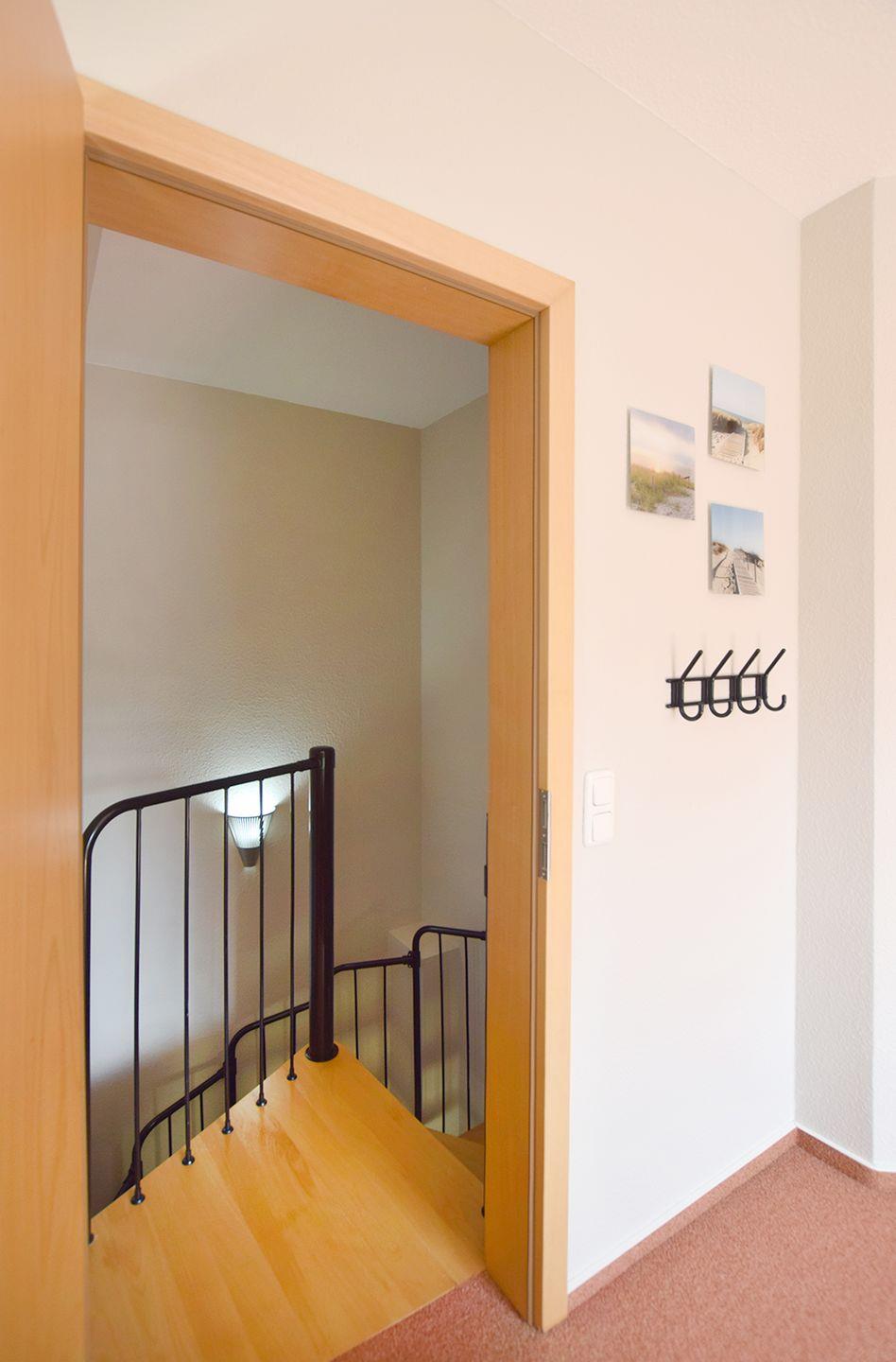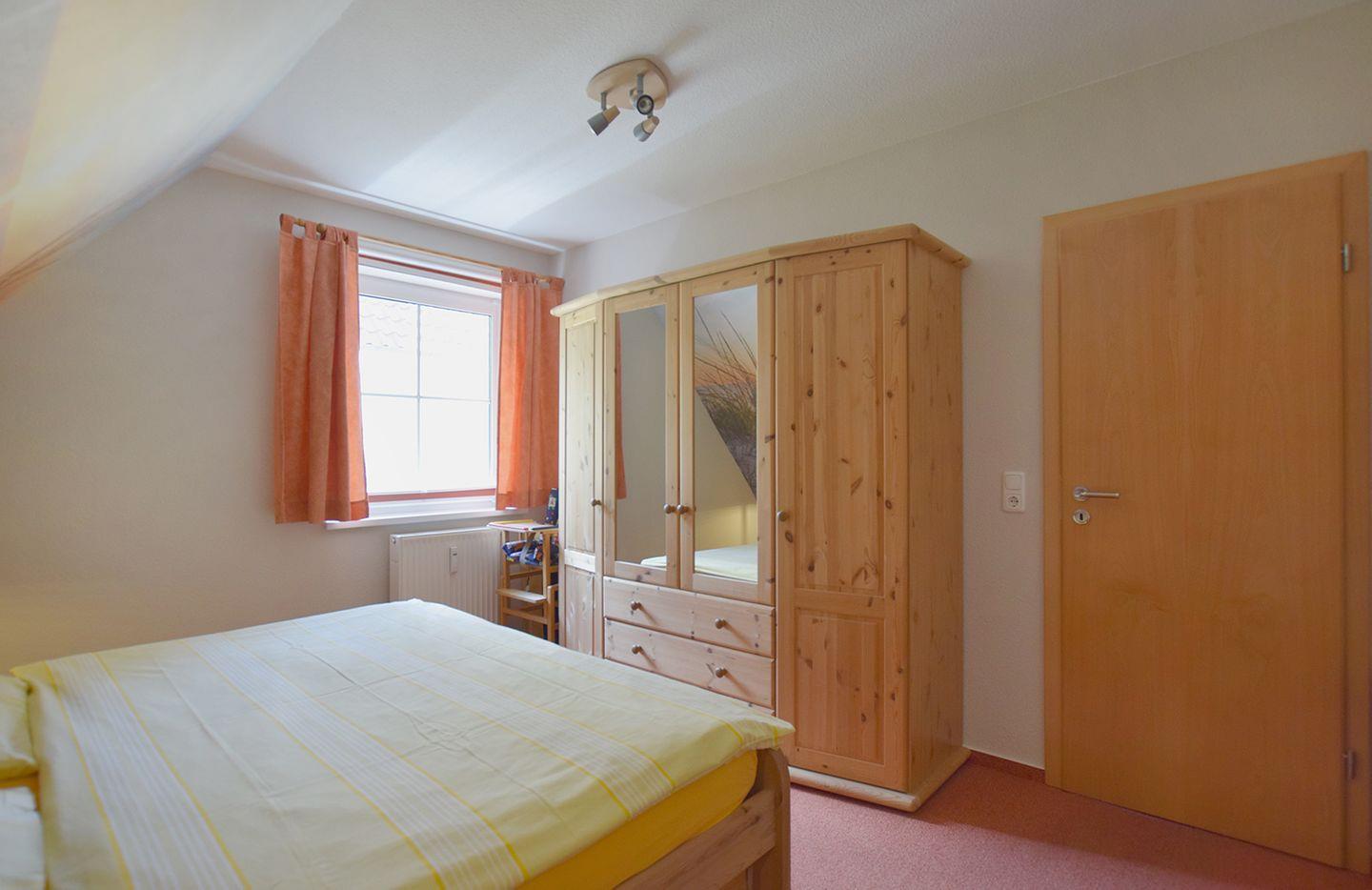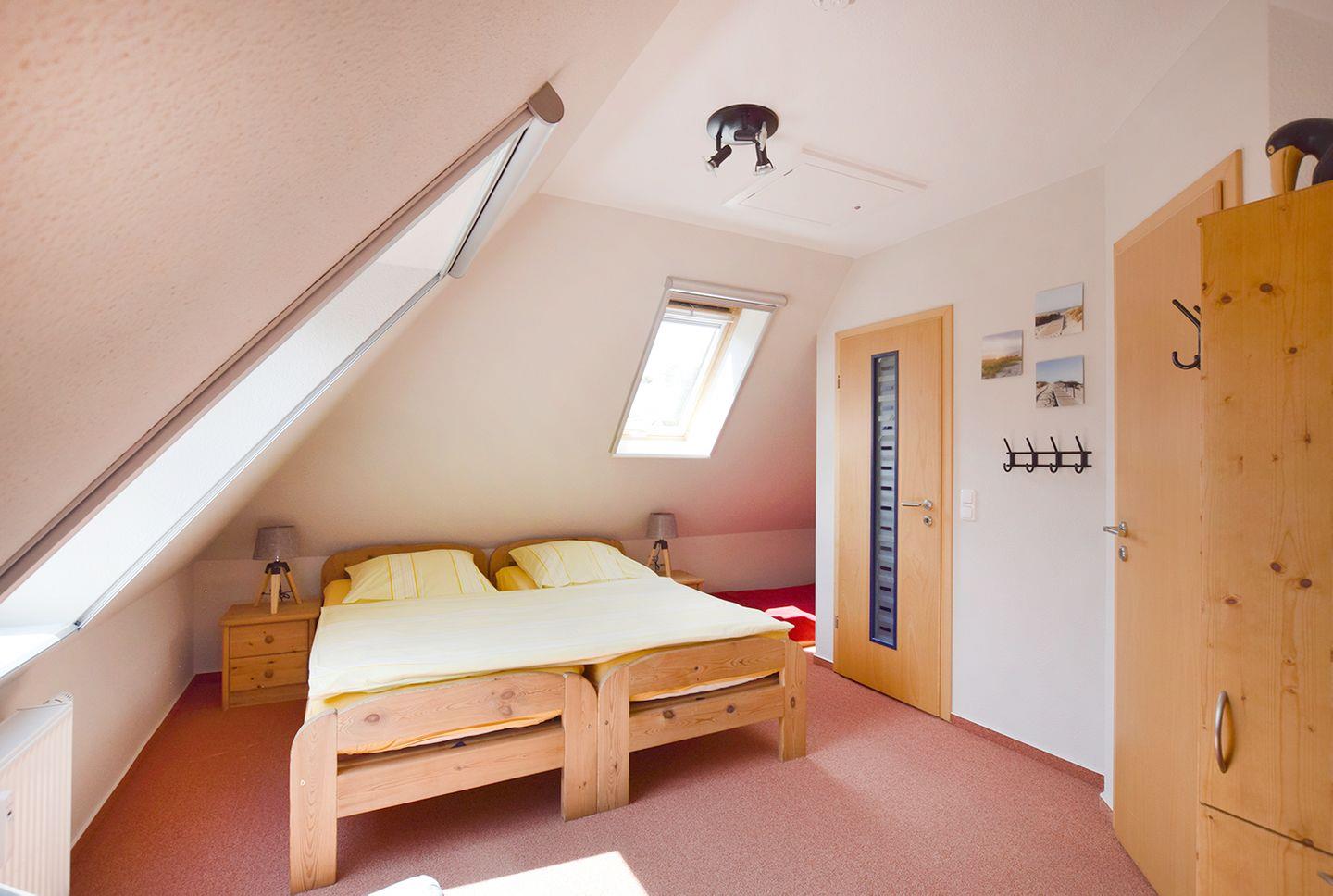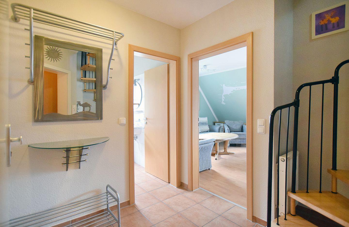 Diese großzügige Ferienwohnung für bis zu 5 Personen (4 Erwachsene + 1 Kind bis 8 Jahre) bietet auf ca. 70 m² eine komfortable und gut ausgestattete Unterkunft auf zwei Etagen. Im Obergeschoss erwartet Sie ein gemütlicher Wohnbereich mit Esstisch, Sitzgarnitur, TV (SAT/Kabel) und einem Radio mit CD-Player. Die moderne Einbauküche ist mit einem Herd, Backofen, Geschirrspüler, Mikrowelle, Kühlschrank mit Gefrierfach, Kaffeemaschine, Toaster und Wasserkocher perfekt ausgestattet, um eigene Mahlzeiten zuzubereiten. Im Obergeschoss befindet sich auch ein Badezimmer mit Dusche, Waschmaschine und WC. Über eine Wendeltreppe gelangen Sie ins Dachgeschoss, wo sich das zweite Badezimmer mit Dusche und WC sowie zwei Schlafzimmer befinden. Das erste Schlafzimmer im Dachgeschoss ist mit einem Doppelbett (180 x 200 cm) ausgestattet, das zweite Schlafzimmer