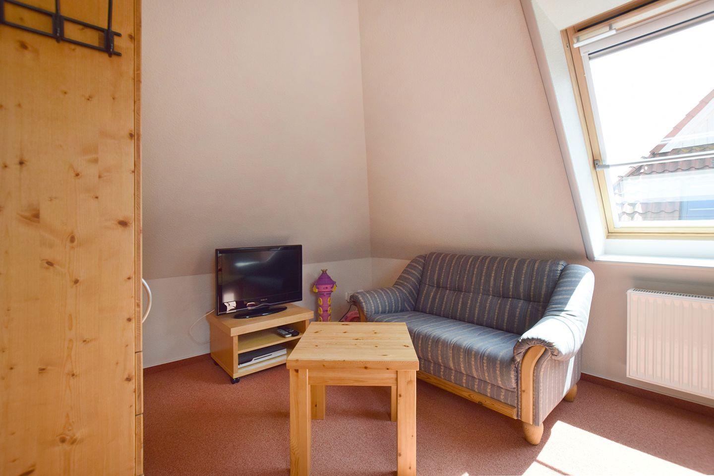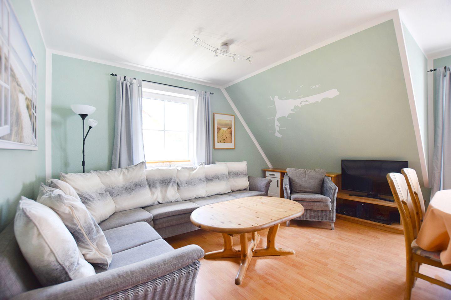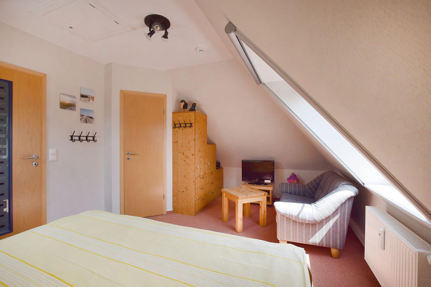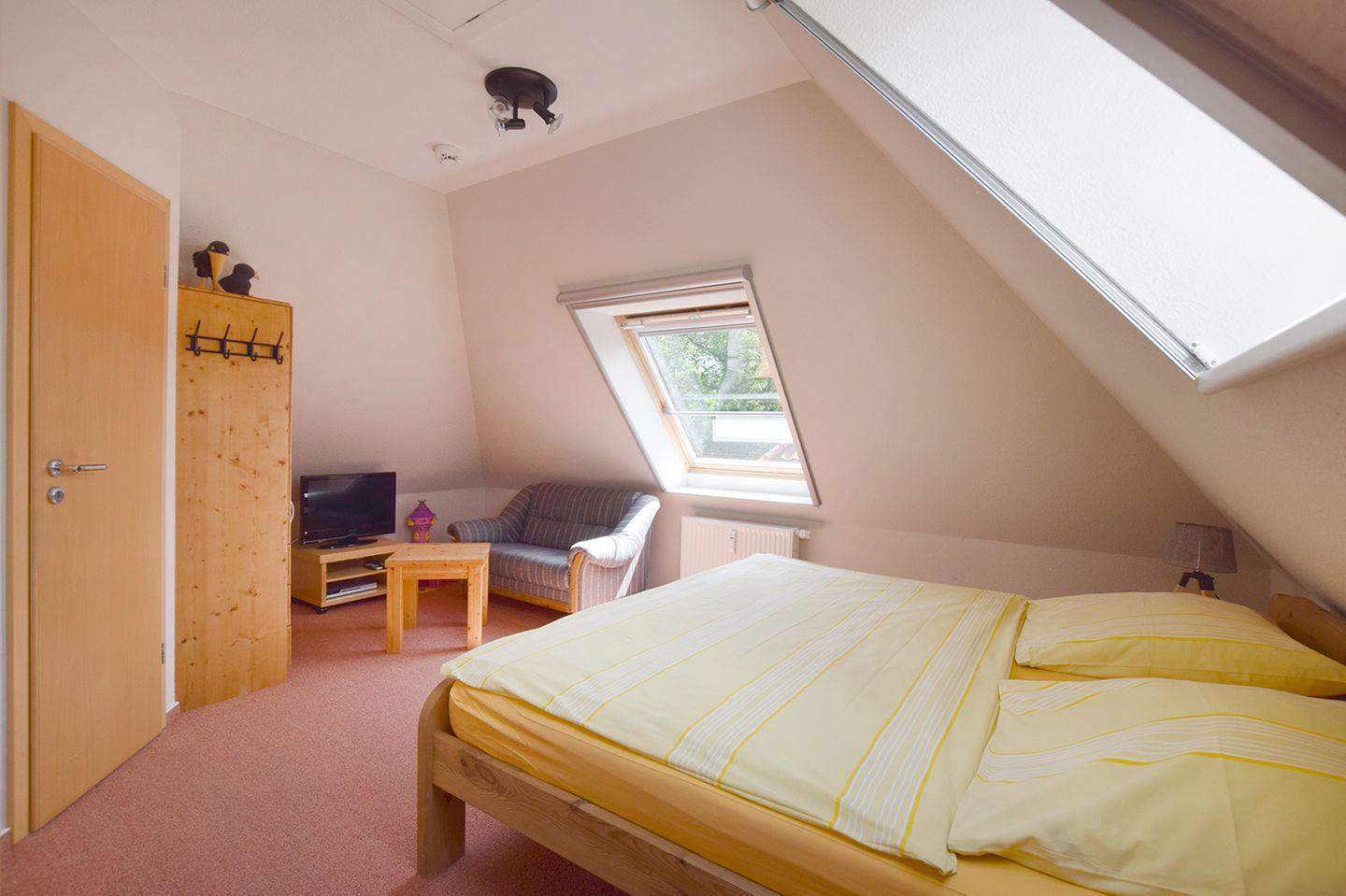 Diese großzügige Ferienwohnung für bis zu 5 Personen (4 Erwachsene + 1 Kind bis 8 Jahre) bietet auf ca. 70 m² eine komfortable und gut ausgestattete Unterkunft auf zwei Etagen. Im Obergeschoss erwartet Sie ein gemütlicher Wohnbereich mit Esstisch, Sitzgarnitur, TV (SAT/Kabel) und einem Radio mit CD-Player. Die moderne Einbauküche ist mit einem Herd, Backofen, Geschirrspüler, Mikrowelle, Kühlschrank mit Gefrierfach, Kaffeemaschine, Toaster und Wasserkocher perfekt ausgestattet, um eigene Mahlzeiten zuzubereiten. Im Obergeschoss befindet sich auch ein Badezimmer mit Dusche, Waschmaschine und WC. Über eine Wendeltreppe gelangen Sie ins Dachgeschoss, wo sich das zweite Badezimmer mit Dusche und WC sowie zwei Schlafzimmer befinden. Das erste Schlafzimmer im Dachgeschoss ist mit einem Doppelbett (180 x 200 cm) ausgestattet, das zweite Schlafzimmer