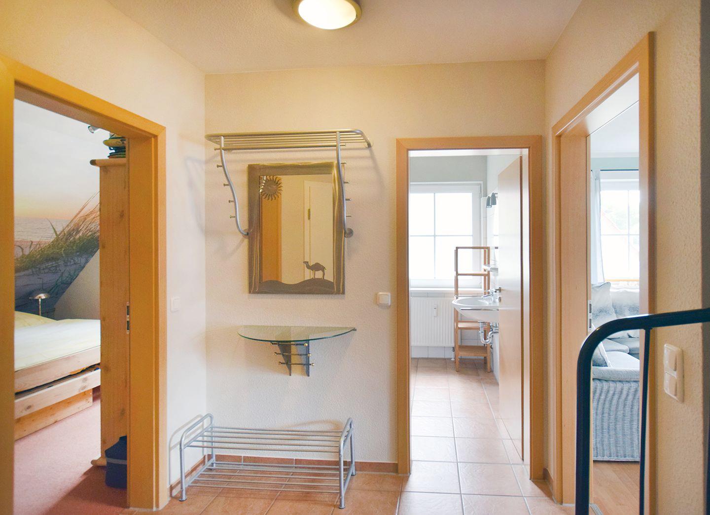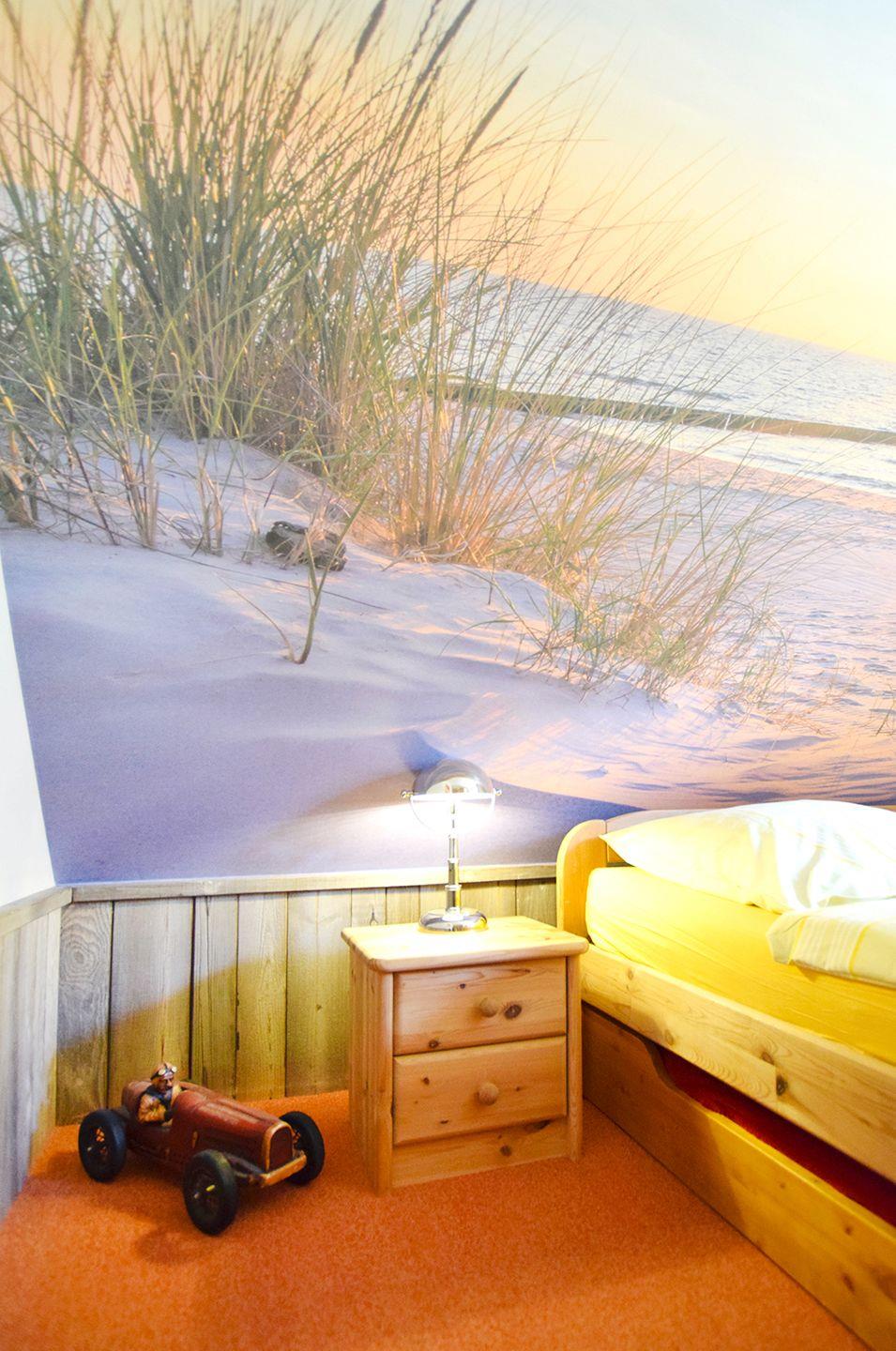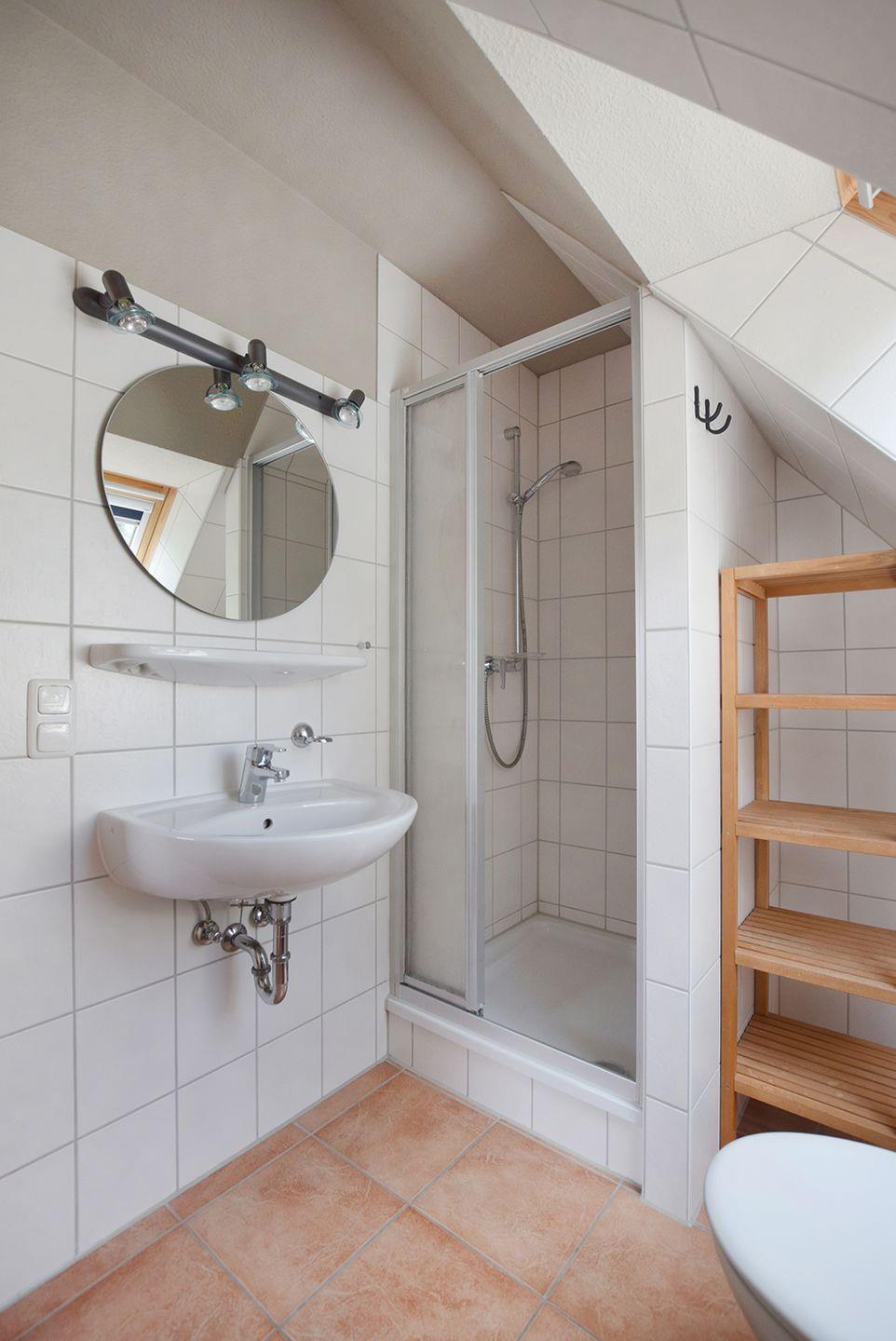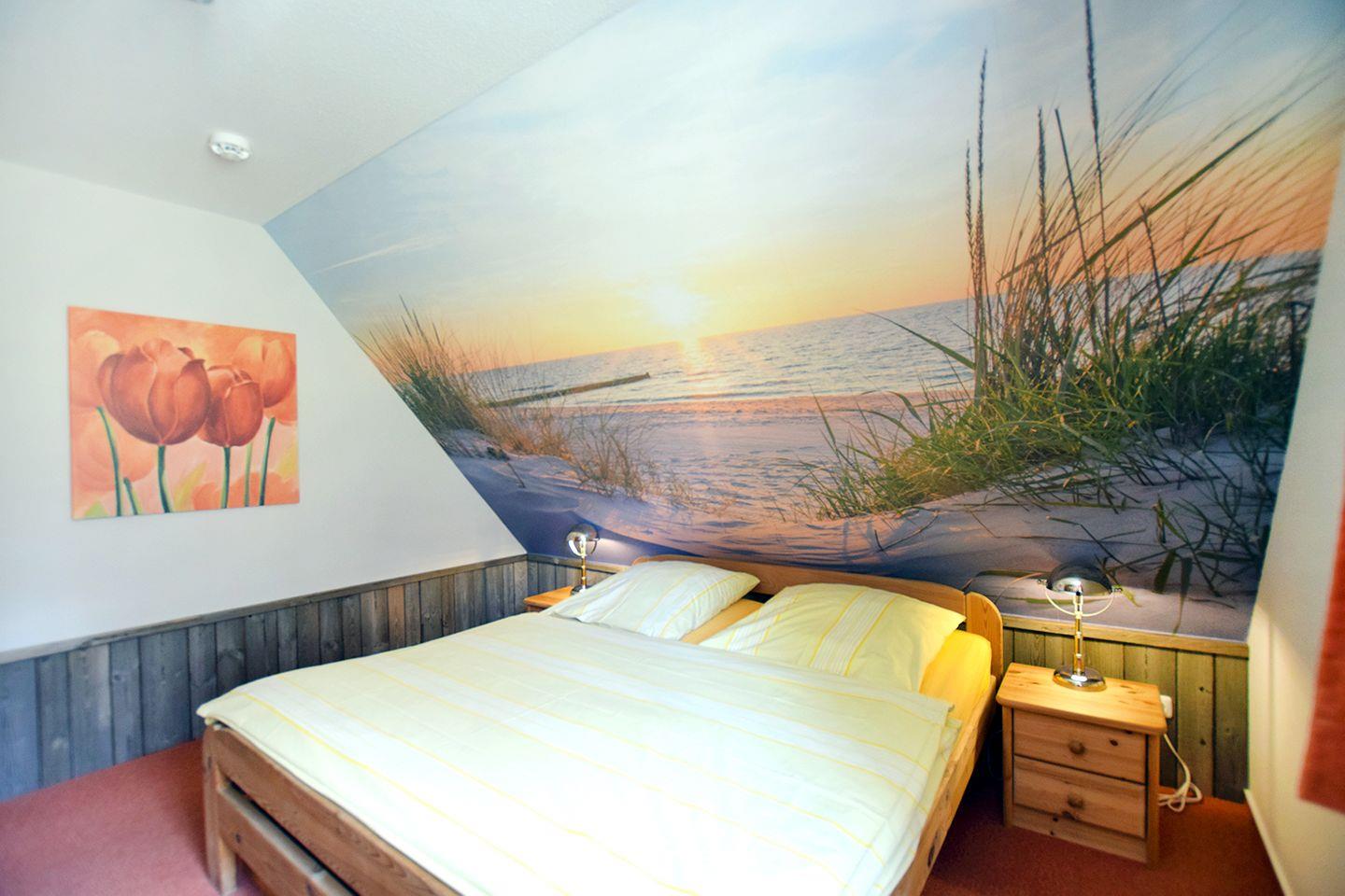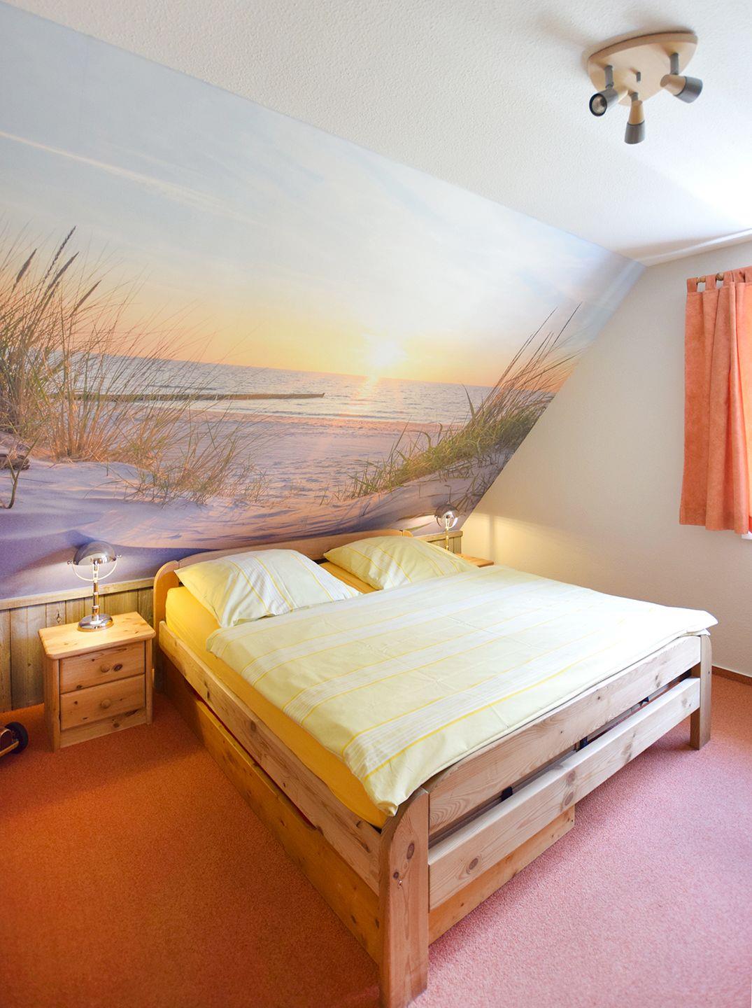Diese großzügige Ferienwohnung für bis zu 5 Personen (4 Erwachsene + 1 Kind bis 8 Jahre) bietet auf ca. 70 m² eine komfortable und gut ausgestattete Unterkunft auf zwei Etagen. Im Obergeschoss erwartet Sie ein gemütlicher Wohnbereich mit Esstisch, Sitzgarnitur, TV (SAT/Kabel) und einem Radio mit CD-Player. Die moderne Einbauküche ist mit einem Herd, Backofen, Geschirrspüler, Mikrowelle, Kühlschrank mit Gefrierfach, Kaffeemaschine, Toaster und Wasserkocher perfekt ausgestattet, um eigene Mahlzeiten zuzubereiten. Im Obergeschoss befindet sich auch ein Badezimmer mit Dusche, Waschmaschine und WC. Über eine Wendeltreppe gelangen Sie ins Dachgeschoss, wo sich das zweite Badezimmer mit Dusche und WC sowie zwei Schlafzimmer befinden. Das erste Schlafzimmer im Dachgeschoss ist mit einem Doppelbett (180 x 200 cm) ausgestattet, das zweite Schlafzimmer