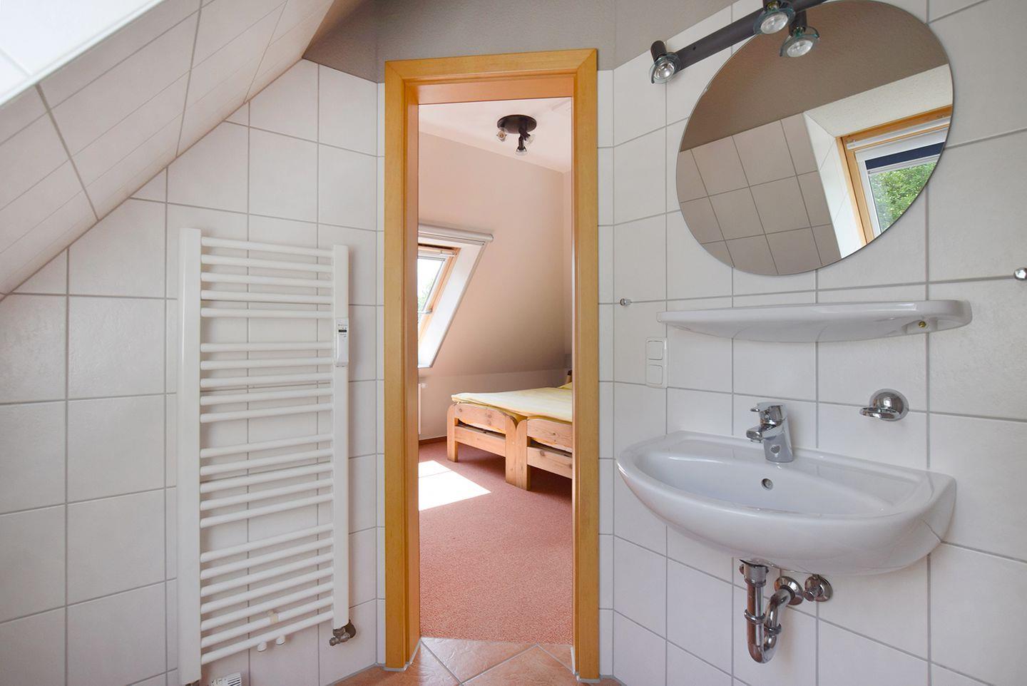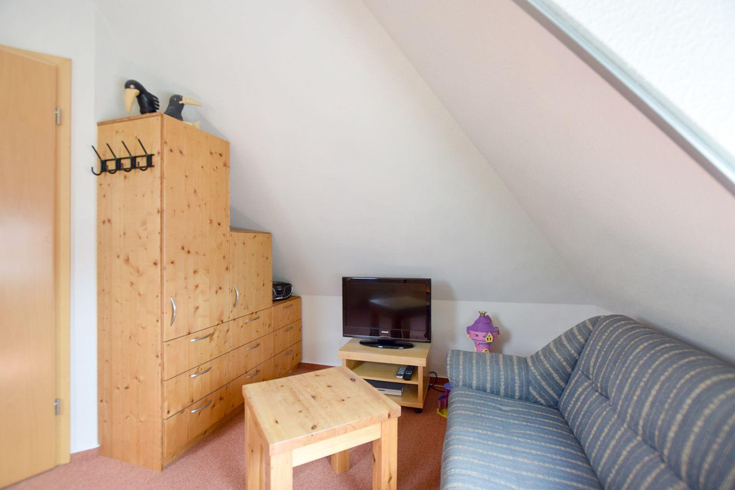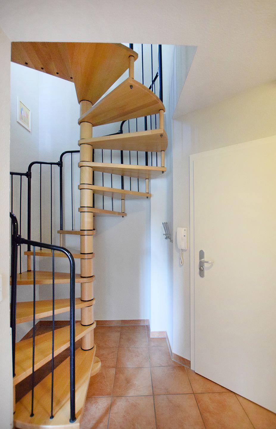 Ferienwohnung bis 5 Personen (4 Erw. + 1 Kind bis 8 Jahre) | ca. 70 qm Wohnfläche | OG Wohnbereich mit Einbauküche, Bad, 1 Schlafzimmer | DG Bad, 1 Schlafzimmer (Wendeltreppe) | Süd-West-Balkon | 2 Parkplätze | Wohnbereich Esstisch, Sitzgarnitur, Radio mit CD-Player, TV SAT/Kabel | Einbauküche Backofen, Geschirrspüler, Herd, Kaffeemaschine, Kühlschrank mit Gefrierfach, Toaster, Wasserkocher | 2 Bäder Dusche, Waschmaschine, WC im OG | Dusche, WC im DG | 2 Schlafzimmer 1 Doppelbett (180 x 200 cm) im OG | 2 Einzelbetten (90 x 200 cm), 1 Einzelbett (für Kind bis 8 Jahre) im DG | WLAN | Ab 7 ÜN inkl. Bettwäsche | Gemeinschaftliche Nutzung von Fahrradschuppen