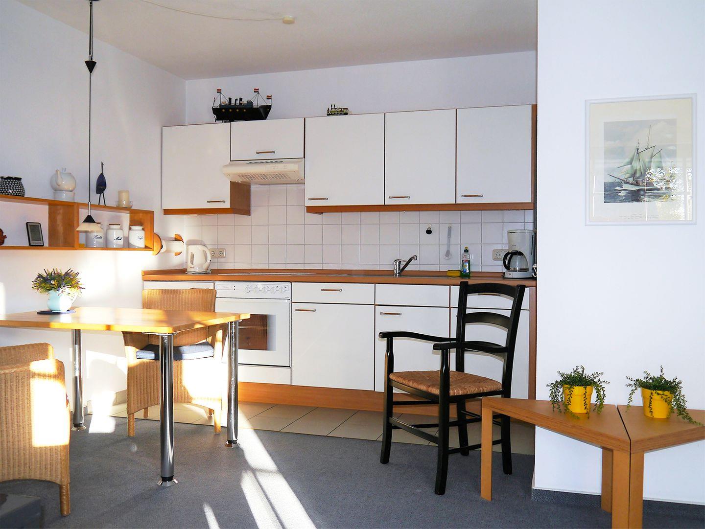Diese gemütliche Ferienwohnung für bis zu 2 Personen bietet auf ca. 45 m² Wohnfläche alles, was für einen entspannten Aufenthalt notwendig ist. Im Obergeschoss befindet sich der einladende Wohnbereich, der mit einer komfortablen Sitzgarnitur, einem Esstisch sowie einem TV mit SAT/Kabel und einem Radio mit CD-Player ausgestattet ist. Die offene Einbauküche verfügt über einen Backofen, Herd, Kaffeemaschine, Kühlschrank mit Gefrierfach, Toaster und Wasserkocher – perfekt für die Zubereitung kleiner Mahlzeiten. Das Badezimmer ist mit einer Dusche und einem WC ausgestattet.