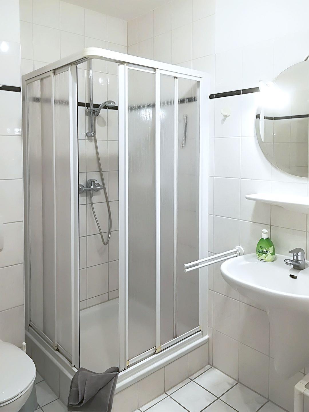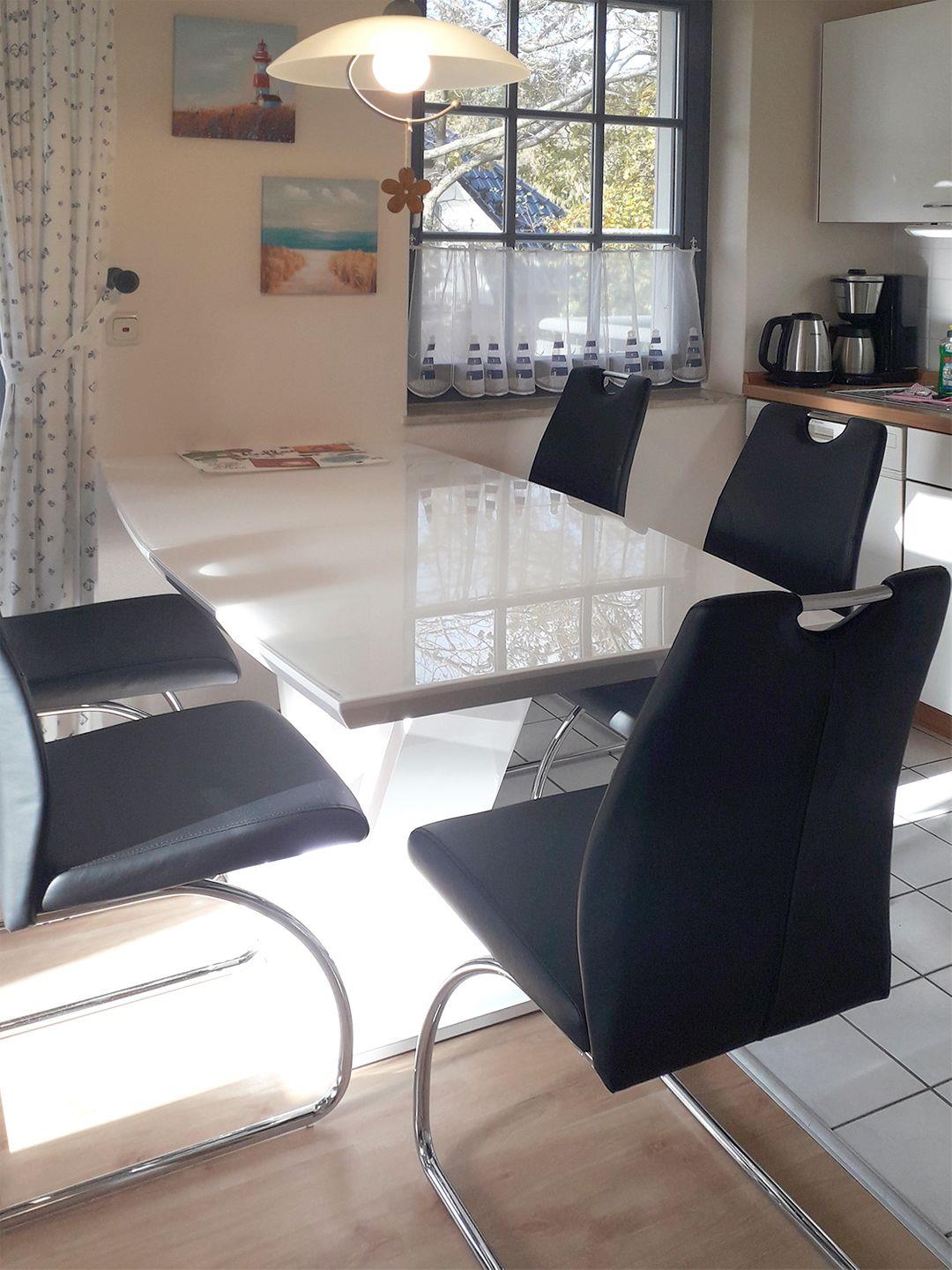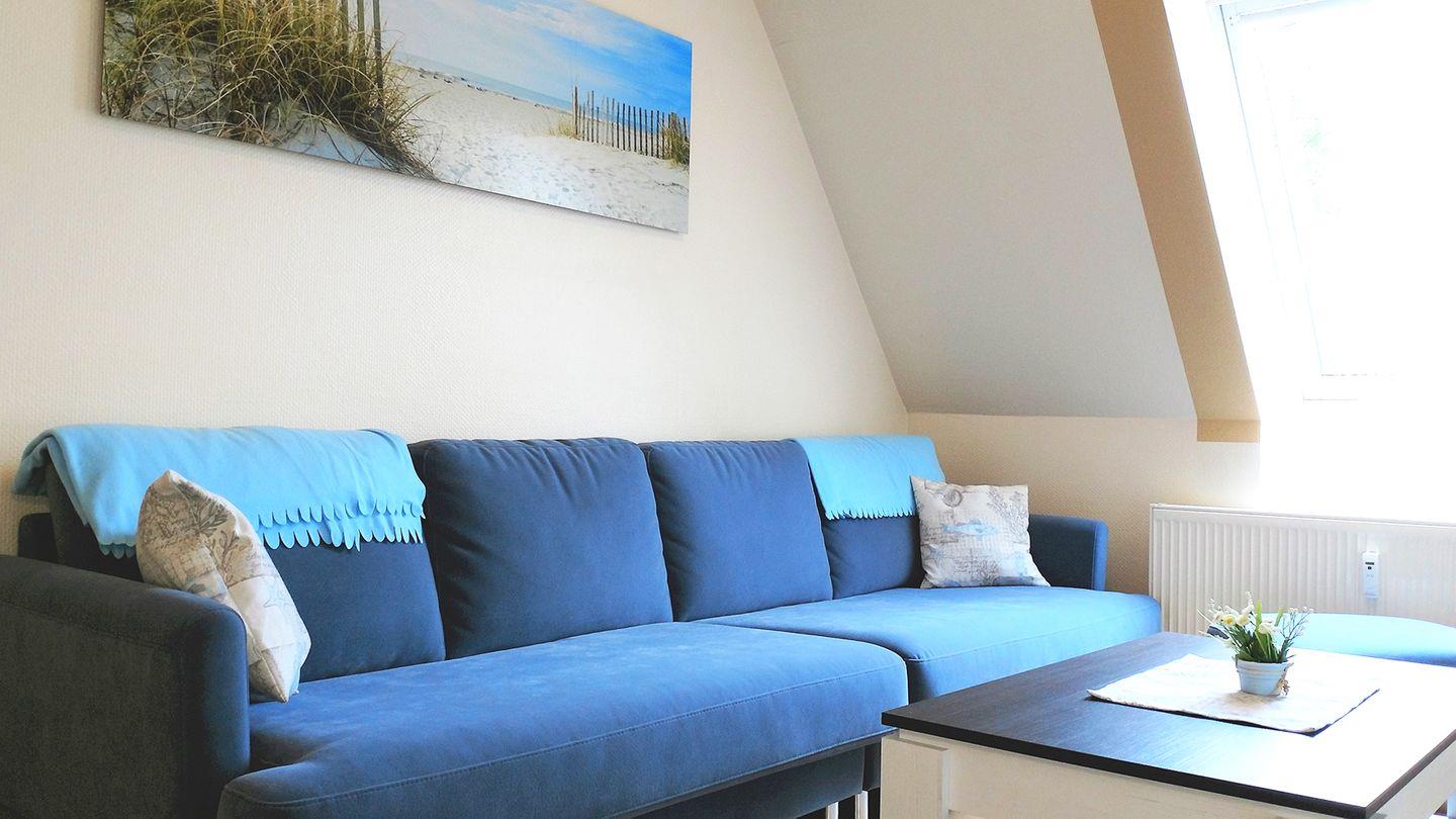 Diese großzügige Ferienwohnung für bis zu 6 Personen bietet auf ca. 72 m² Wohnfläche komfortablen Wohnraum auf zwei Etagen. Im Obergeschoss befindet sich der einladende Wohnbereich mit einer gemütlichen Sitzgarnitur, einem Esstisch und einem TV mit SAT/Kabel. Die offene Einbauküche ist gut ausgestattet mit einem Backofen, Geschirrspüler, Herd, Kaffeemaschine, Kühlschrank mit Gefrierfach, Toaster und Wasserkocher. Zusätzlich gibt es ein modernes Badezimmer mit Dusche und WC. Das Schlafzimmer im Obergeschoss ist mit einem Doppelbett (180 x 200 cm) eingerichtet.