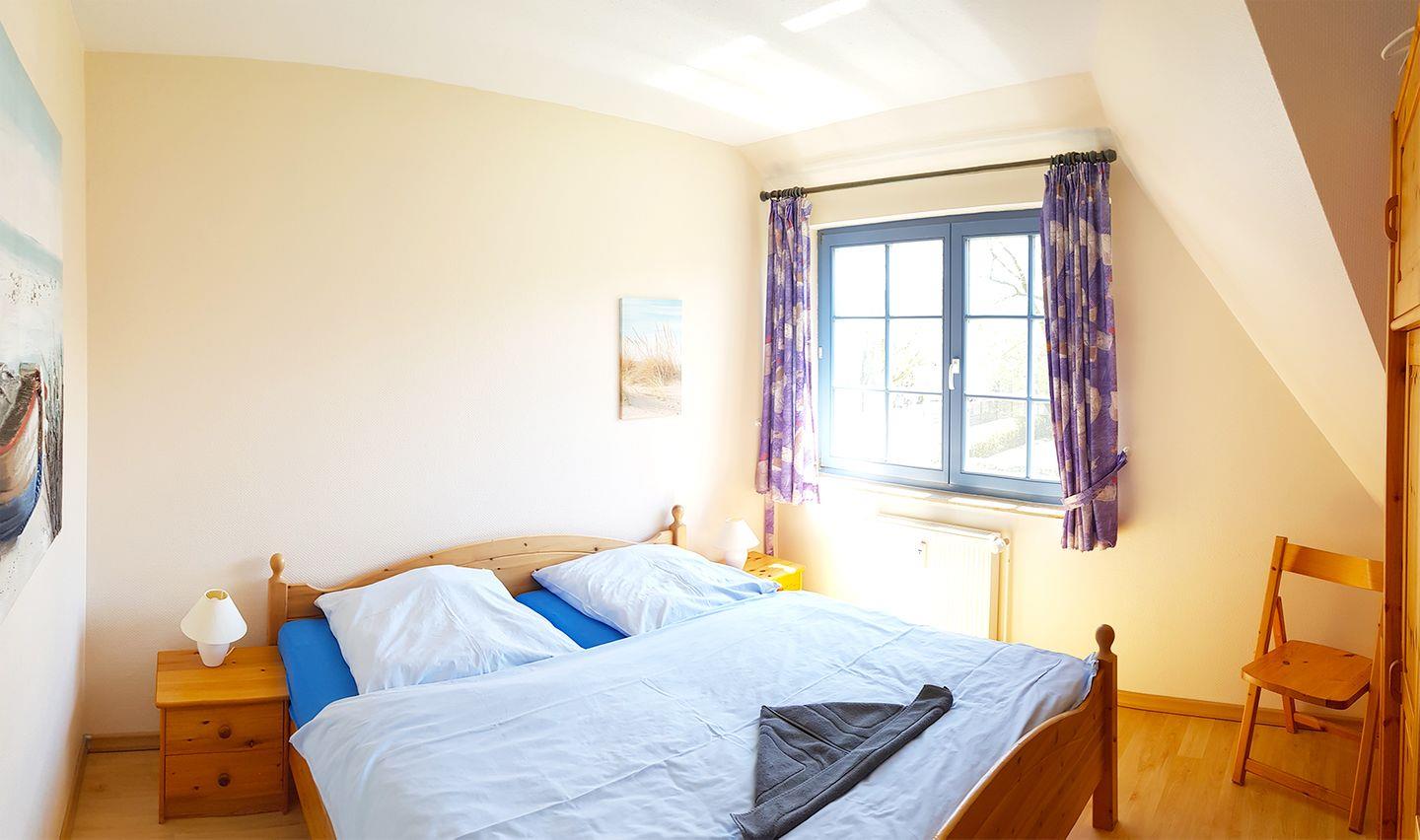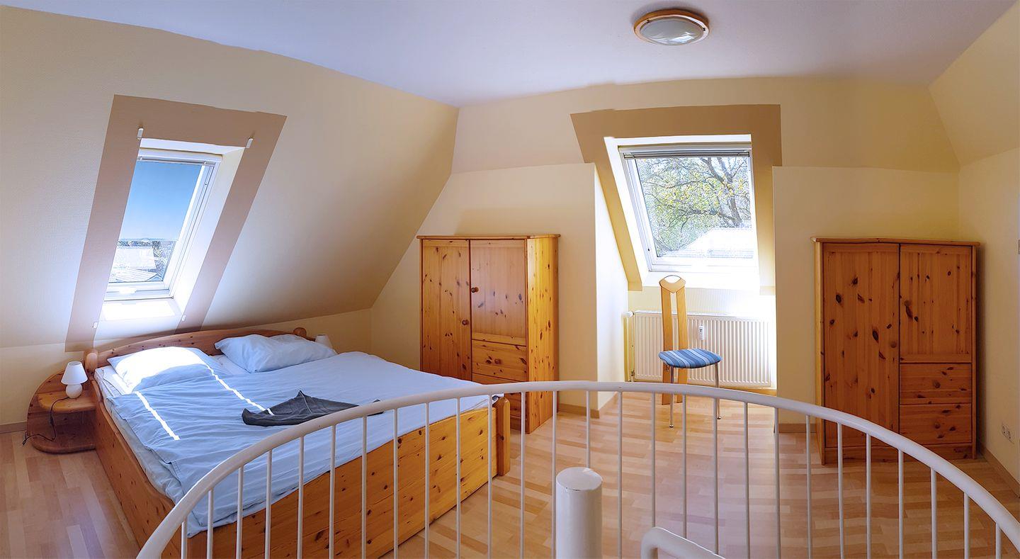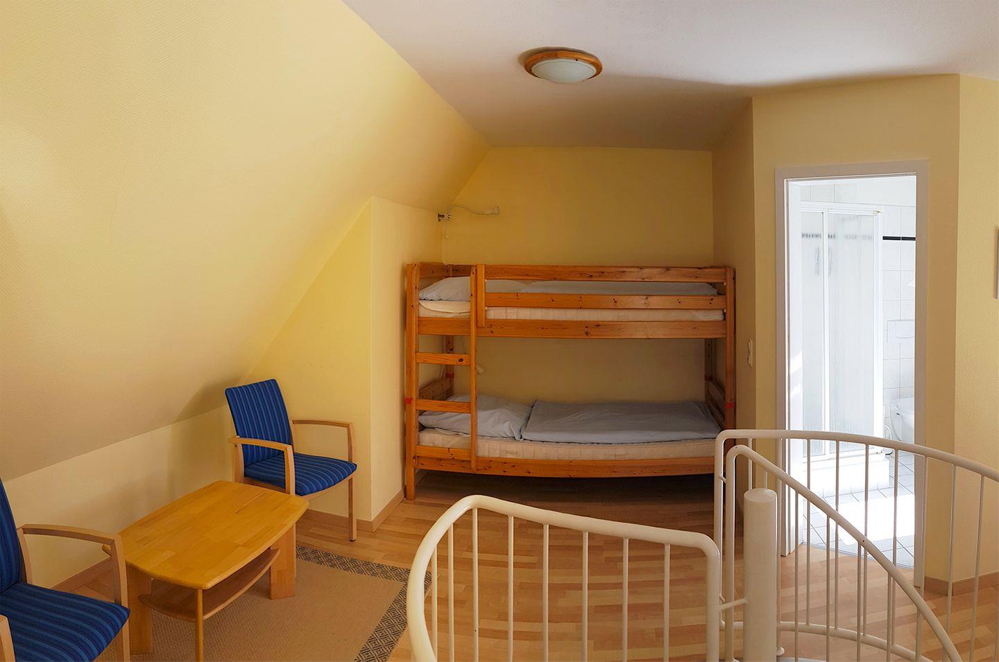 Über eine Wendeltreppe gelangen Sie ins Dachgeschoss, wo ein weiteres Badezimmer mit Dusche und WC sowie ein zweites Schlafzimmer mit einem Doppelbett (180 x 200 cm) und einem Etagenbett (80 x 190 cm) auf Sie warten.