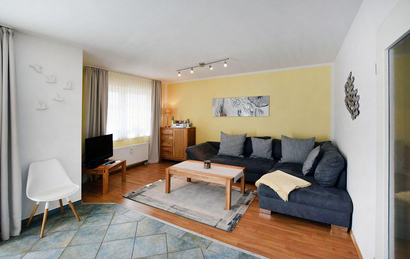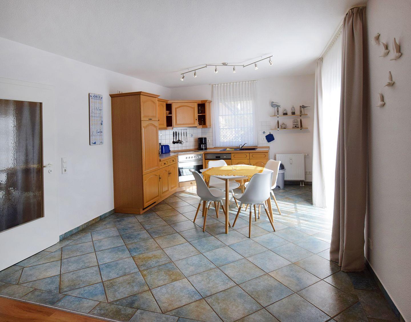 Diese einladende Ferienwohnung für bis zu 4 Personen bietet auf ca. 63 m² Wohnfläche viel Platz und Komfort. Im Erdgeschoss befinden sich ein großzügiger Wohnbereich, eine gut ausgestattete Einbauküche, ein Badezimmer sowie zwei Schlafzimmer. Die Süd-Terrasse lädt zum Entspannen und Genießen der Sonne ein.