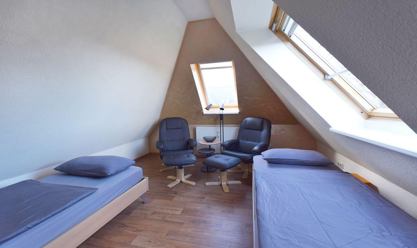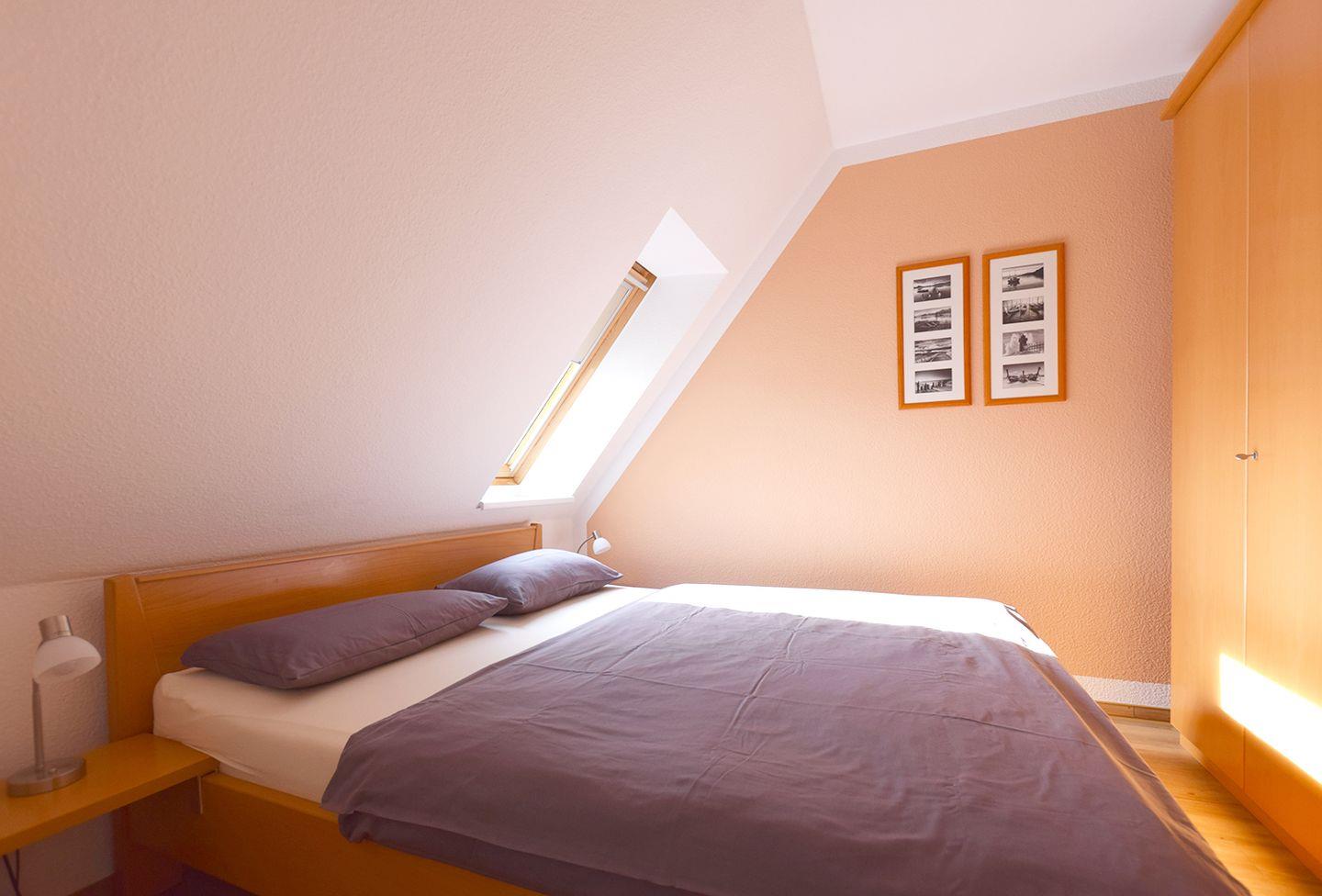 Das erste Schlafzimmer im OG ist mit einem Doppelbett (160 x 200 cm, durchgehende Matratze) ausgestattet. Im Dachgeschoss, das über eine Wendeltreppe erreichbar ist, befindet sich ein weiteres Schlafzimmer mit 3 Einzelbetten (je 90 x 200 cm), zwei Sesseln und einem SAT-TV. Zusätzlich gibt es im DG ein Gäste-WC.