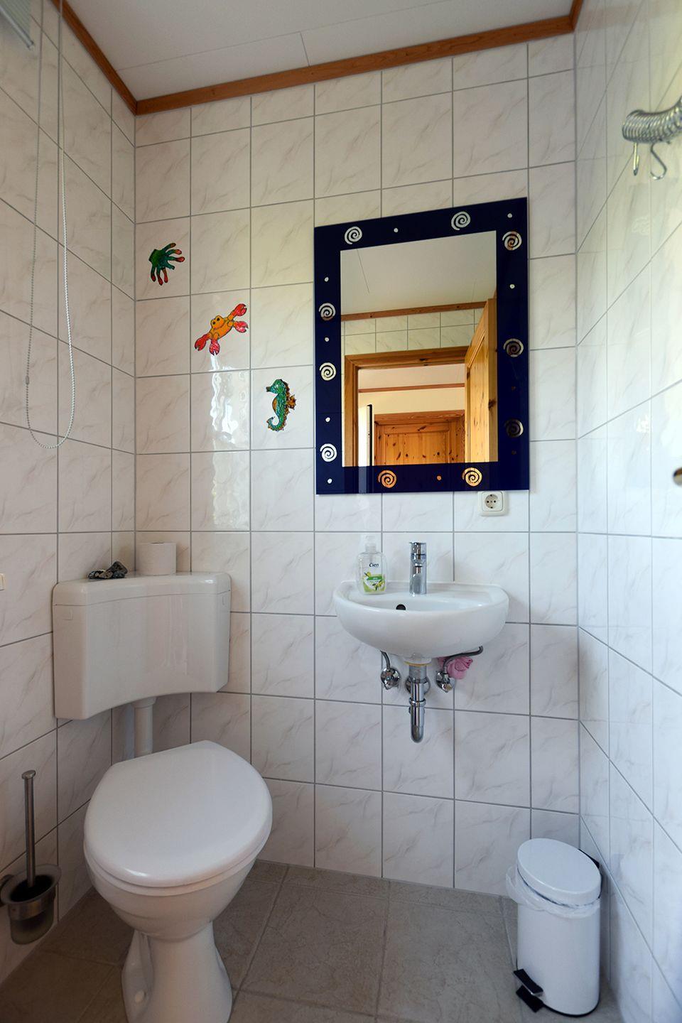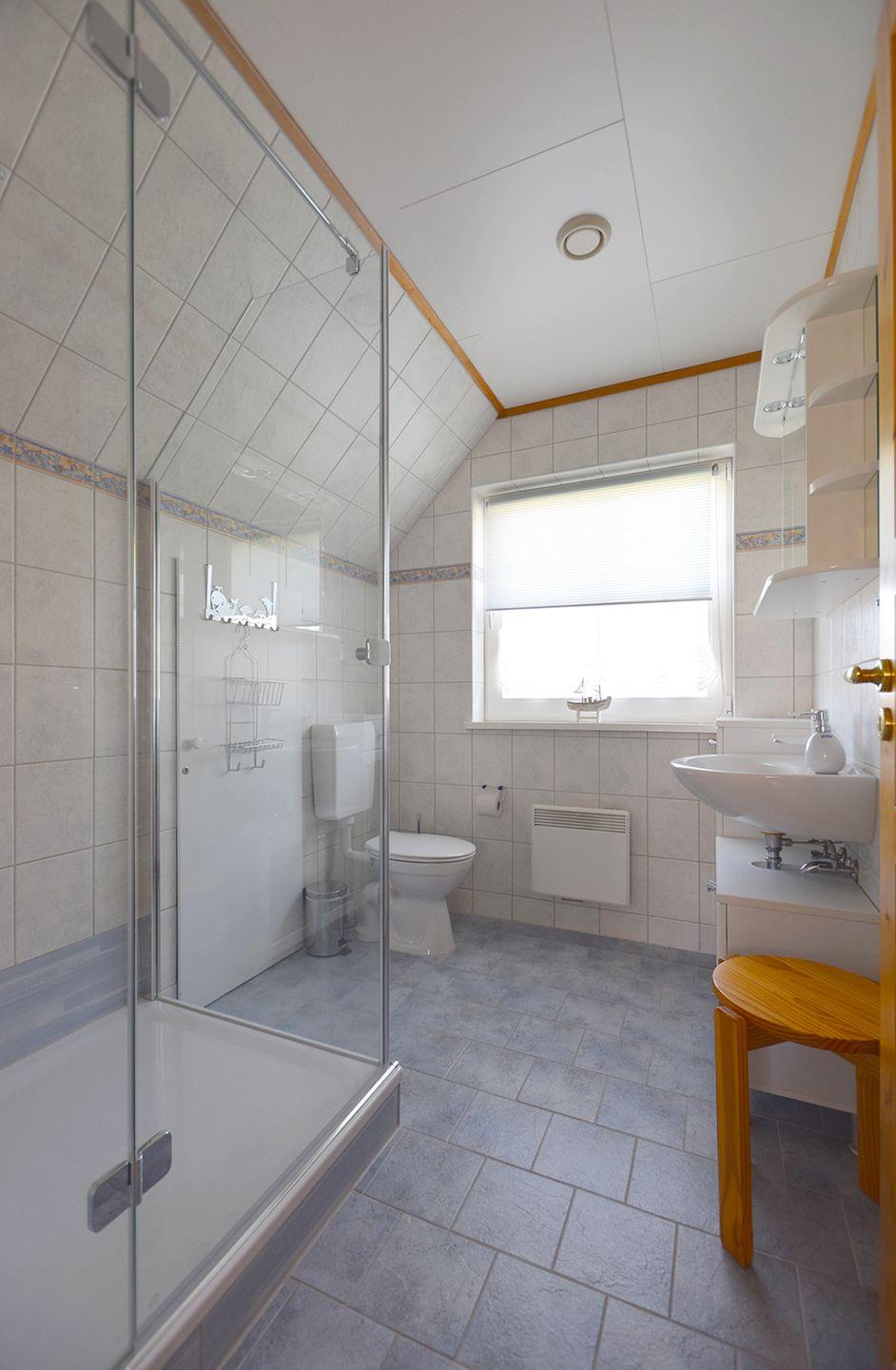 Dieses charmante Ferienhaus für bis zu 5 Personen bietet auf ca. 80 m² Wohnfläche alles für einen erholsamen Urlaub. Im Erdgeschoss erwartet Sie ein gemütliches Wohnzimmer mit einem Ecksofa, einem Sessel, einem Lesesessel und einem Hocker. Der Flachbild-SAT-TV sorgt für Unterhaltung an ruhigen Abenden. Der Essbereich im angrenzenden Küchenbereich ist mit einer Eckbank, Stühlen und einem Tisch ausgestattet, ideal für gemeinsame Mahlzeiten. Die integrierte Küche verfügt über ein Cerankochfeld, einen Backofen, Geschirrspüler, Kühlschrank mit Gefrierfach, Kaffeemaschine, Toaster, Wasserkocher und Mikrowelle – hier können Sie nach Belieben kochen. Ein Gäste-WC und ein Hauswirtschaftsraum mit Waschmaschine ergänzen das Angebot im Erdgeschoss.
