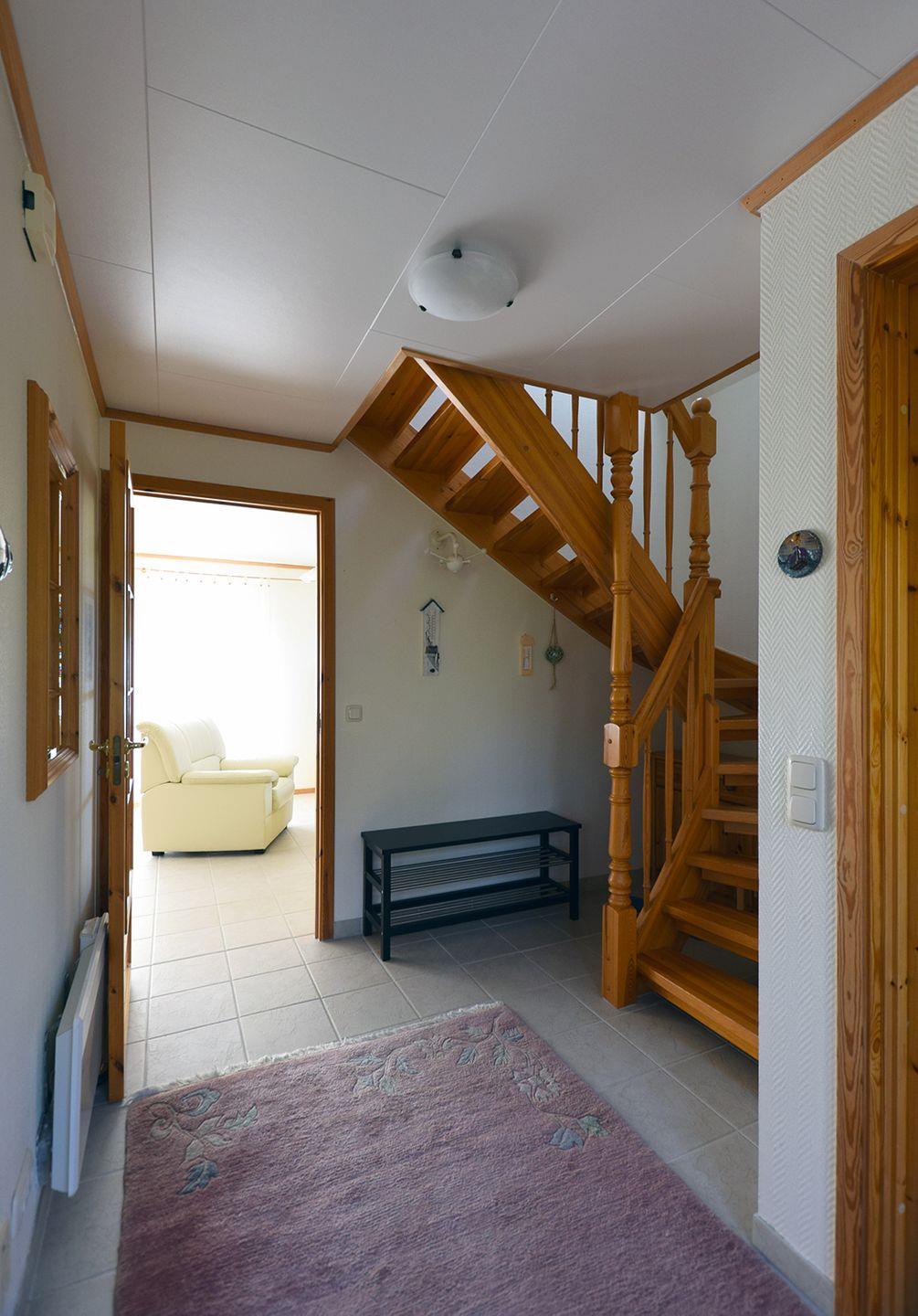 Ferienhaus bis 5 Personen | ca. 80 m² Wohnfläche | EG Wohnzimmer, integrierte Küche mit Küchenzeile und Essbereich, Gäste-WC, Hauswirtschaftsraum | OG 2 Schlafzimmer, Duschbad | Terrasse | 2 Parkplätze | Wohnzimmer Ecksofa und Sessel, Flachbild-SAT-TV, Lesesessel und Hocker | Integrierte Küche Essbereich mit Tisch, Eckbank und Stühlen, Küchenzeile mit Herd (Cerankochfeld), Backofen, Geschirrspüler, Kühlschrank mit Gefrierfach, Kaffeemaschine, Toaster, Wasserkocher, Mikrowelle | 2 Bäder Gäste-WC im EG | Dusche und WC im OG | 2 Schlafzimmer | SZ 1 1 Doppelbett (160 x 200 cm), 1 Einzelbett (90 x 200 cm) und 1 Holzbabybett | SZ 2 1 Doppelbett (140 x 200 cm) | Garten, Terrassenmöbel, Kinderhochstuhl, Waschmaschine, Fliegenschutzgitter, Fahrradschuppen, WLAN