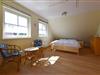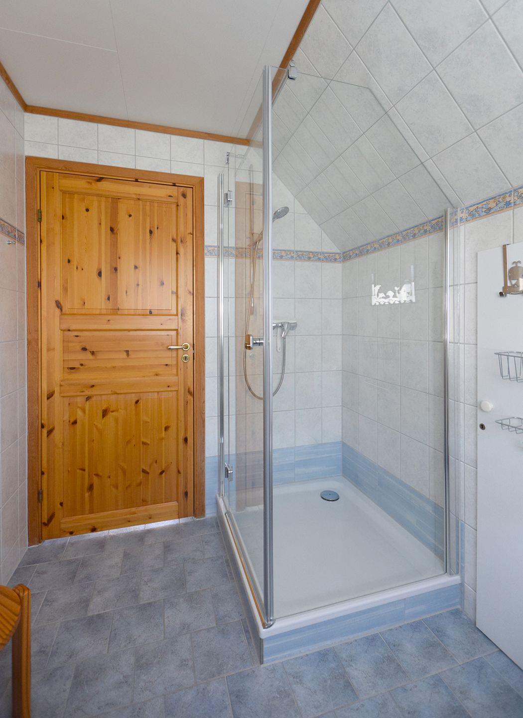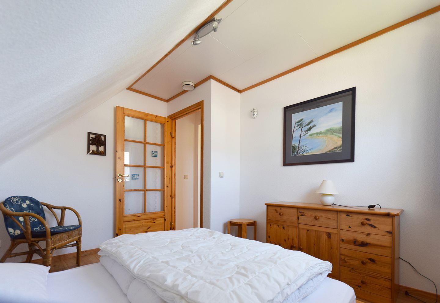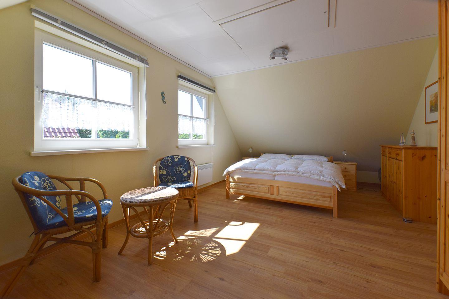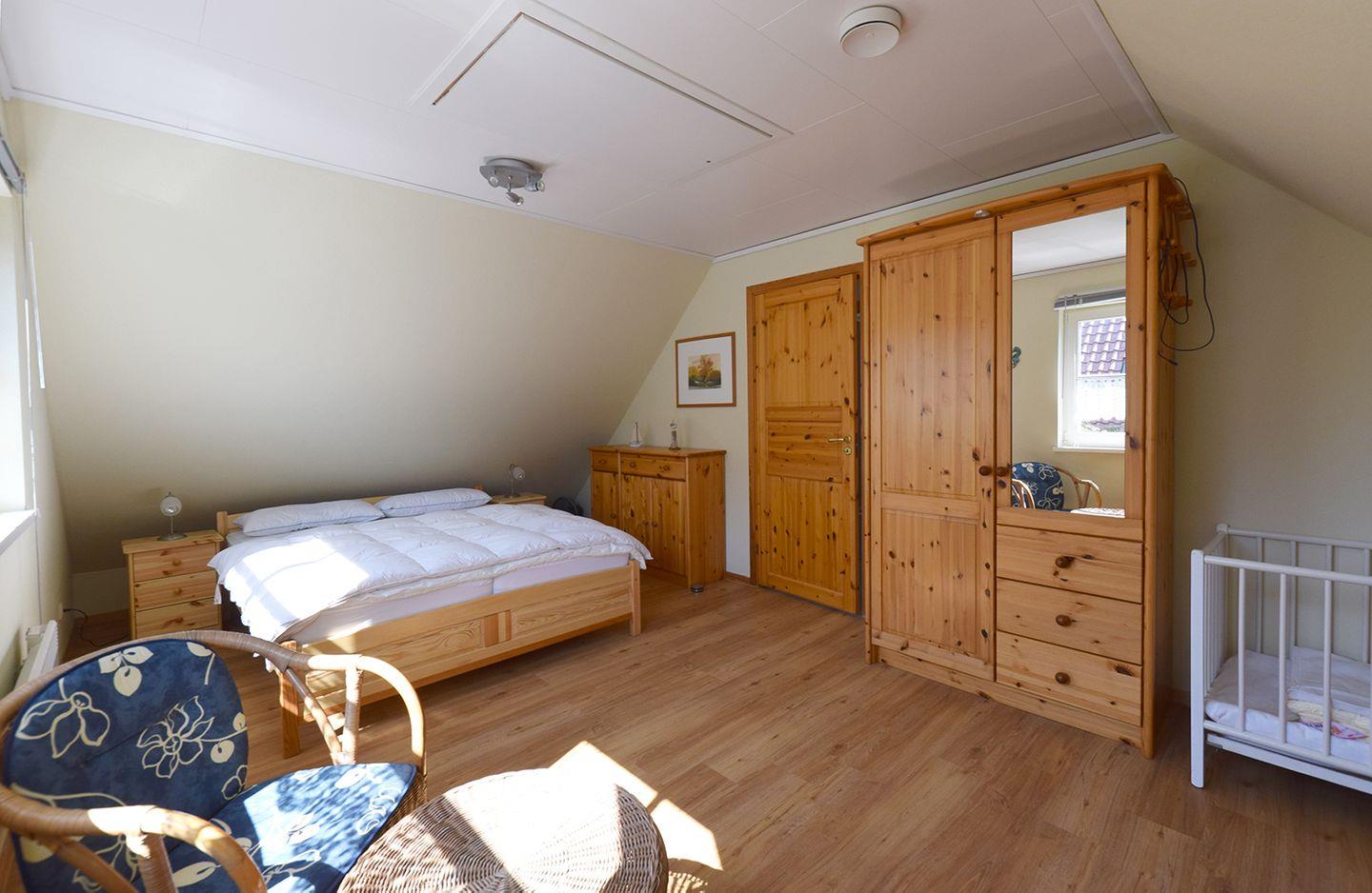 Im Obergeschoss befinden sich zwei Schlafzimmer. Das erste Schlafzimmer bietet ein Doppelbett (160 x 200 cm), ein Einzelbett (90 x 200 cm) sowie ein Babybett, perfekt für Familien mit kleinen Kindern. Das zweite Schlafzimmer ist mit einem kleineren Doppelbett (140 x 200 cm) ausgestattet. Beide Schlafzimmer bieten ausreichend Stauraum und eine gemütliche Atmosphäre für einen erholsamen Schlaf. Im Obergeschoss finden Sie außerdem ein Tageslichtbad mit Dusche und WC.