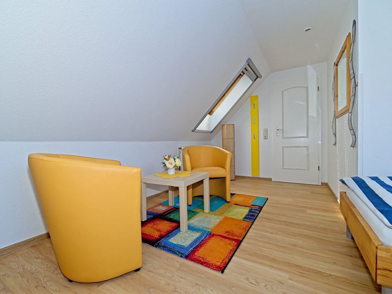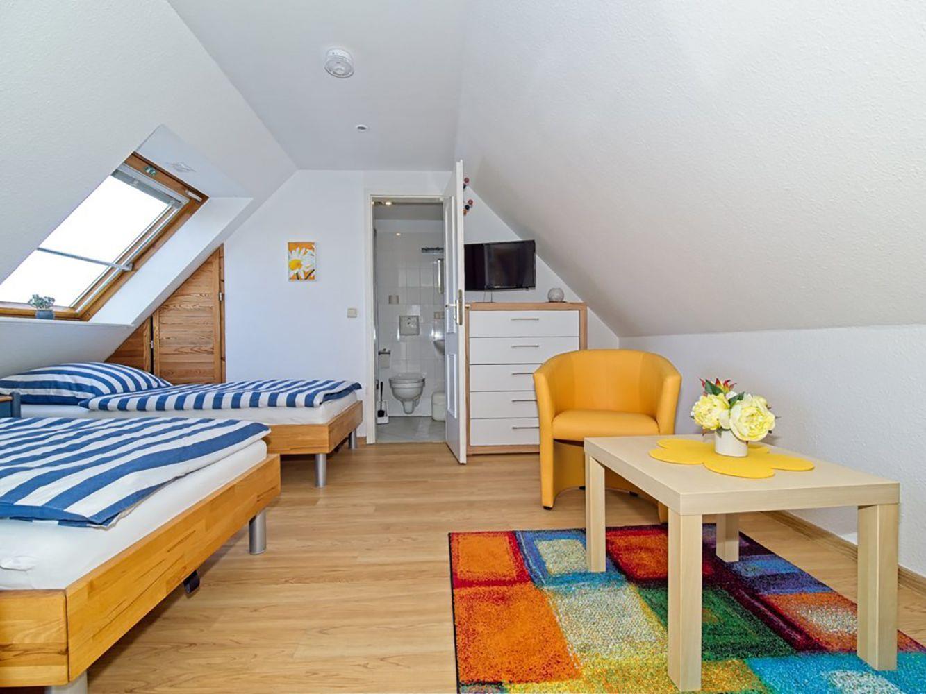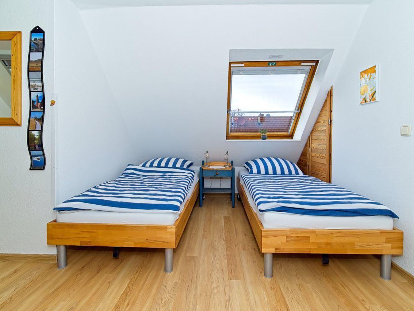 Das erste Schlafzimmer im Obergeschoss ist mit einem Doppelbett (180 x 200 cm) ausgestattet, während das zweite Schlafzimmer im Dachgeschoss mit zwei Einzelbetten (je 90 x 200 cm) für ausreichend Schlafmöglichkeiten sorgt.
