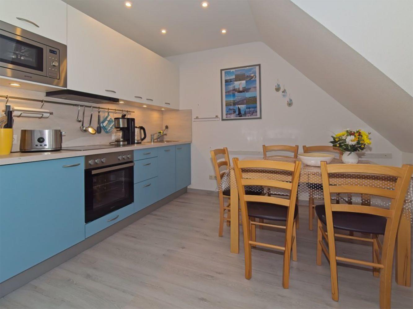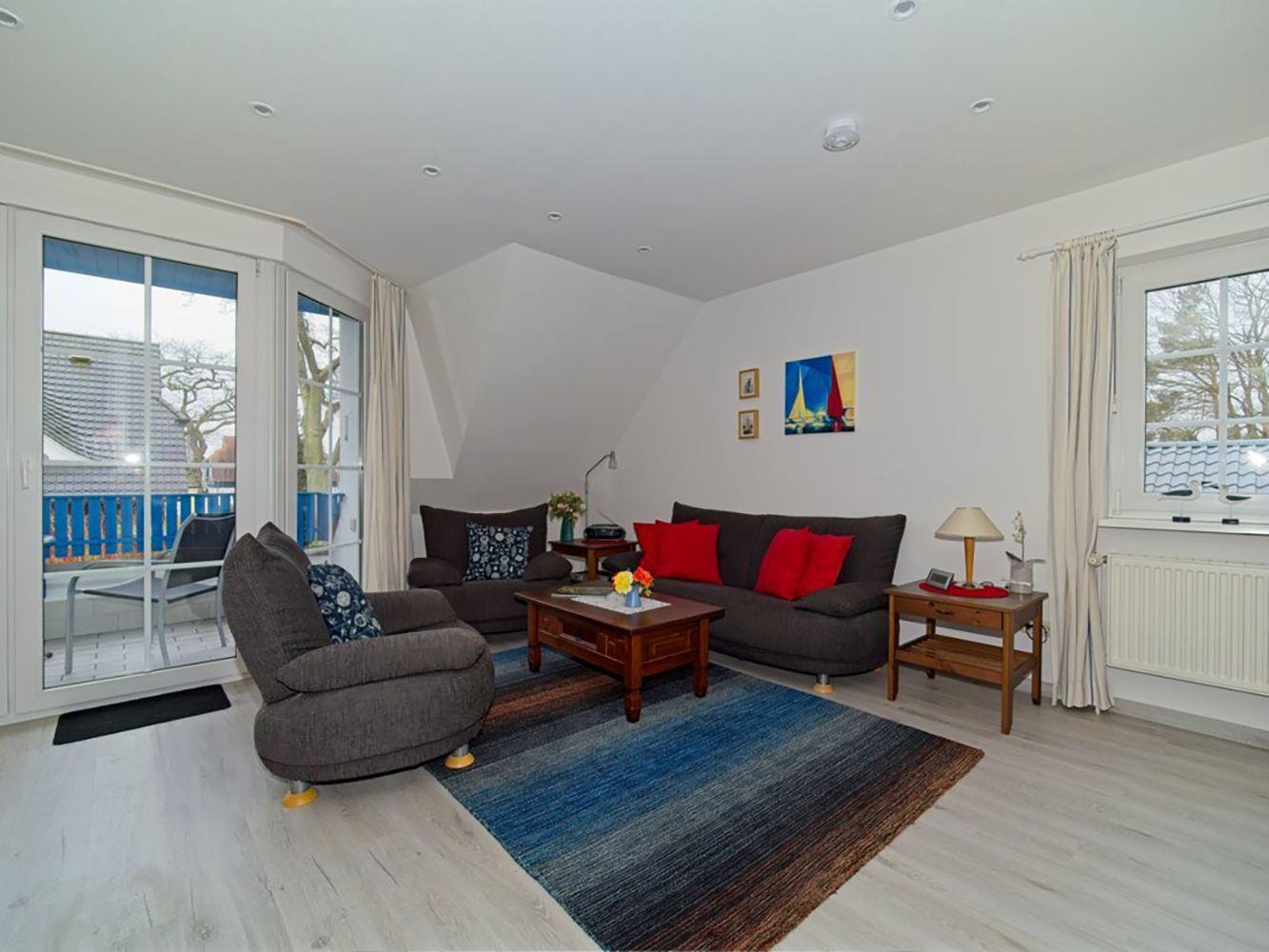 Ferienwohnung bis 4 Personen | ca. 90 m² Wohnfläche | OG Wohnbereich mit Küchenzeile, Bad, 1 Schlafzimmer | DG Bad, 1 Schlafzimmer | Süd-Loggia | 1 Parkplatz | Wohnbereich Sitzgarnitur, Radio mit CD-Player, SAT-TV | Küchenzeile Backofen, Geschirrspüler, Herd, Kaffeemaschine, Kühlschrank mit Gefrierfach, Mikrowelle, Toaster, Wasserkocher | 2 Bäder Badewanne, WC im OG | Dusche, WC im DG | 2 Schlafzimmer 1 Doppelbett (180 x 200 cm) im OG | 2 Einzelbetten (90 x 200 cm) im DG | inkl. Bettwäsche, Handtücher, Kinderbett, Kinderhochstuhl, WLAN