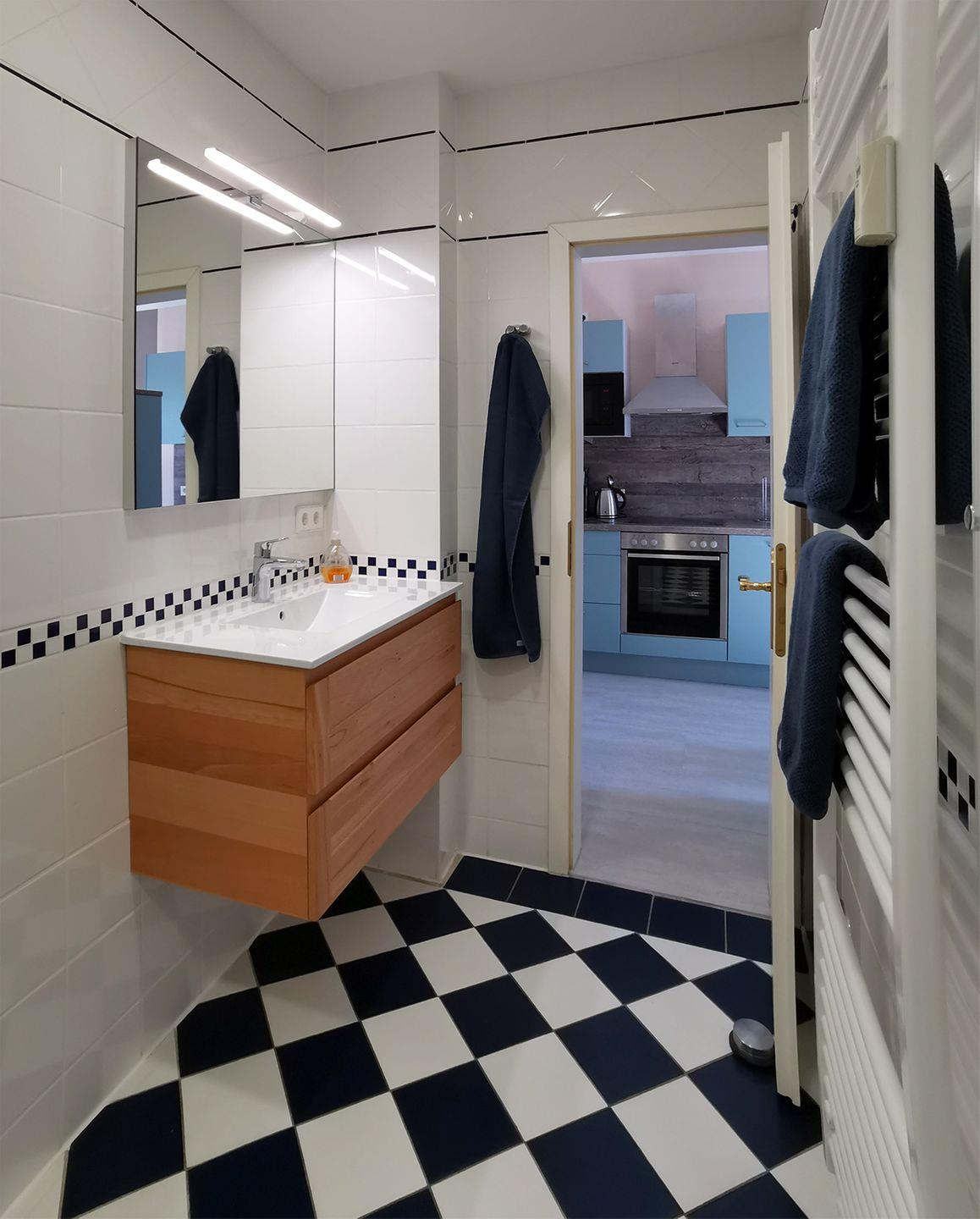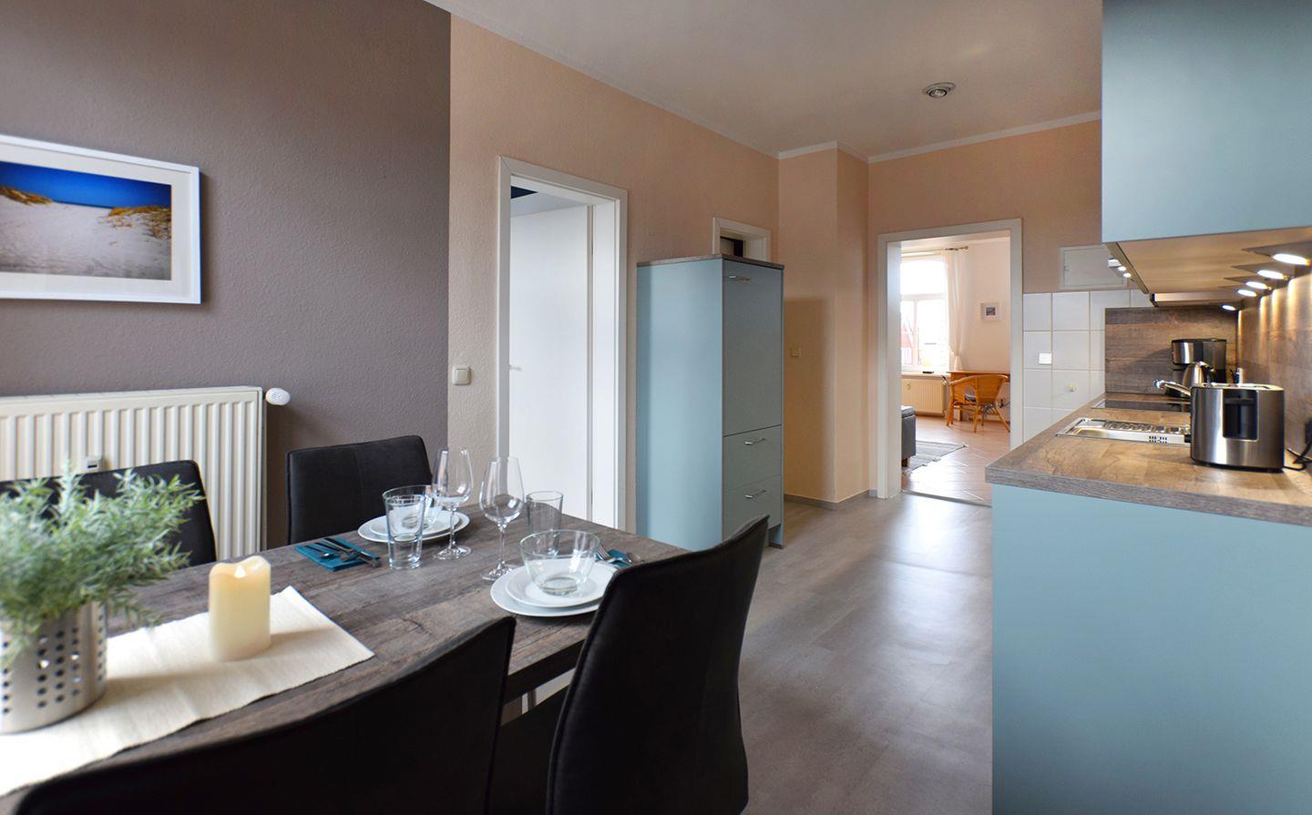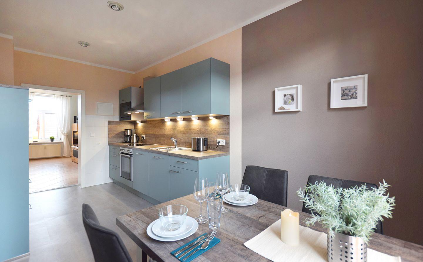 Die gut ausgestattete, separate Küche ist mit einer modernen Einbauküche inklusive Backofen, Geschirrspüler, Herd, Kaffeemaschine, Kühlschrank mit Gefrierfach, Toaster und Wasserkocher ausgestattet – perfekt für die Zubereitung von Mahlzeiten. In der Küche finden Sie auch den Essbereich, der für vier Gäste Platz bietet.