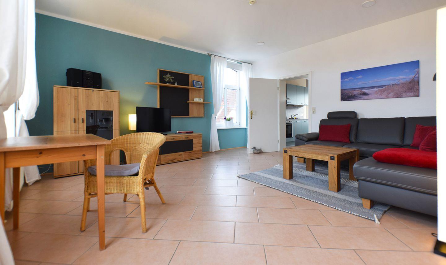 Diese gemütliche Ferienwohnung bietet auf ca. 60 m² Platz für bis zu 4 Personen und ist auch für Haustiere geeignet. Sie befindet sich im Obergeschoss und verfügt über ein einladendes Wohnzimmer mit Schlafsofa, Radio mit CD-Player sowie SAT-TV, sodass Sie nach einem erlebnisreichen Tag entspannen können.