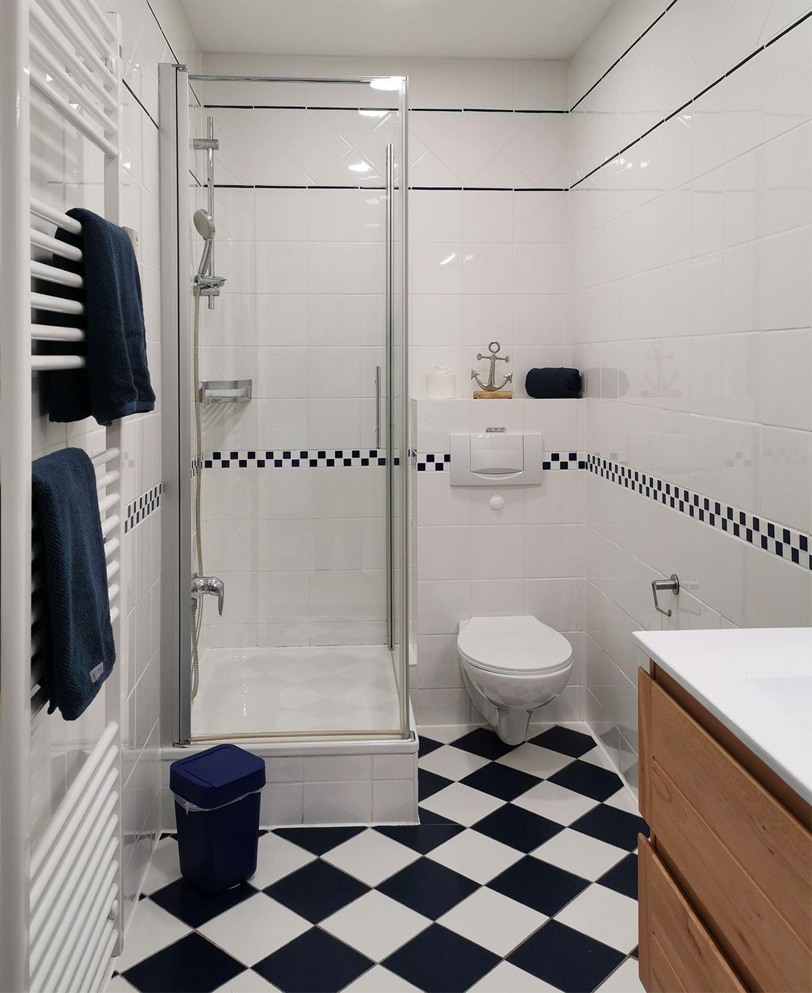 Das Badezimmer verfügt über eine Dusche und ein WC.