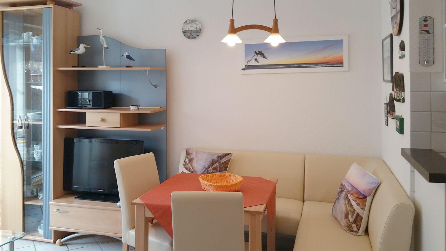 Ferienwohnung bis 2 Personen | Haustier möglich | ca. 37 m² Wohnfläche | EG Wohnbereich mit Küchenzeile, Bad, 1 Schlafzimmer | West-Terrasse | 1 Parkplatz | Wohnbereich Esstisch, Schlafsofa, Radio mit CD-Player, SAT-TV | Küchenzeile Backofen, Geschirrspüler, Herd, Kaffeemaschine, Kühlschrank mit Gefrierfach, Toaster, Wasserkocher | Bad bodentiefe Dusche, WC | 1 Schlafzimmer 1 Doppelbett (180 x 200 cm) | ab 7 Übernachtungen inkl. Bettwäsche, Handtücher I Strandkorb, WLAN