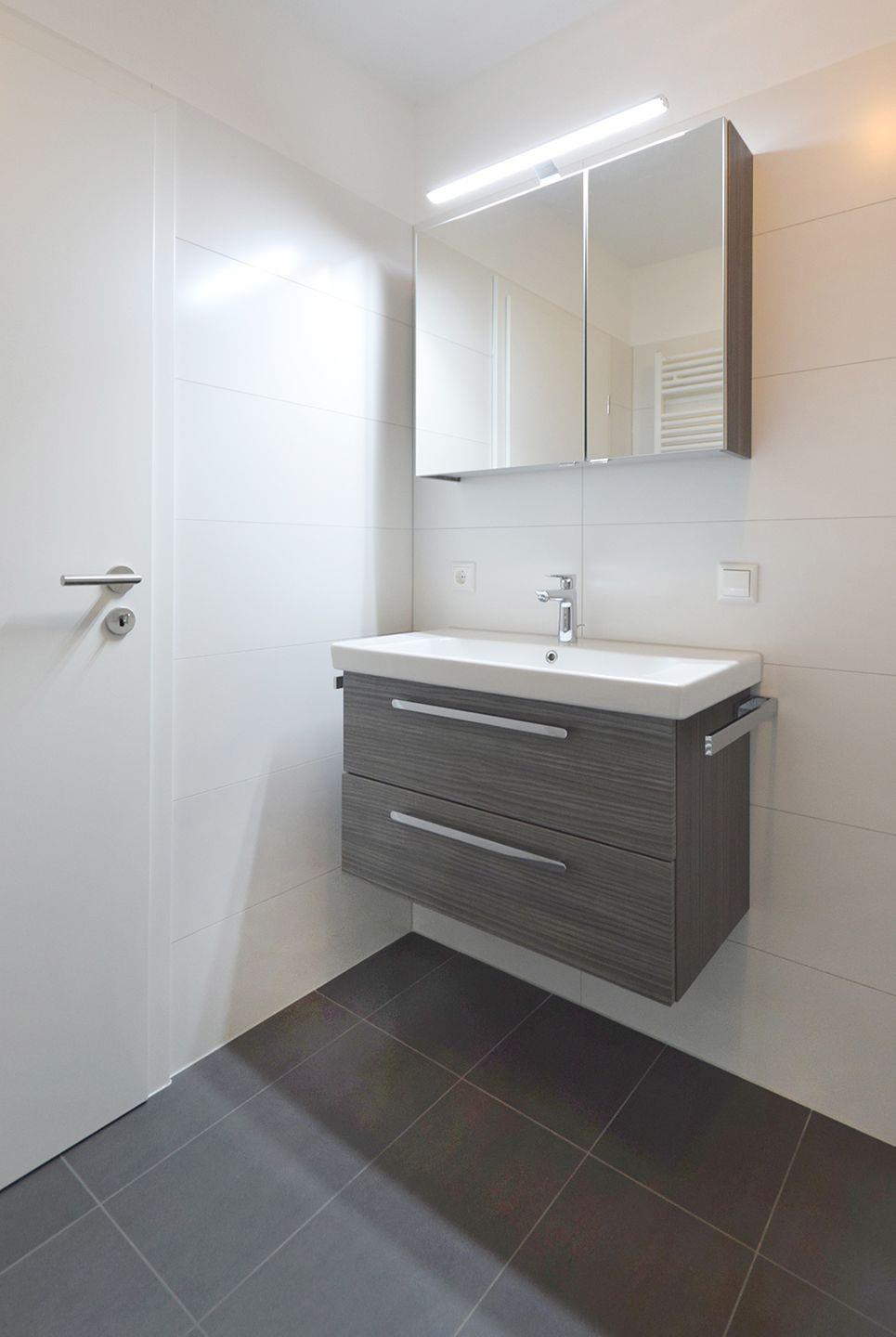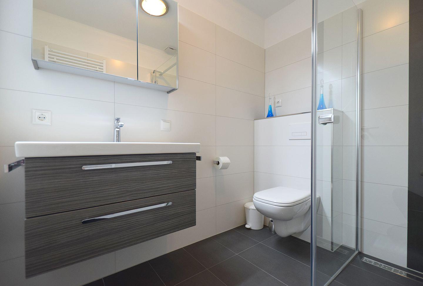 Das moderne Bad ist mit einer bodengleichen Dusche und einem WC ausgestattet.