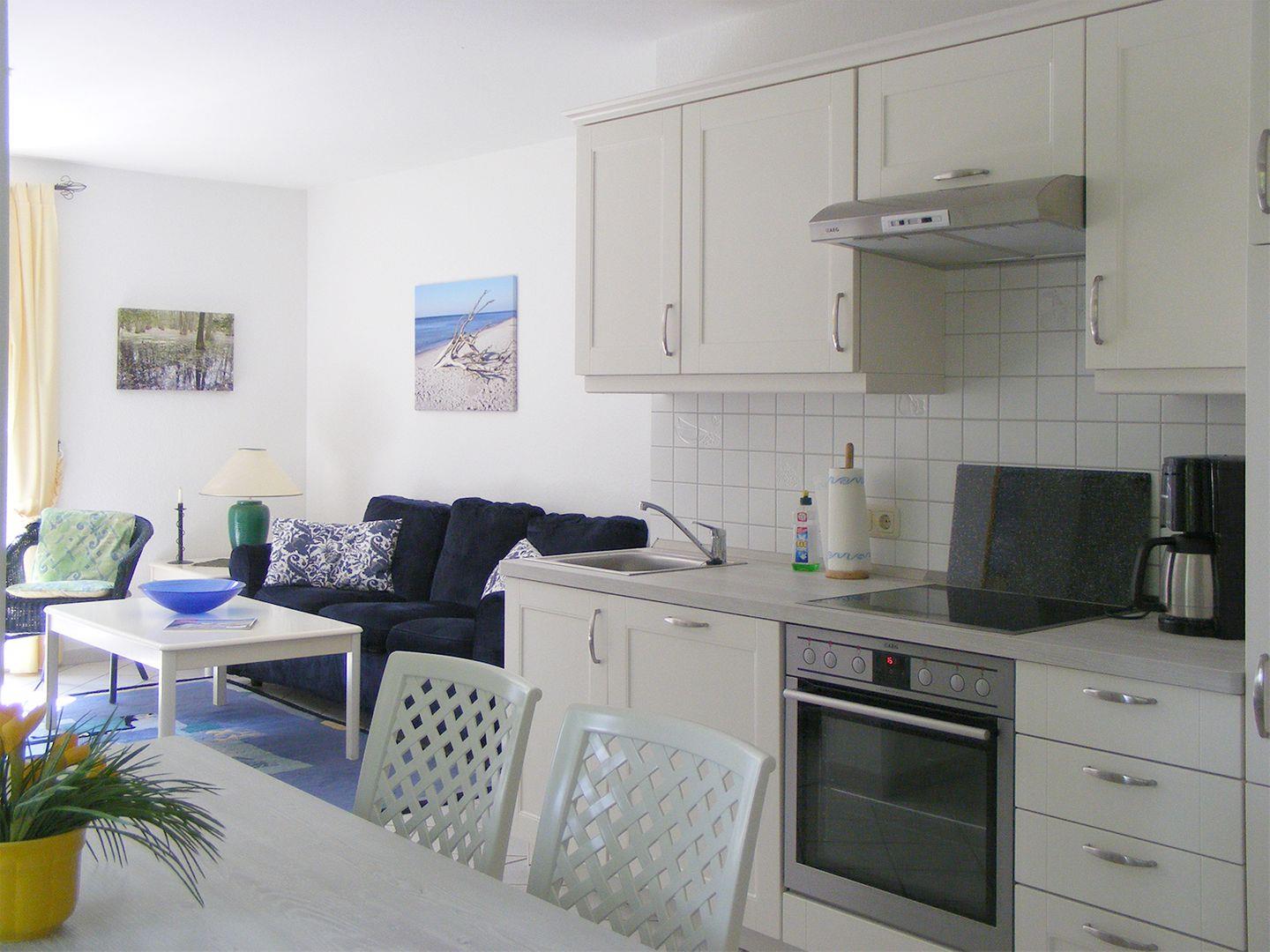 Der Wohnbereich ist gemütlich eingerichtet und bietet einen Esstisch, eine Sitzgarnitur sowie einen Radio mit CD-Player und SAT-TV. In der offenen Küchenzeile finden Sie alles, was Sie zur Zubereitung eigener Mahlzeiten benötigen, einschließlich Backofen, Geschirrspüler, Herd, Kaffeemaschine, Kühlschrank mit Gefrierfach, Toaster und Wasserkocher.
