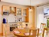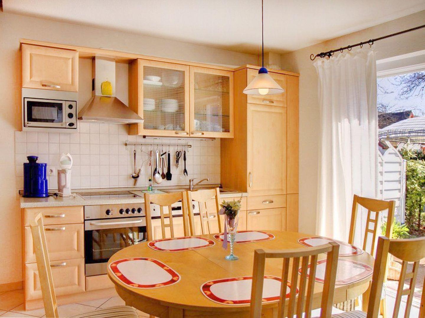 Im Erdgeschoss befindet sich ein einladendes Wohnzimmer mit Sofa, zwei Sesseln und Flachbild-SAT-TV sowie eine offene, gut ausgestattete Küche mit Essbereich. Die Küchenzeile verfügt über einen Herd mit Cerankochfeld, Backofen, Geschirrspüler, Kühlschrank mit Gefrierfach, Kaffeemaschine, Toaster, Wasserkocher und Mikrowelle. Zudem gibt es ein Gäste-WC im Erdgeschoss.
