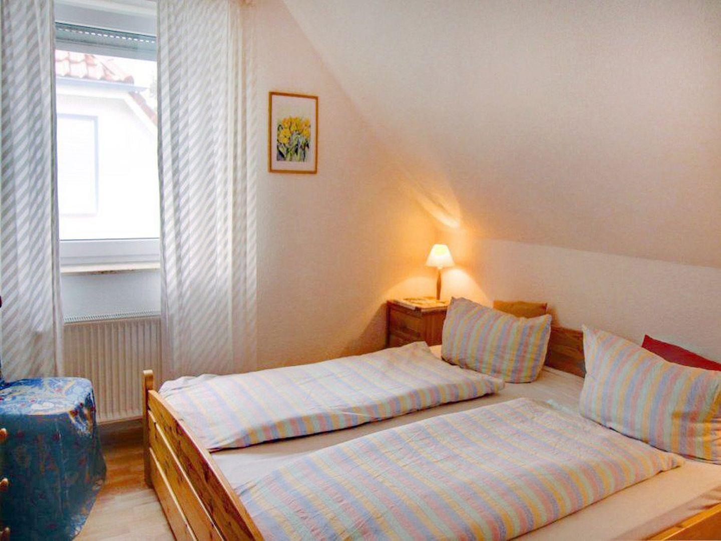 Im Obergeschoss befinden sich die Schlafzimmer: Schlafzimmer 1 ist mit einem Doppelbett (180 x 200 cm) ausgestattet, Schlafzimmer 2 bietet zwei Einzelbetten (90 x 200 cm) und Schlafzimmer 3 ein Einzelbett (90 x 200 cm). Ein Babyreisebett und ein Kinderhochstuhl sind ebenfalls vorhanden. Das Badezimmer im Obergeschoss ist mit einer Dusche und WC ausgestattet.