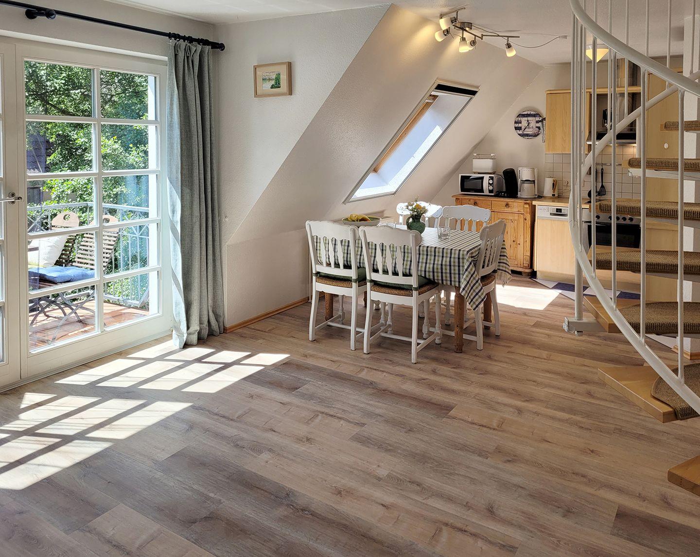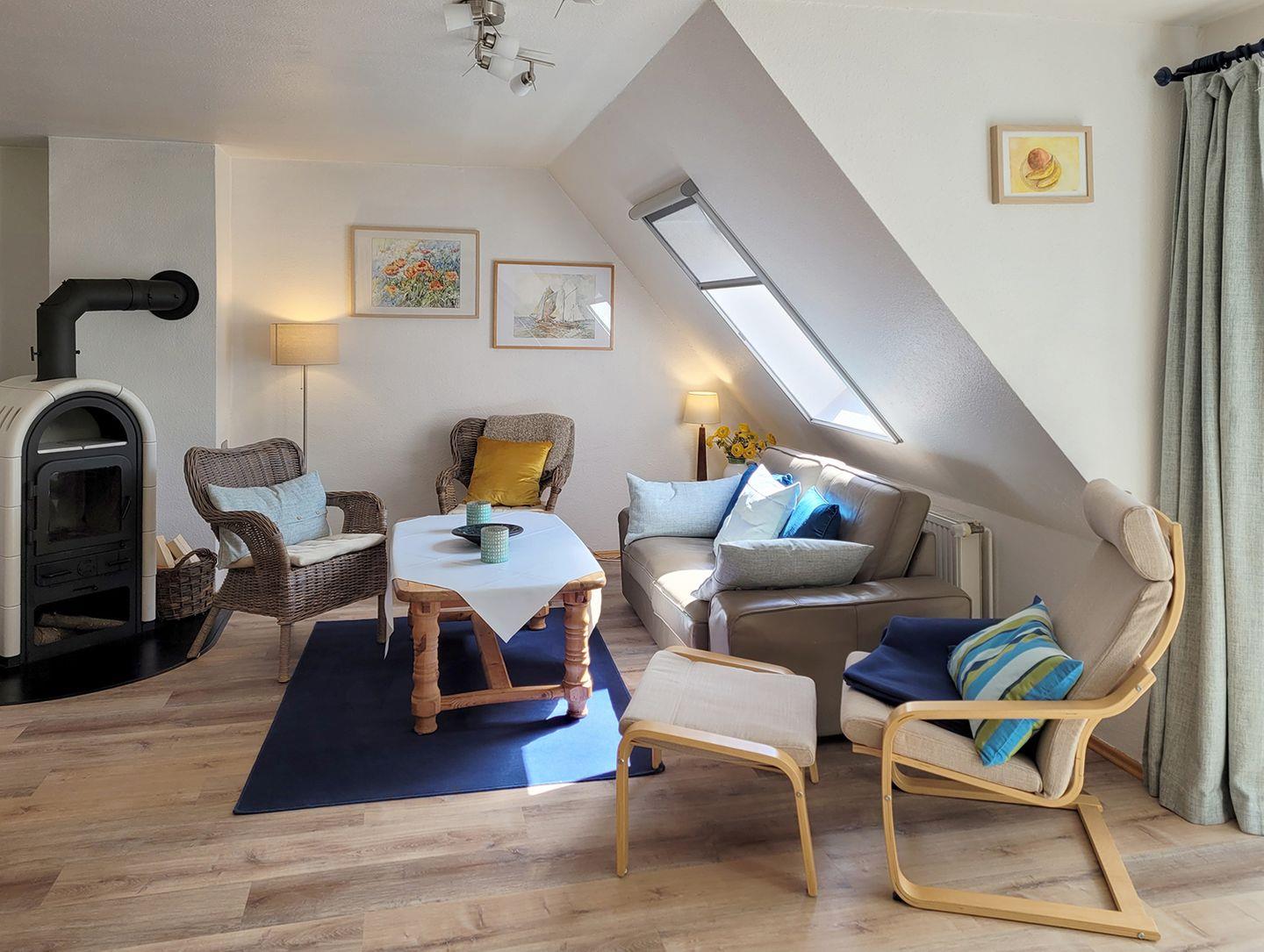 Im Obergeschoss erwartet Sie ein gemütlicher Wohnbereich mit Sitzgarnitur und Kaminofen, der für wohlige Wärme sorgt. Der Flachbild-SAT-TV bietet Unterhaltung, während der Essbereich für fünf Personen zu gemeinsamen Mahlzeiten einlädt. Die offene Küche ist voll ausgestattet mit einem Kühlschrank inklusive Gefrierfach, Cerankochfeld, Backofen, Geschirrspüler, Kaffeemaschine, Senseo-Maschine, Toaster, Wasserkocher und Mikrowelle – hier können Sie Ihre Lieblingsgerichte problemlos zubereiten. Das Duschbad im Obergeschoss ist mit einem WC und Waschbecken ausgestattet.