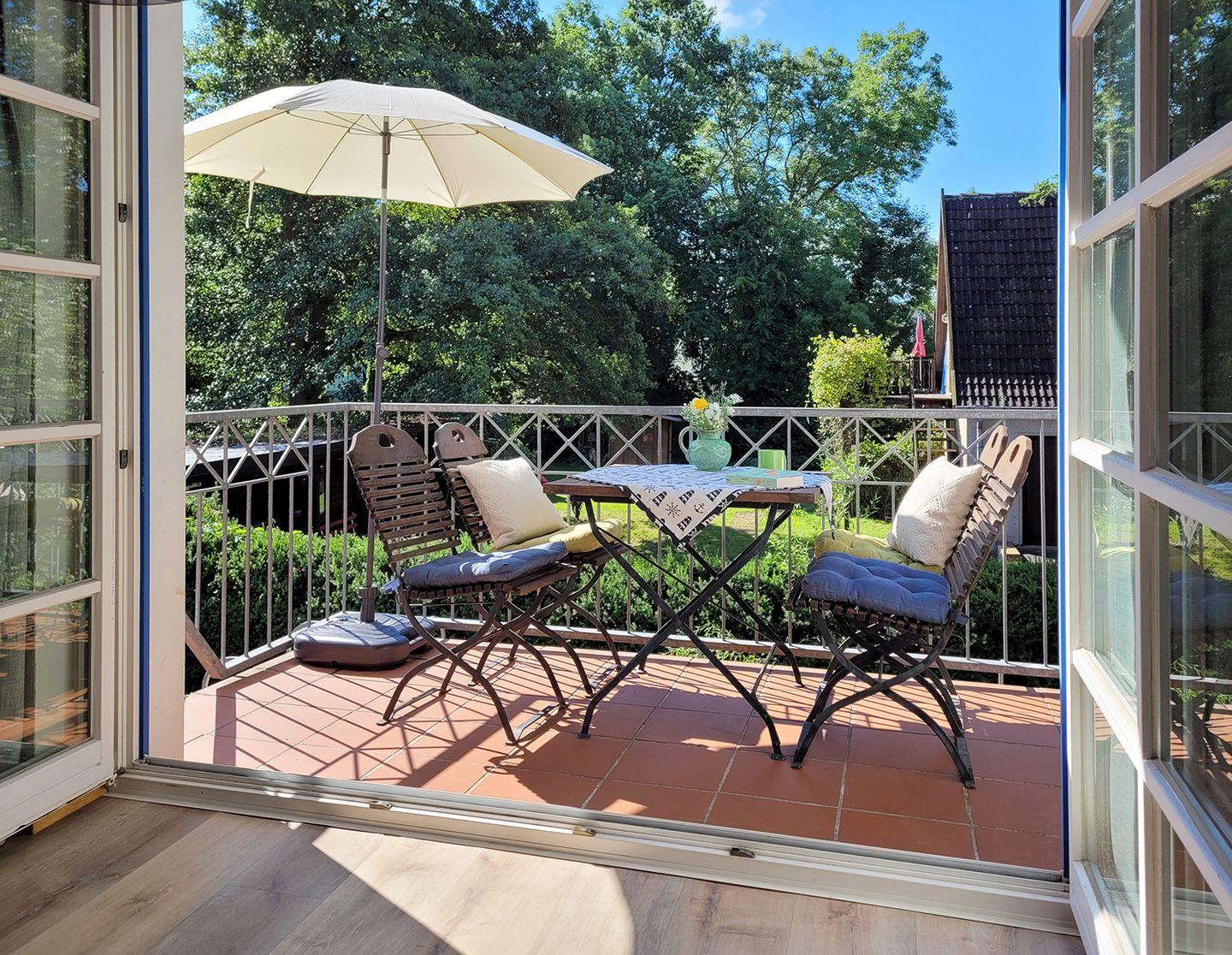 Der möblierte Südbalkon lädt zum Entspannen im Freien ein. Fahrräder können sicher im Fahrradschuppen untergestellt werden und für Ihr Auto steht ein PKW-Stellplatz zur Verfügung. Bettwäsche kann für 12 € und Handtücher für 8 € pro Set gemietet werden. Kostenfreies WLAN ist verfügbar und Haustiere sind auf Anfrage gestattet.