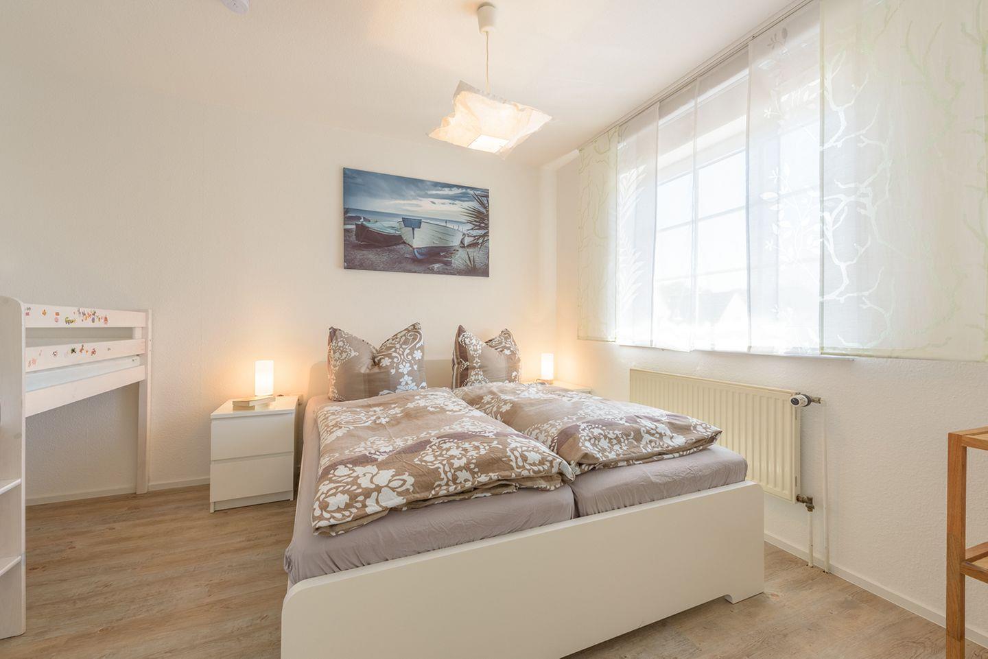 Im Schlafzimmer befinden sich ein großes Doppelbett (180 x 200 cm) und ein Kinderhochbett (140 x 70 cm), das ideal für ein jüngeres Kind geeignet ist. Vom gemeinschaftlichen Garten aus gelangen Sie auf eine eigene Terrasse, die mit Gartenmöbeln ausgestattet ist, sodass Sie auch draußen entspannen können. Für Ihr Auto steht Ihnen ein Parkplatz zur Verfügung und WLAN ist ebenfalls vorhanden. Haustiere sind in dieser Wohnung nicht gestattet.