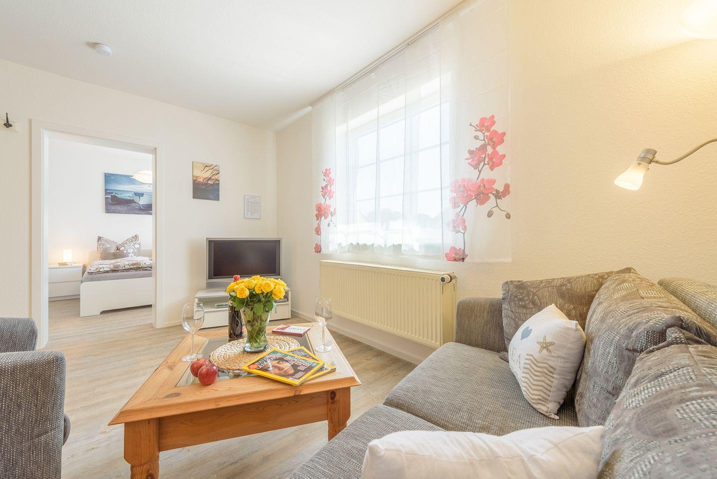 Ferienwohnung bis 2 Personen (+1 Kind bis 6 Jahre) | ca. 35 m2 Wohnfläche | 1. OG Wohnbereich mit Küchenzeile, Bad, 1 Schlafzimmer | eigene Terrasse im gemeinschaftlichen Garten inkl. Möbeln | 1 Parkplatz | Wohnbereich Sitzgarnitur mit Schlaffunktion und Sessel, Flachbild-SAT-TV, DVD-Player, Radio | Küchenzeile 2-Platten-Cerankochfeld, Backofen, Geschirrspüler, Kaffeemaschine, Toaster, Wasserkocher, Kühlschrank mit Gefrierfach, Esstisch mit vier Stühlen | Bad Dusche, WC | Schlafzimmer 1 Doppelbett (180 x 200 cm) und 1 Kinderhochbett (140 x 70 cm), WLAN vorhanden