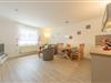 Die angrenzende Küchenzeile ist funktional mit einem 2-Platten-Cerankochfeld, Backofen, Geschirrspüler, Kaffeemaschine, Toaster, Wasserkocher sowie einem Kühlschrank mit Gefrierfach ausgestattet. Ein Esstisch mit vier Stühlen rundet die Ausstattung ab.