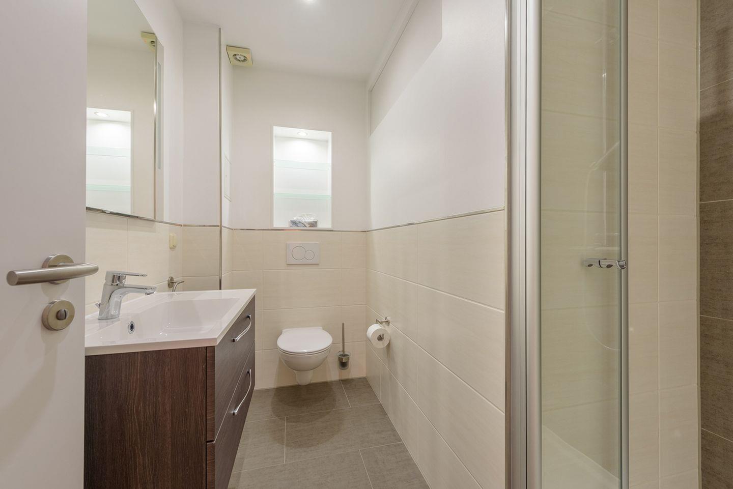 Das Badezimmer ist mit einer Dusche, WC und Waschbecken ausgestattet.