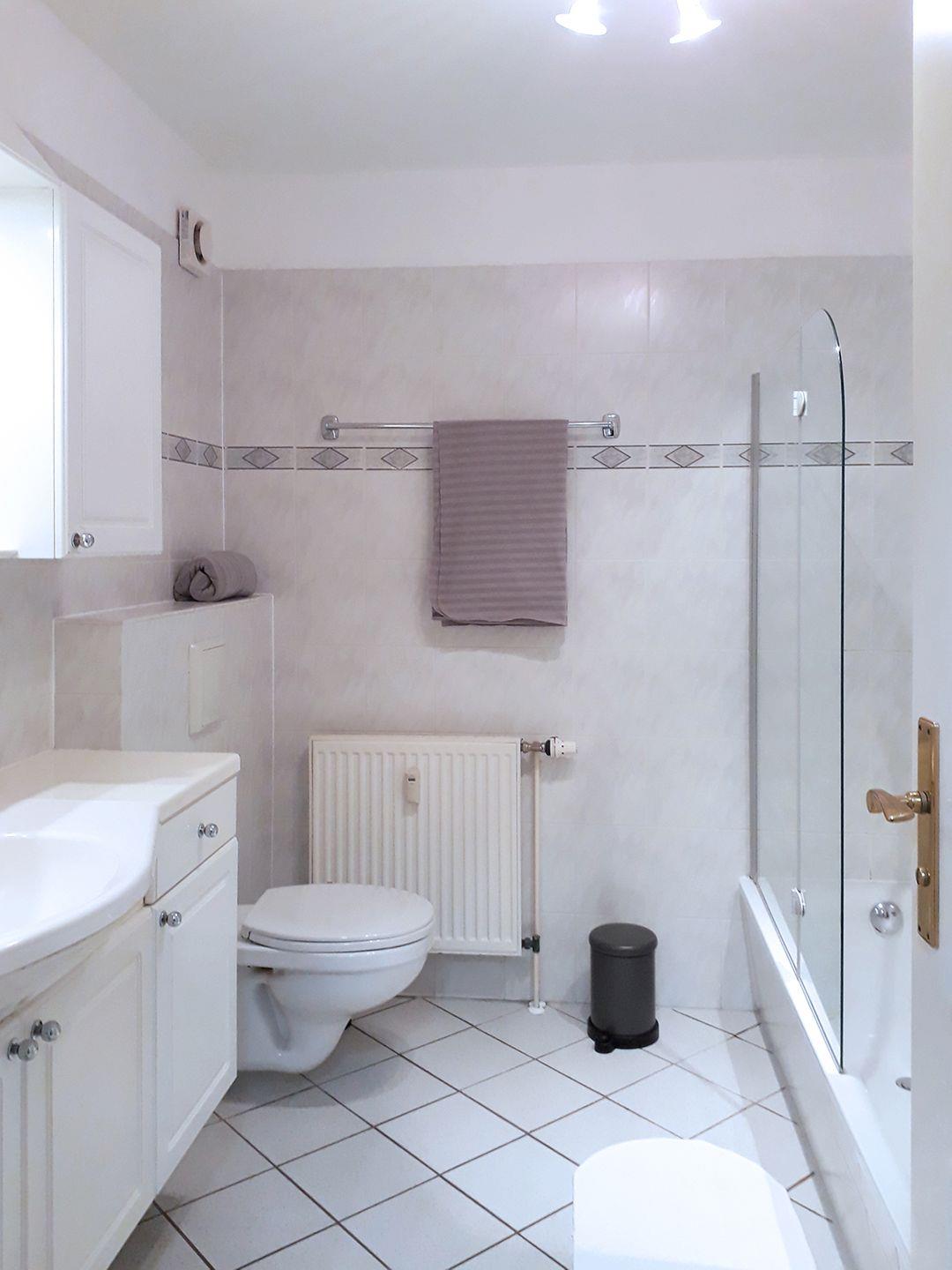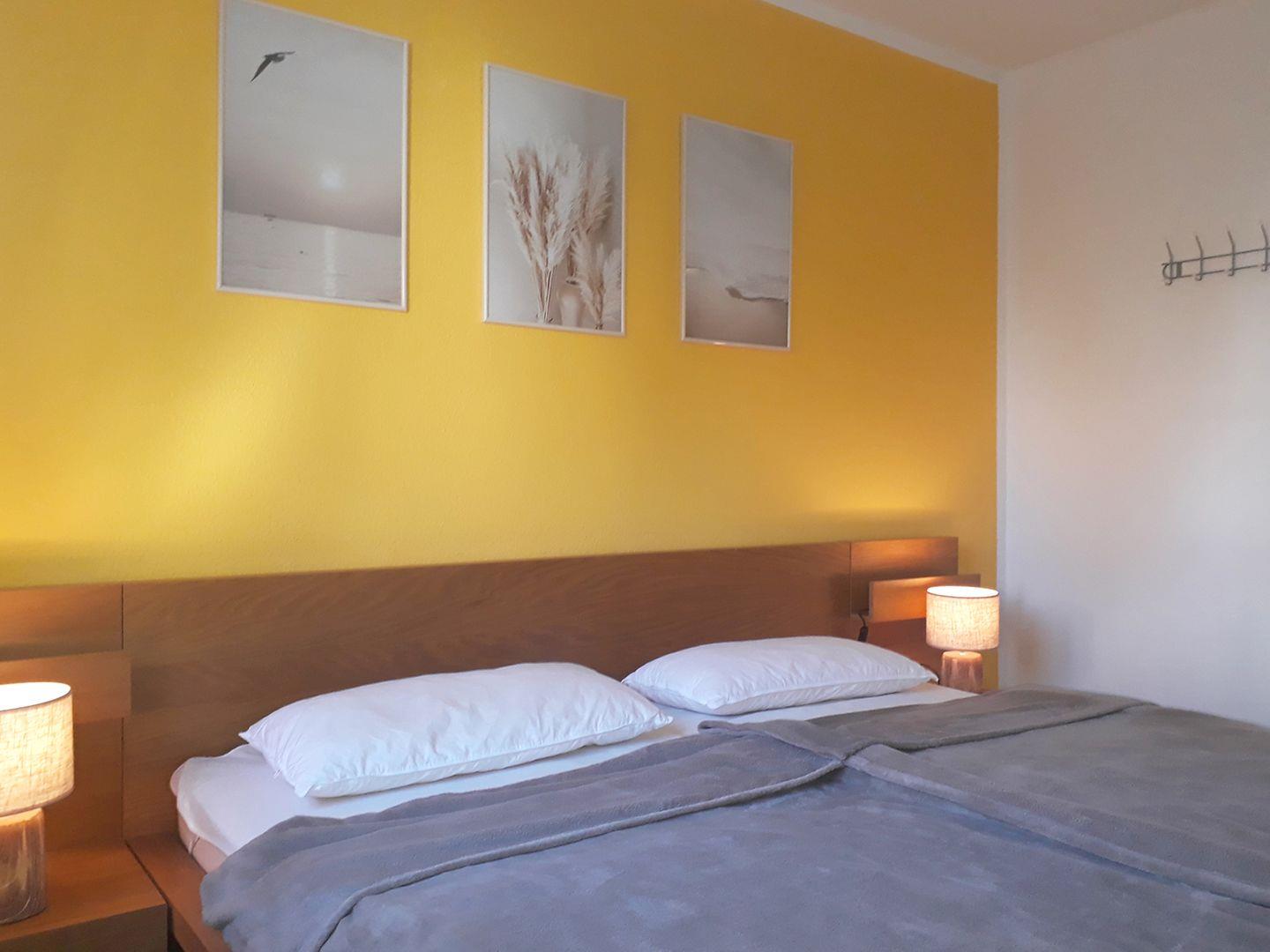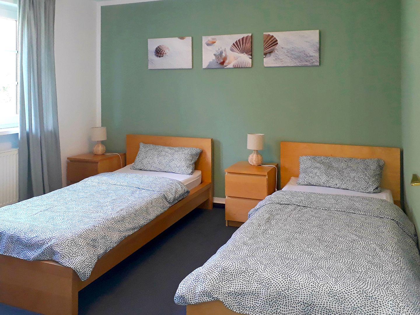 Es gibt zwei Schlafzimmer: Eines mit einem Doppelbett (180 x 200 cm) und eines mit zwei Einzelbetten (90 x 200 cm). Zusätzlich stehen ein Gäste-WC und ein Badezimmer mit Badewanne (mit Duschabtrennung) und WC zur Verfügung.