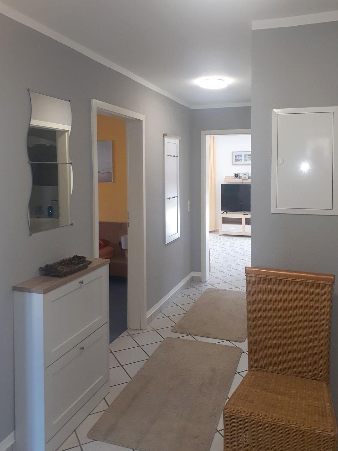 Küchenzeile (Backofen, Geschirrspüler, Herd, Kaffeemaschine, Kühlschrank mit Gefrierfach, Toaster, Wasserkocher) mit Esstisch | 2 Schlafzimmer: SZ 1 mit einem Doppelbett (180x200 cm) , SZ 2 mit zwei Einzelbetten (90x200 cm), Gäste-WC, Bad mit Badewanne und Duschabtrennung, WC | Süd-Terrasse | Hochstuhl, Reisebett, WLAN | ab 7 Übernachtungen ist Bettwäsche inklusive