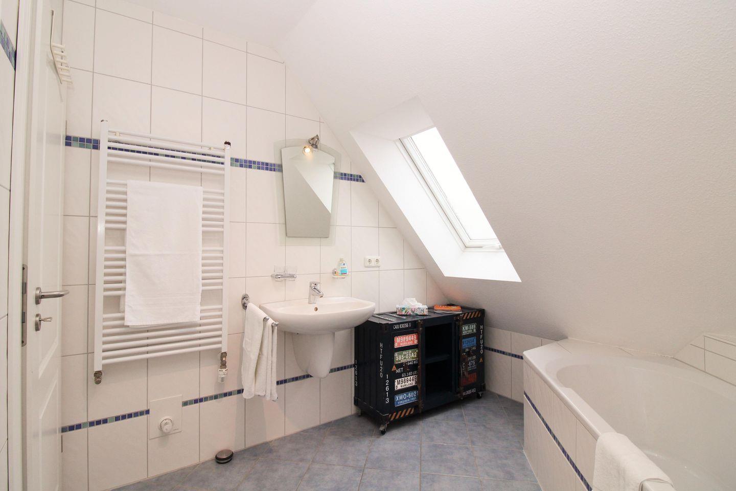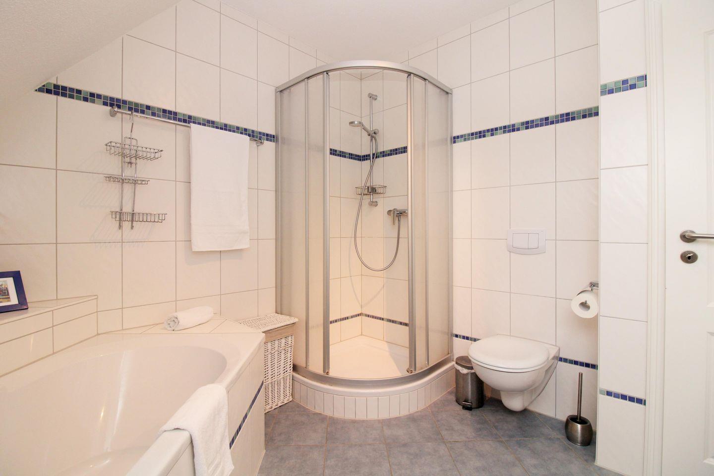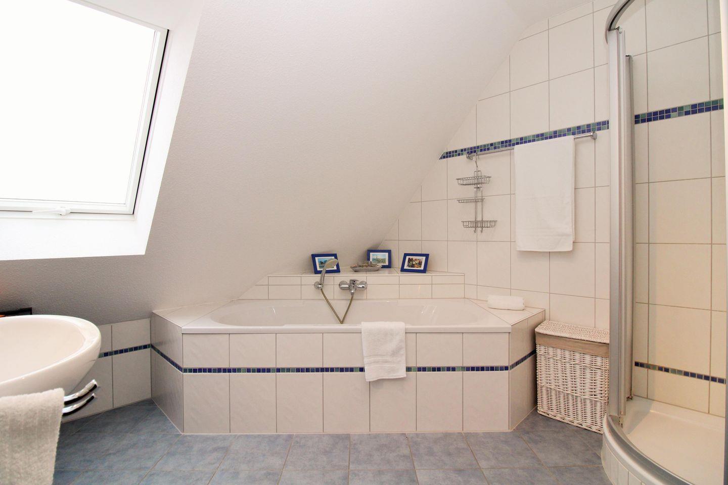 Das helle und geräumige Badezimmer (mit Tageslicht / Fenster) verfügt über eine Badewanne, eine separate Dusche, Waschbecken, WC, einen Badezimmerschrank mit ausreichend Ablagemöglichkeiten sowie einen Handtuch-Heizkörper.