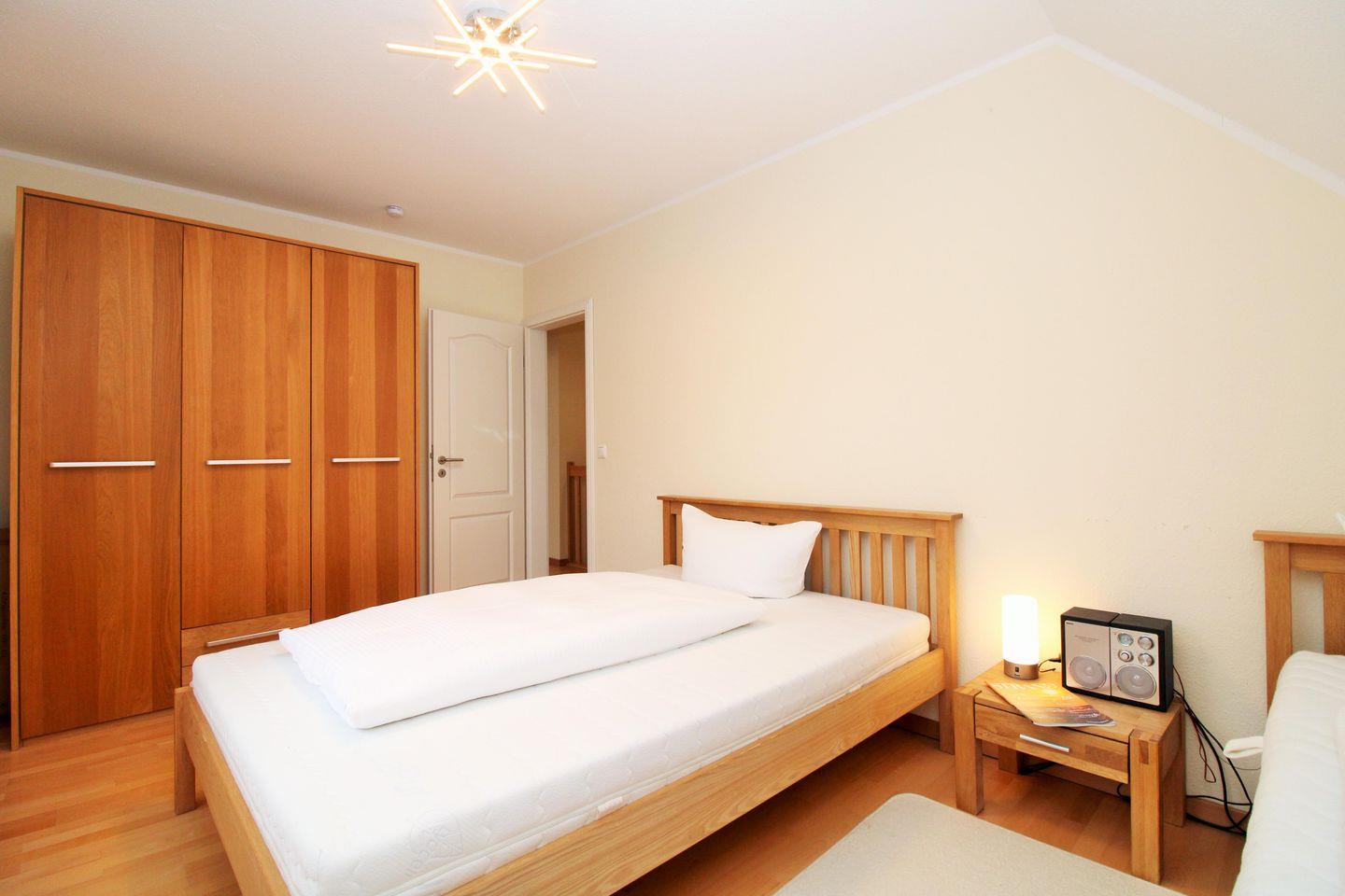 Das freundliche 2. Schlafzimmer verfügt ebenfalls über ein Doppelbett, zusätzlich ein freistehendes Einzelbett, einen Nachttisch sowie einen geräumigen Kleiderschrank.