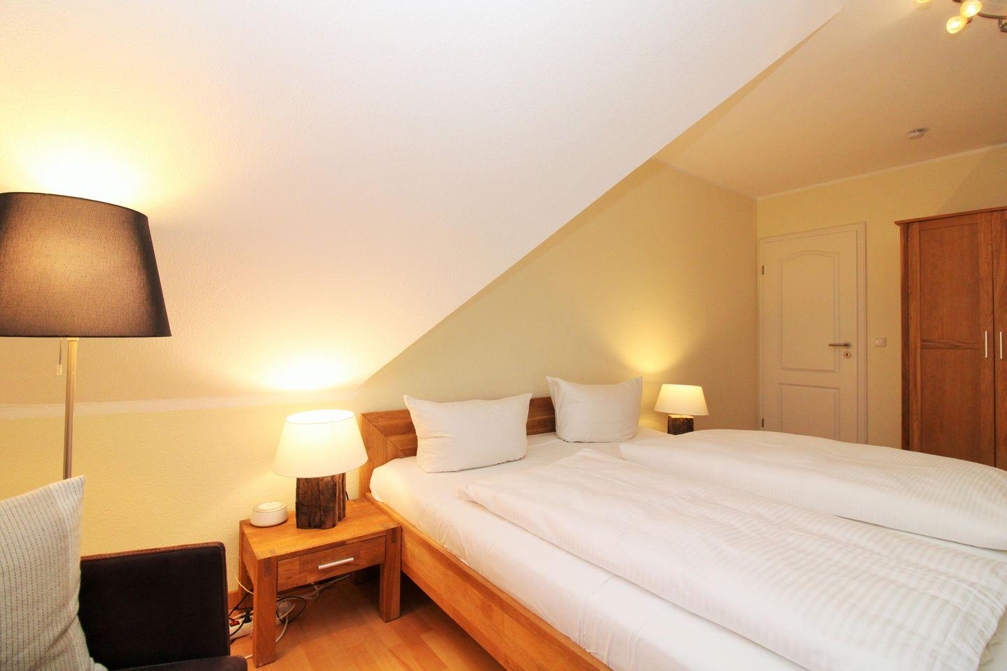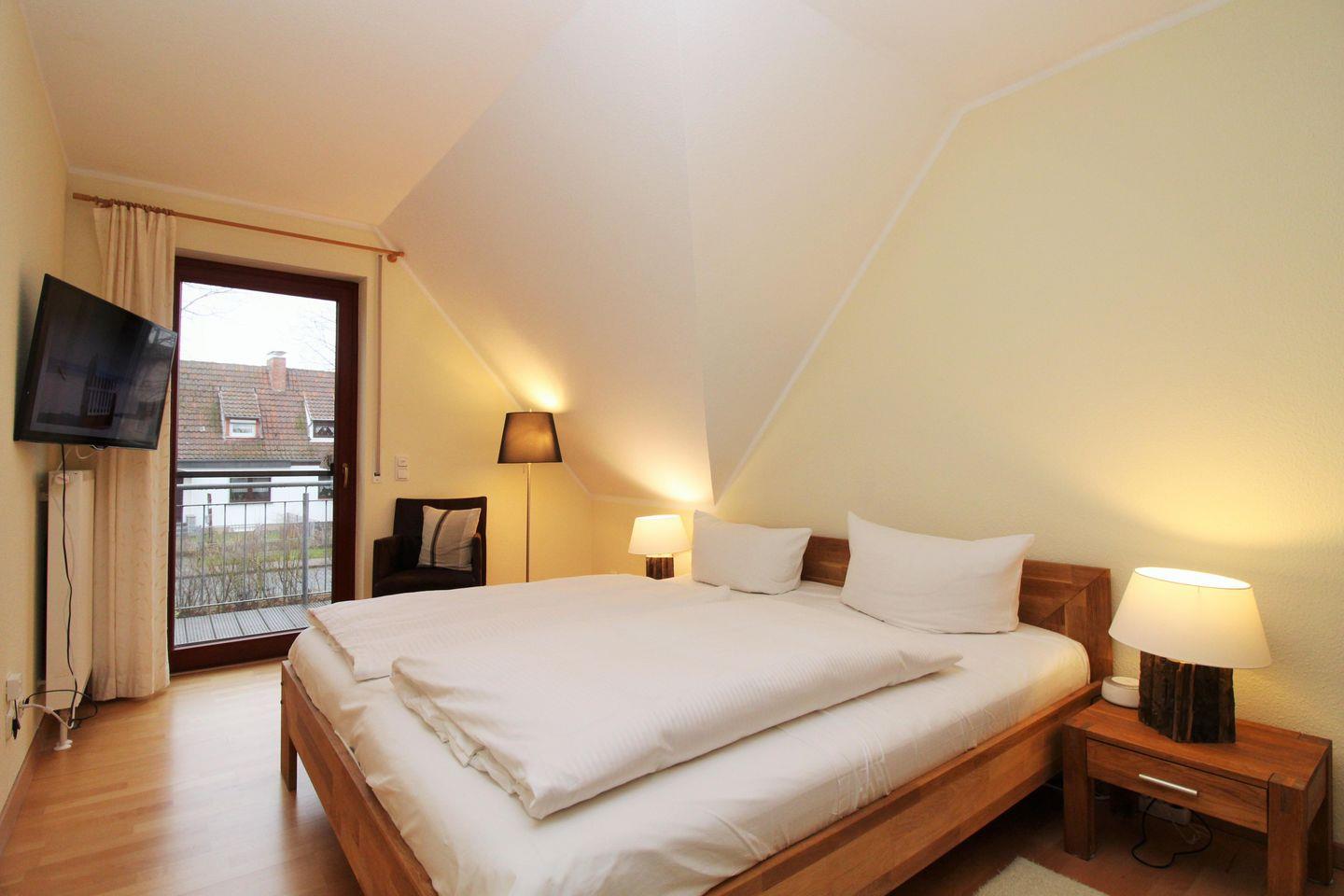 Das gemütliche 1. Schlafzimmer ist mit einem bequemen Doppelbett, Nachttischen, einem Sessel sowie einem geräumigen Kleiderschrank eingerichtet und hat direkten Zugang zu einem eigenen ca. 6 m² großen und nach Süd-Westen ausgerichteten Balkon mit Balkonmöbeln. Darüber hinaus steht Ihnen hier ein zusätzliches TV-Gerät zur Verfügung.