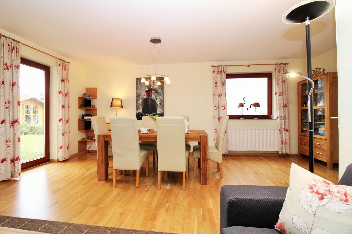 Das moderne und gemütliche Wohn-/Esszimmer verfügt über eine separate Sitzgruppe mit großer und bequemer Eckcouch, Relax-Sessel mit Hocker, Couchtisch, einen separaten Esstisch mit 6 Stühlen, einen Schrank, ein Sideboard sowie verschiedene Regale. Vom Wohnzimmer aus haben Sie direkten Zugang zu der ca. 12 m² großen und sonnigen sowie teilweise überdachten Terrasse (nach Süd-Westen ausgerichtet) mit Sitzbank, Tisch und Gartenmöbeln. Hier sitzen Sie entspannt und gemütlich im Grünen und können abends bei einem guten Glas Wein in Ruhe die lauen Sommernächte genießen!