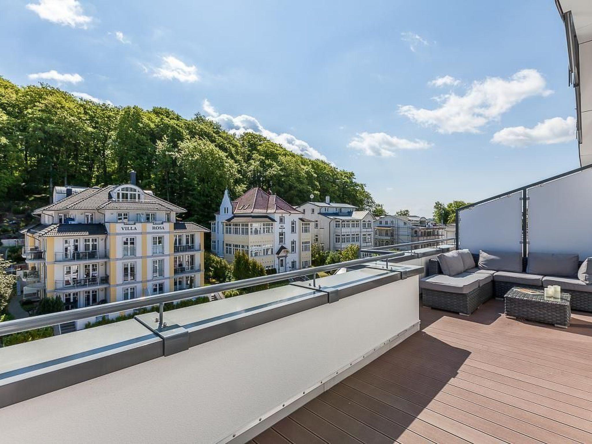 On the large, wrap-around balcony there is, among other things, an elegant lounge seating area, from here there is a great view over Wilhelmstrasse to the sea, which is approx. 300 metres away, as well as the surrounding forests and villas.
