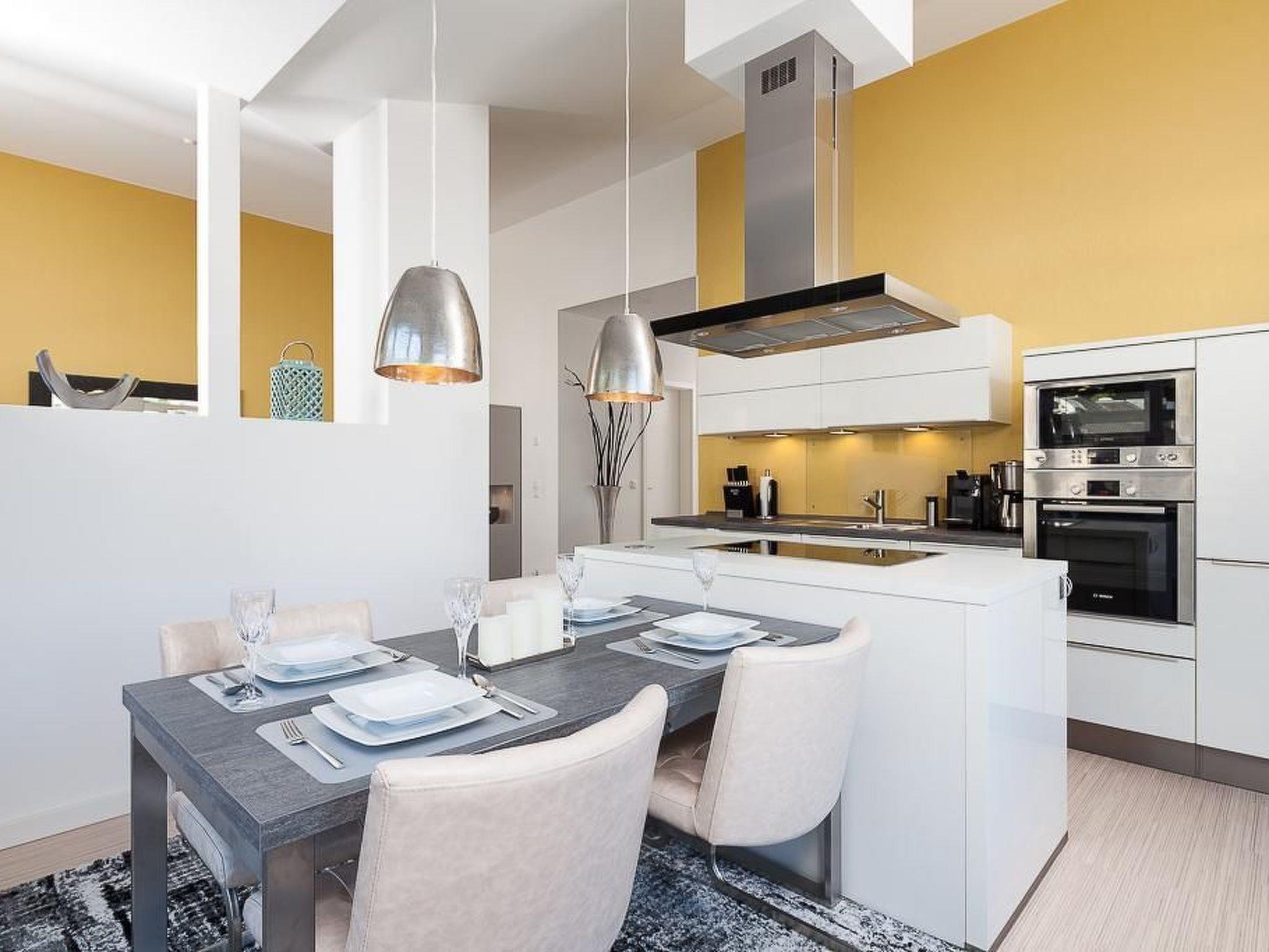 Furnished throughout with parquet flooring, the penthouse flat has a spacious living/dining area, 2 bedrooms, 2 bathrooms and a sauna, and each bedroom has been tastefully furnished with flat-screen TVs (Philips Ambilight), high-quality double beds and quality furniture. Both bathrooms have real glass showers, high-quality sanitary ceramics and elegant fittings, while the living room offers a light-flooded and spacious feel thanks to its high ceilings, wraparound windows and open-plan architecture. The living/dining area is tastefully furnished with exclusive seating (Rolf Benz, KOINOR) and high-quality accessories, while the designer kitchen with its high-quality equipment and cooking island is a real pleasure to cook in. Self-catering is really fun here. The sauna in the flat can be used free of charge and ensures pure relaxation and recreation, not only in the winter months. An underground parking space is also available at no extra charge.