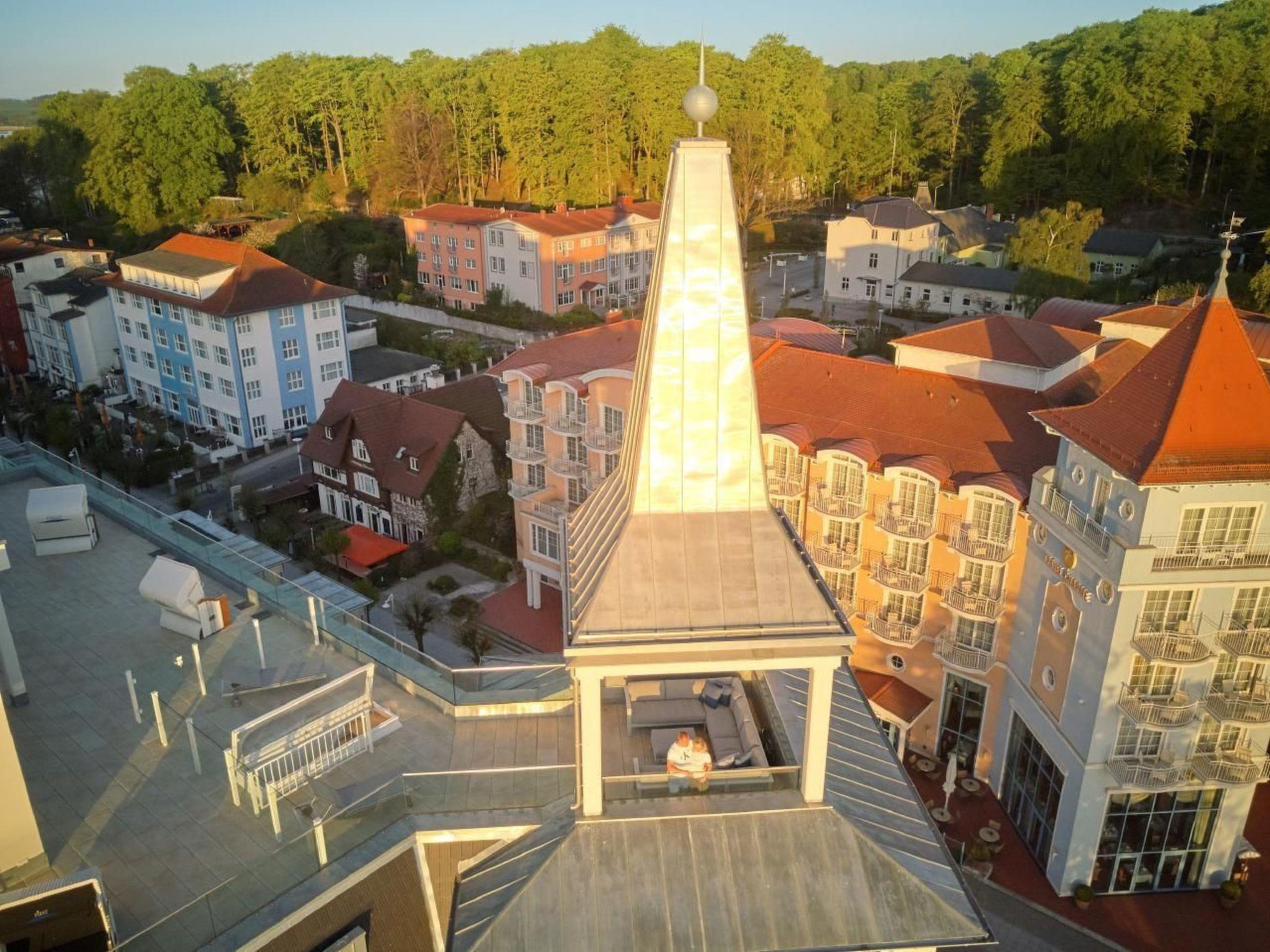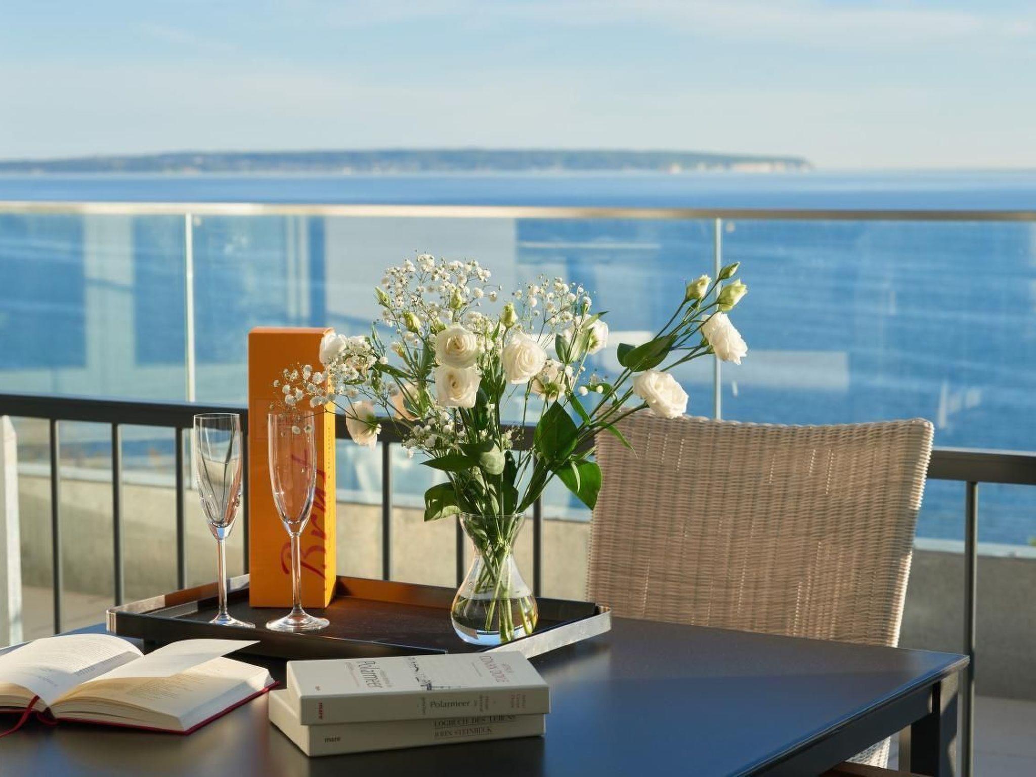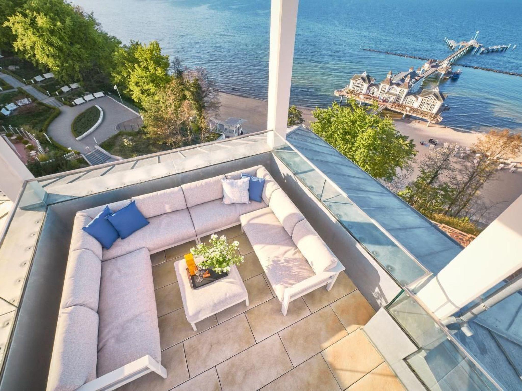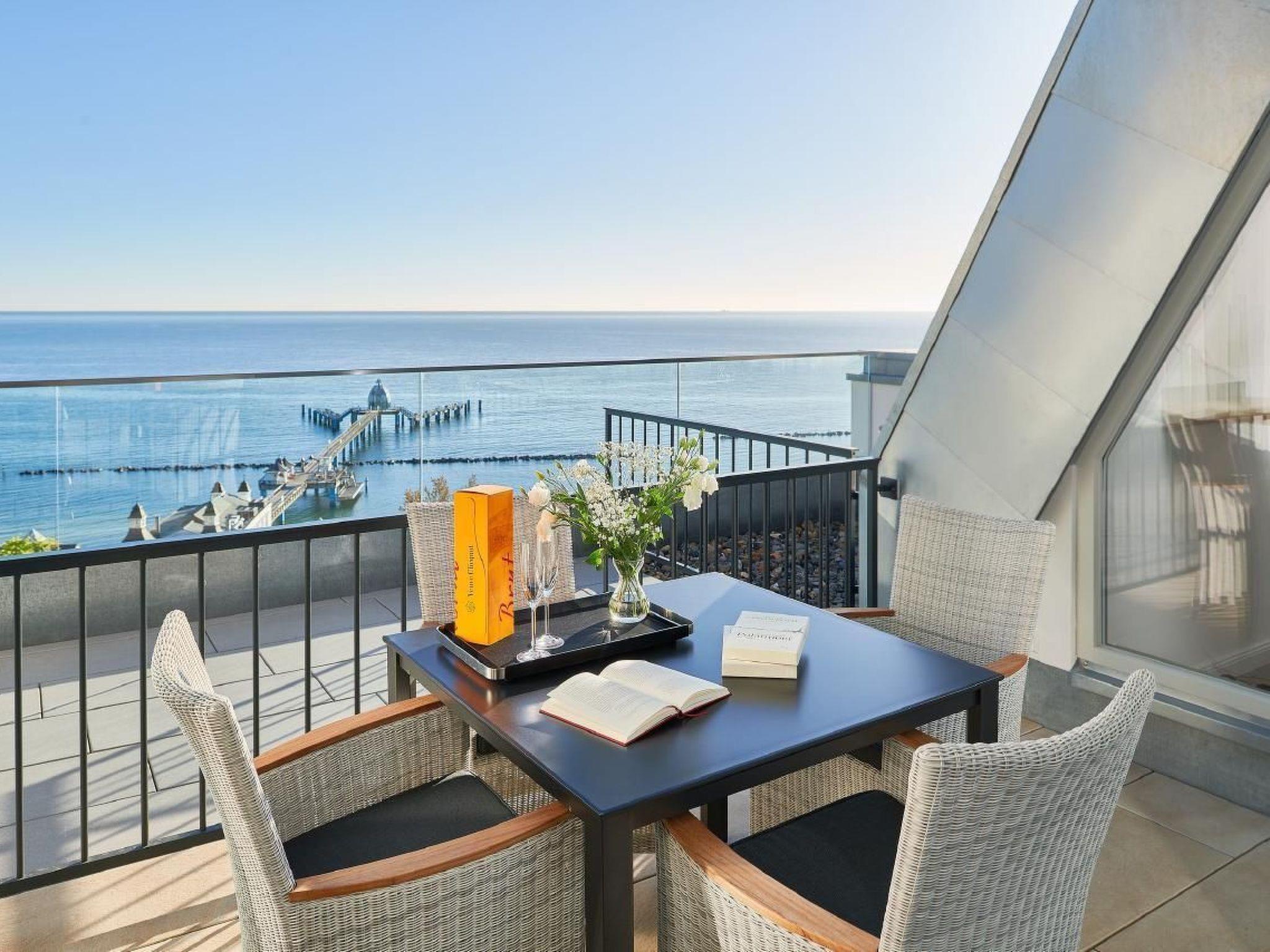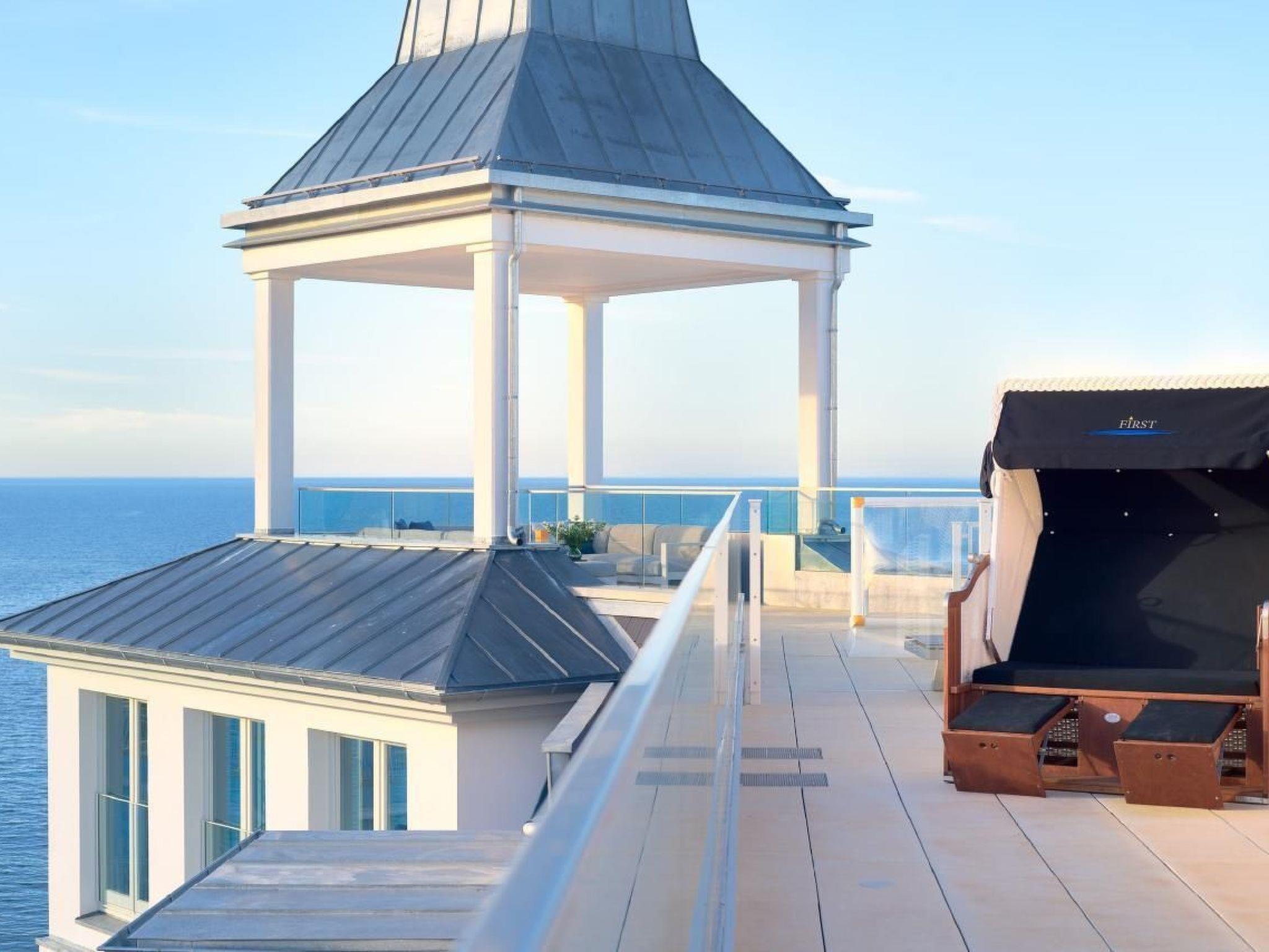 The outdoor area is equally impressive and invites you to linger. Enjoy exclusive access to your own roof terrace, which offers 40 m² of space for unrivalled views over the Baltic Sea and the island of Rügen. The terrace, furnished with comfortable lounge furniture, is the perfect place to enjoy the sunset with a glass of wine. Guests also have access to a shared rooftop sky pool with views of the Baltic Sea and a shared outdoor pool as well as various leisure facilities to round off their stay.