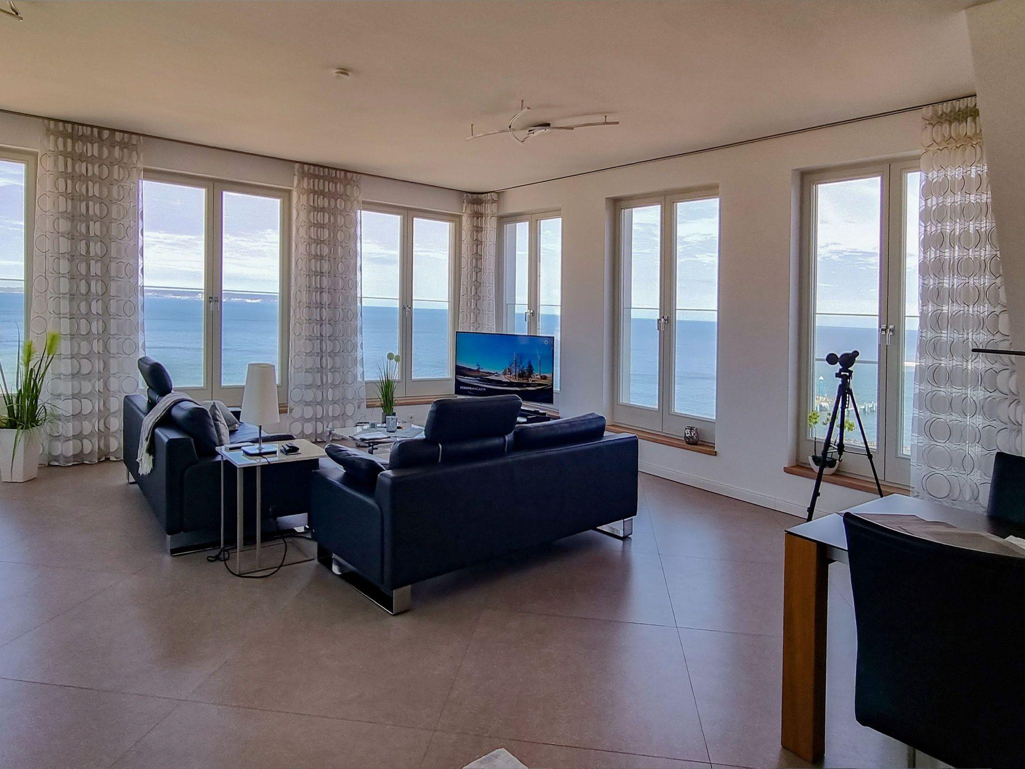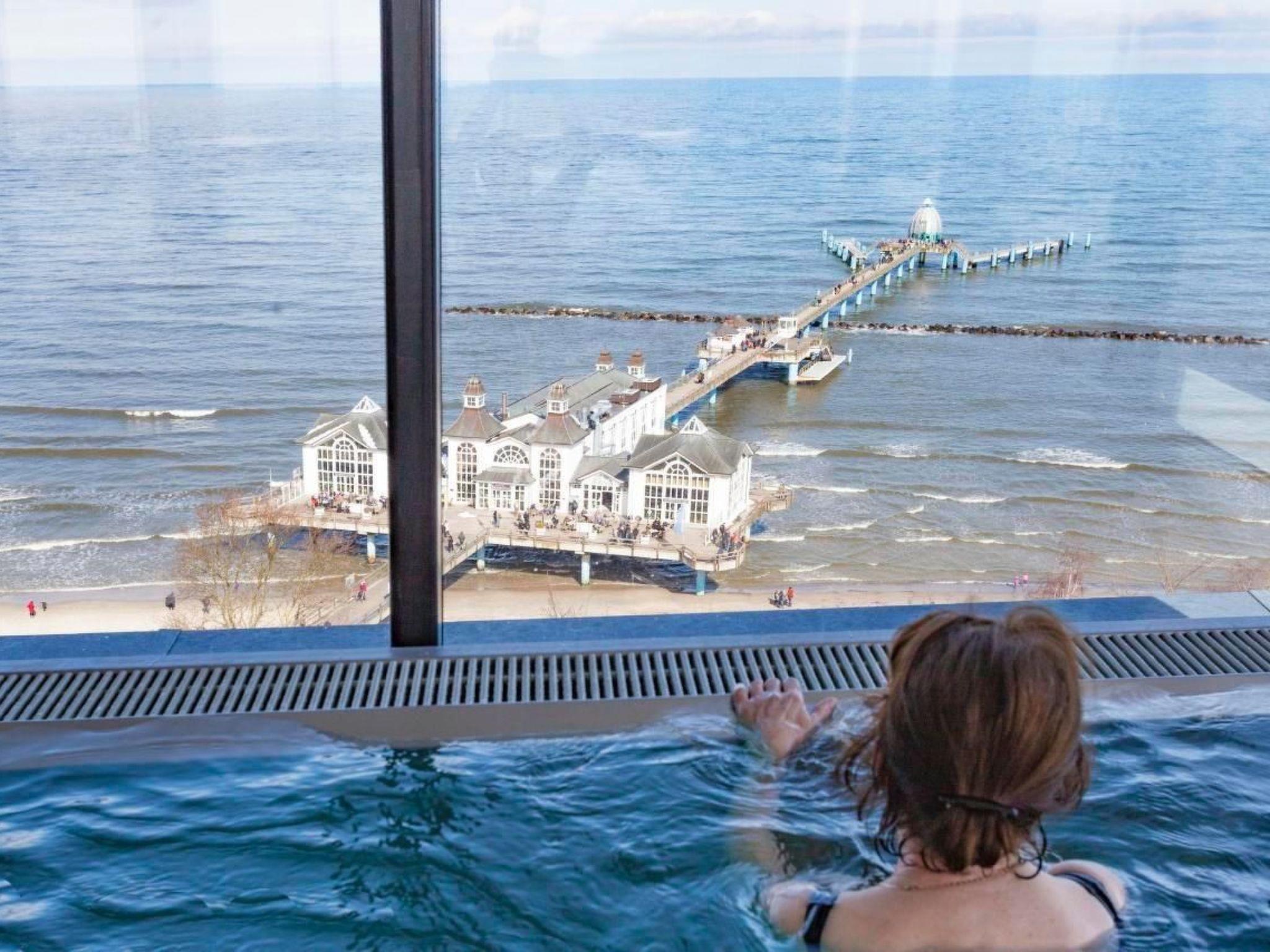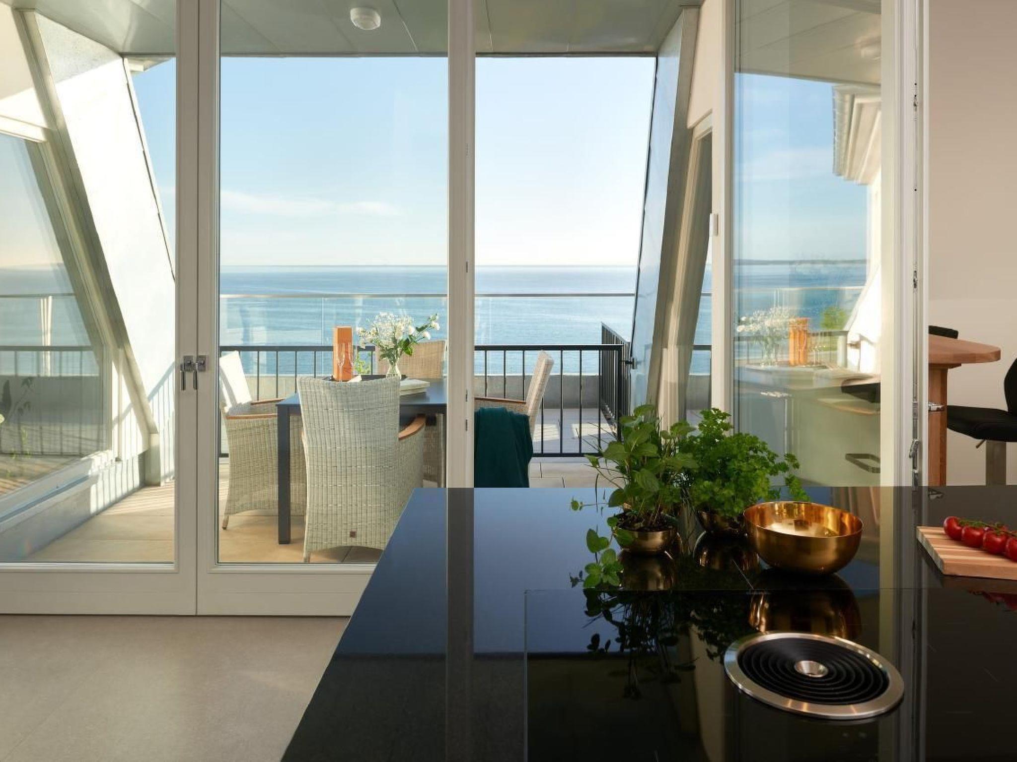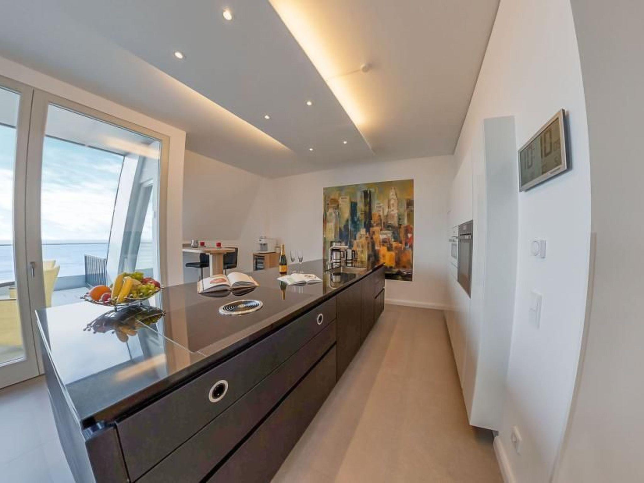 The outdoor area is equally impressive and invites you to linger. Enjoy exclusive access to your own roof terrace, which offers 40 m² of space for unrivalled views over the Baltic Sea and the island of Rügen. The terrace, furnished with comfortable lounge furniture, is the perfect place to enjoy the sunset with a glass of wine. Guests also have access to a shared rooftop sky pool with views of the Baltic Sea and a shared outdoor pool as well as various leisure facilities to round off their stay.