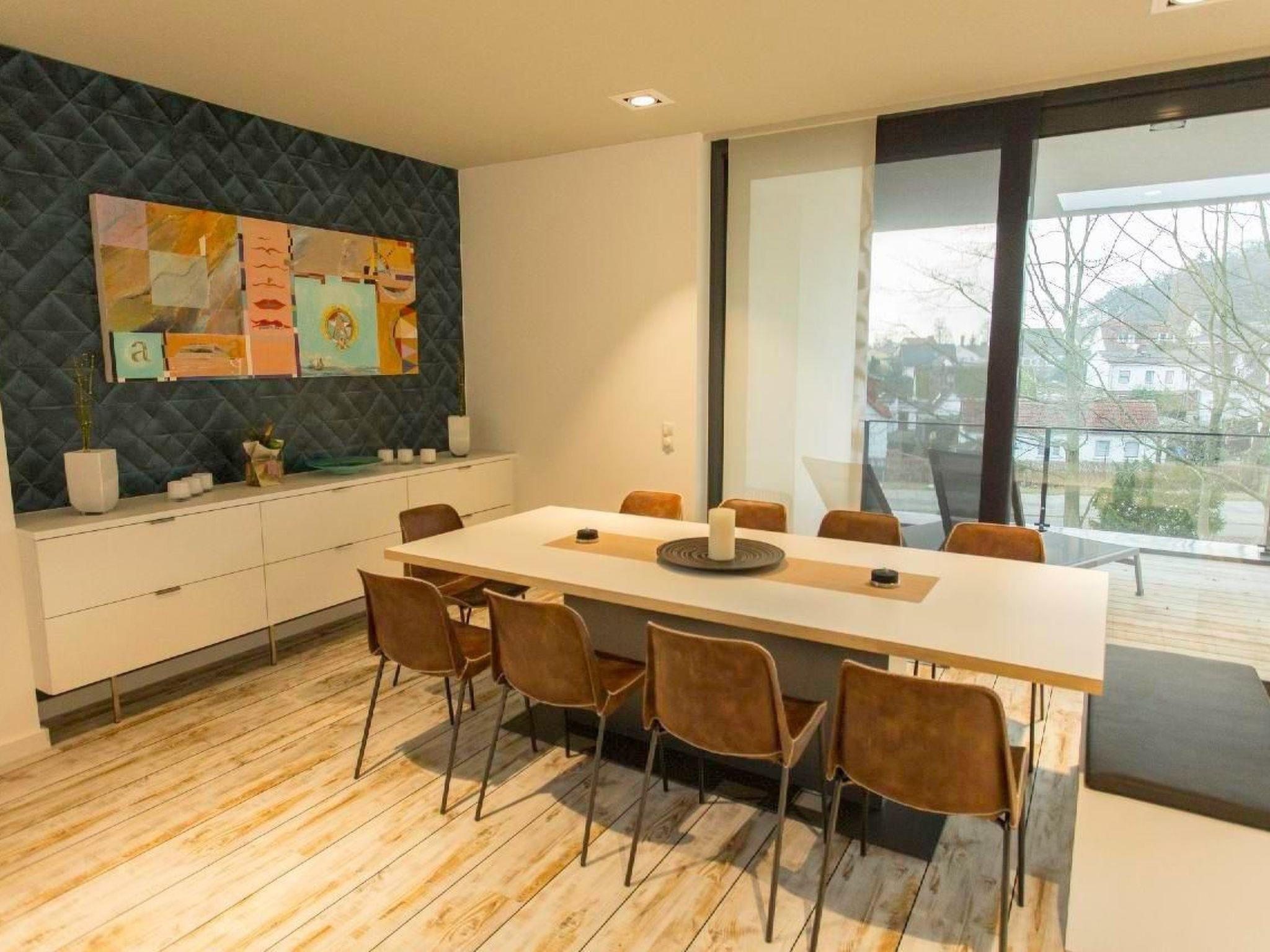 On the upper floor is the generously proportioned comfort kitchen with a kitchen block of over 4 metres, equipped with a Nespresso coffee machine and a filter coffee machine, a combi-steamer/microwave/stove combination, an induction cooker with 8 hobs, dishwasher, toaster, kettle and a fridge/freezer. The kitchen can seat up to 12 people at the dining table. The living area is equipped with a TV and DVD player (including DVD collections), a stereo system with Dolby surround and a three-sided gas fireplace. Two comfortable shower rooms and a guest WC round off the exclusive impression of the flat.
