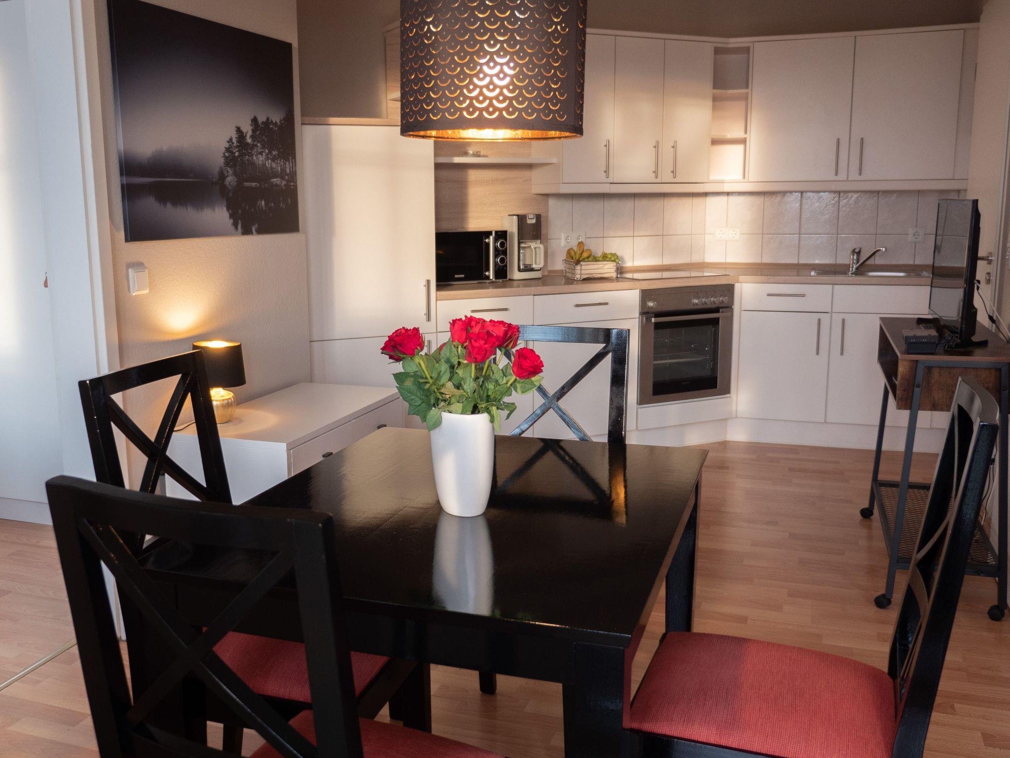 Modern eat-in kitchen, well equipped with dishwasher, microwave, oven and coffee machine.