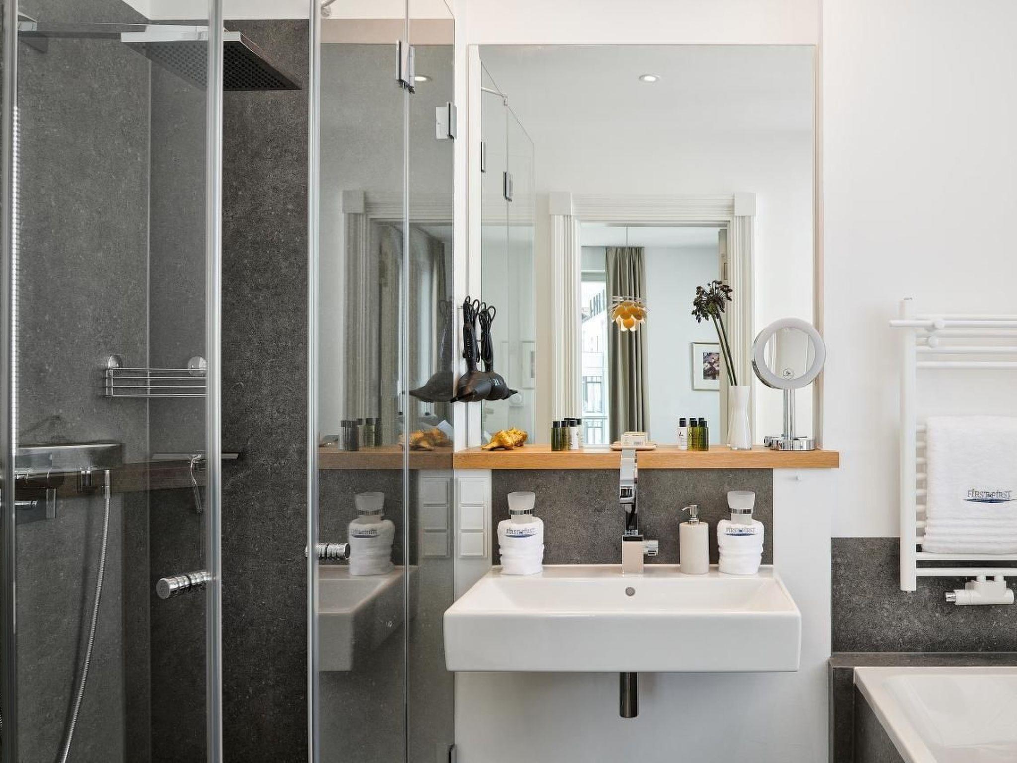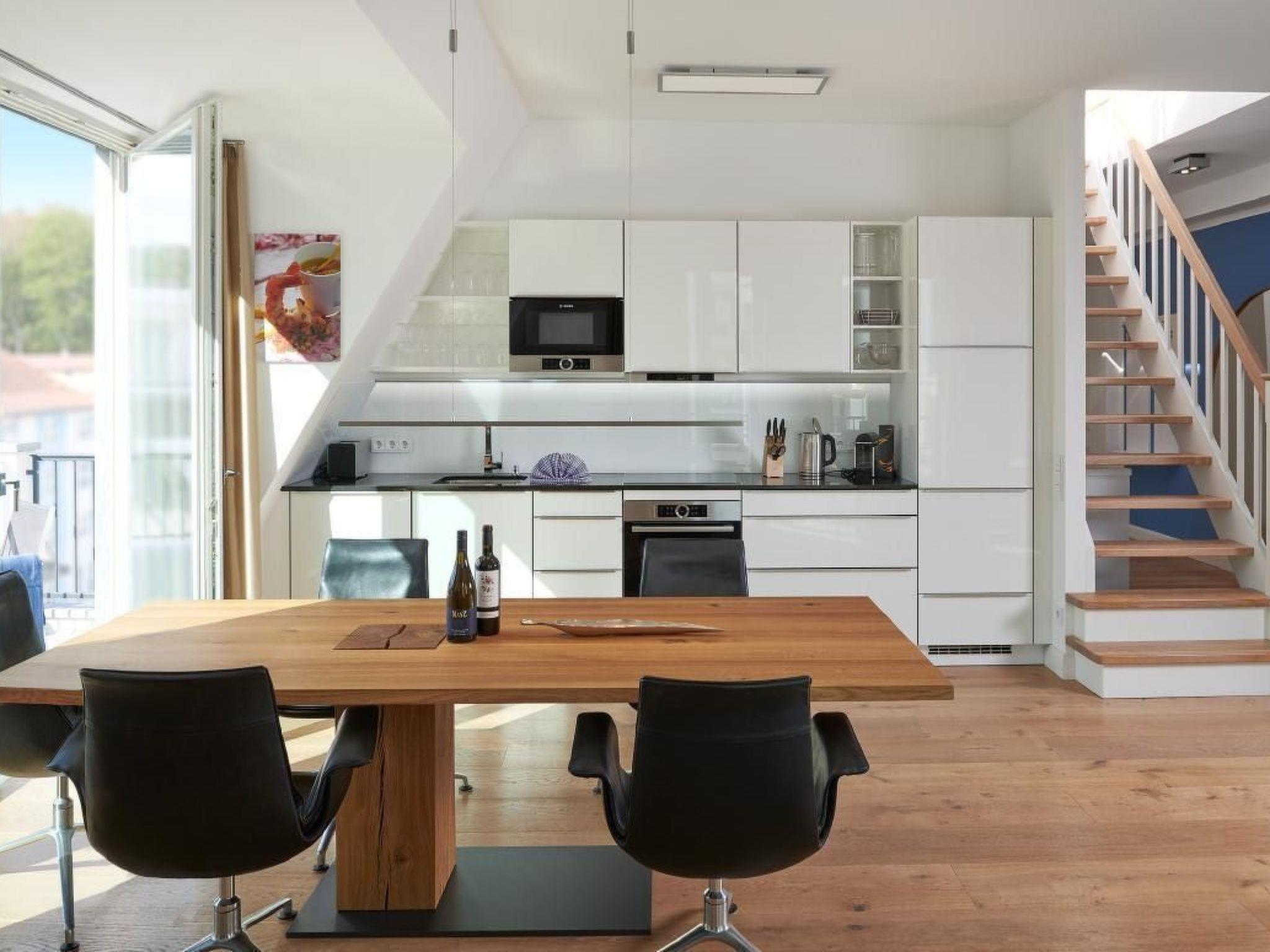 The approx. 88 m² roof terrace above the flat, which belongs to "Meerselig", offers a partially restricted view of the Baltic Sea as far as Lake Sellin and a wonderful garden in front of FIRST. A large east-facing balcony allows you to enjoy breakfast! Another south-facing balcony offers a fantastic view of the island of Rügen, Lake Sellin and the village. The indoor swimming pool and saunas can be reached via a staircase.